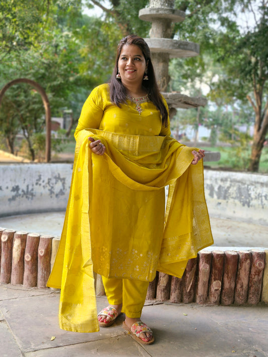 Golden Mustard Dola Silk Embroidered Three-Piece Suit with Banarasi Dupatta