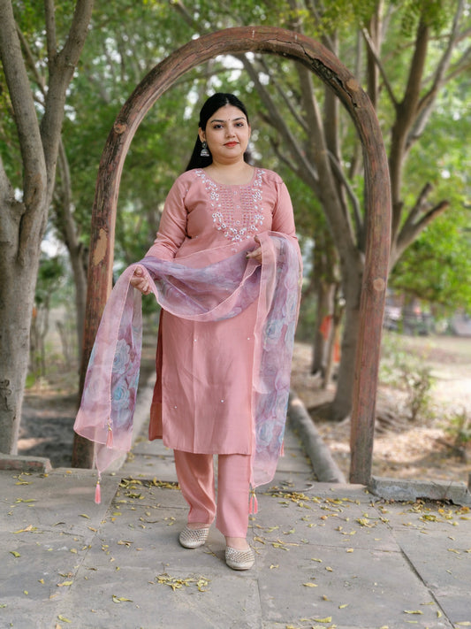 Beige Floral Soft Silk Three-Piece Suit with Stone Work