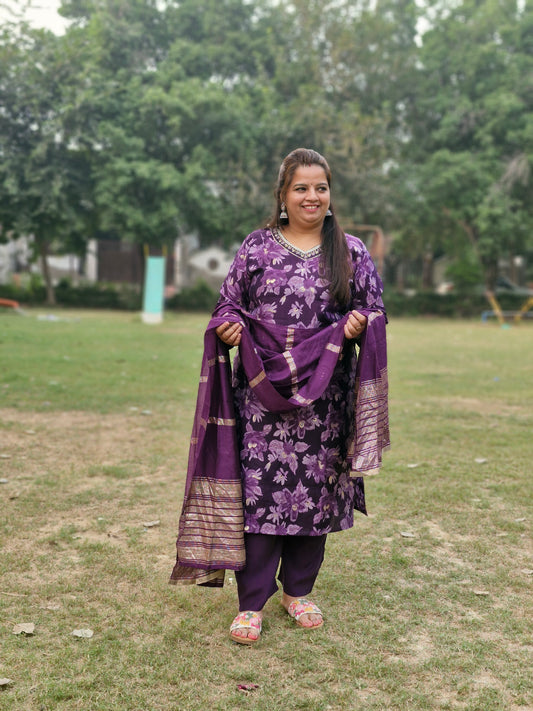 Purple Floral Muslin Three-Piece Suit with Embroidered silk Dupatta