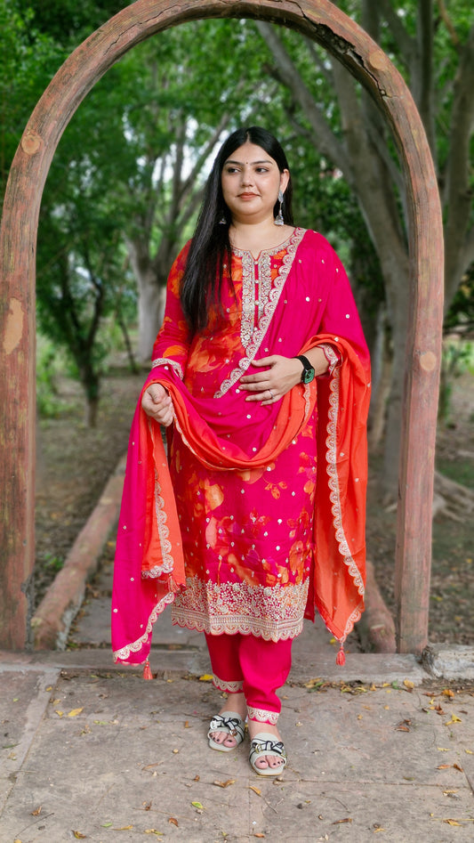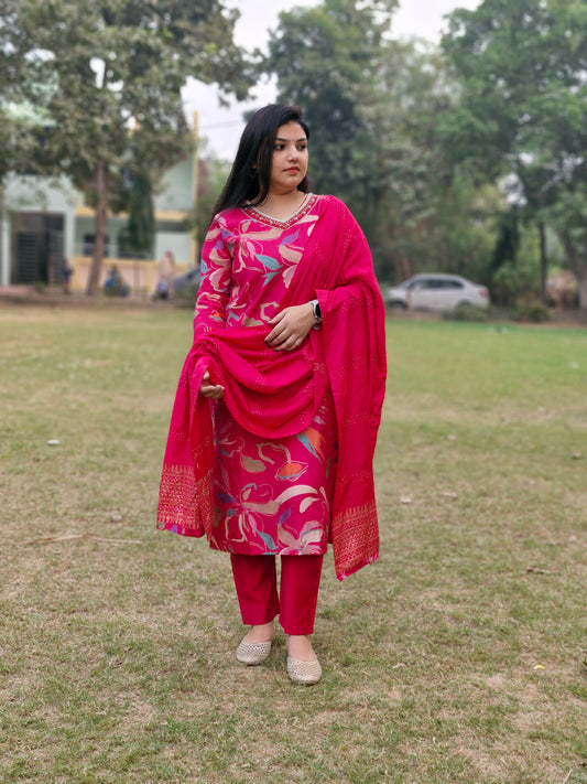 Magenta Pink Floral Muslin Three-Piece Suit with Embroidered Silk Dupatta
