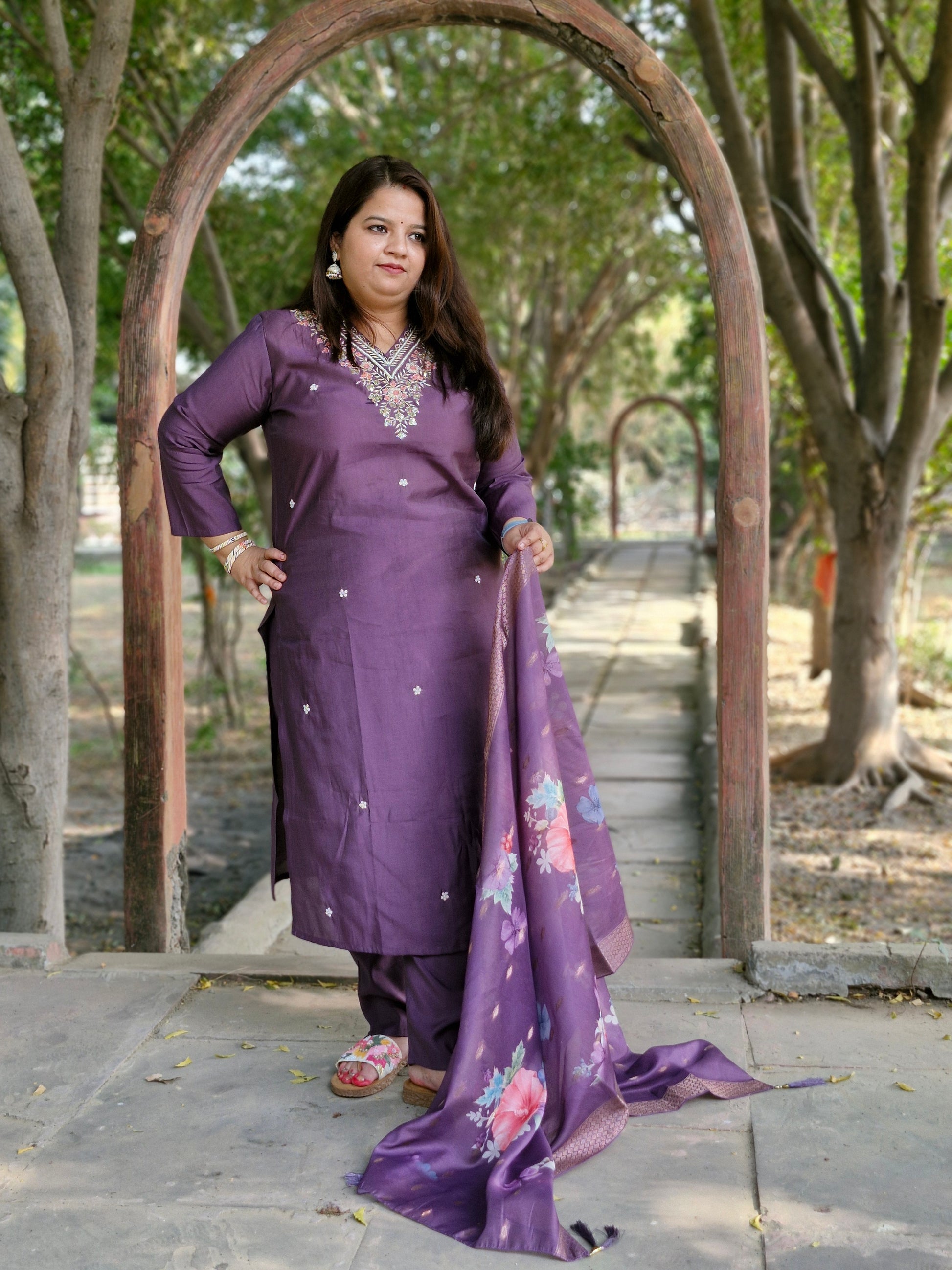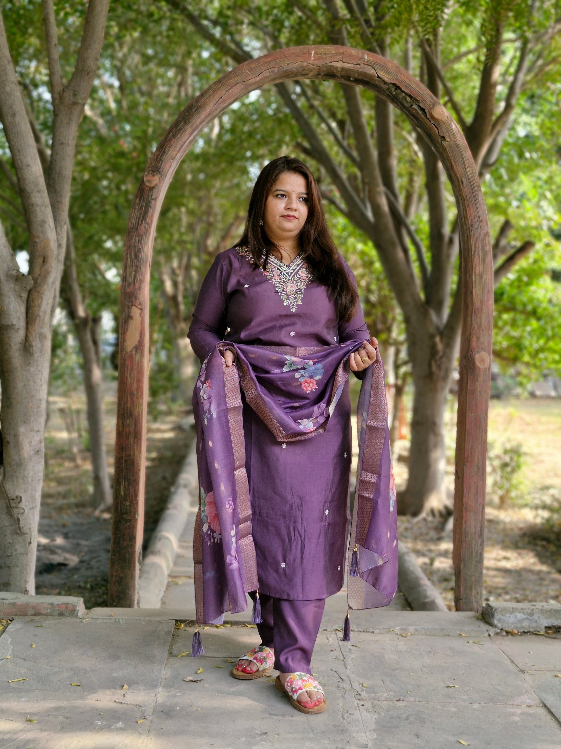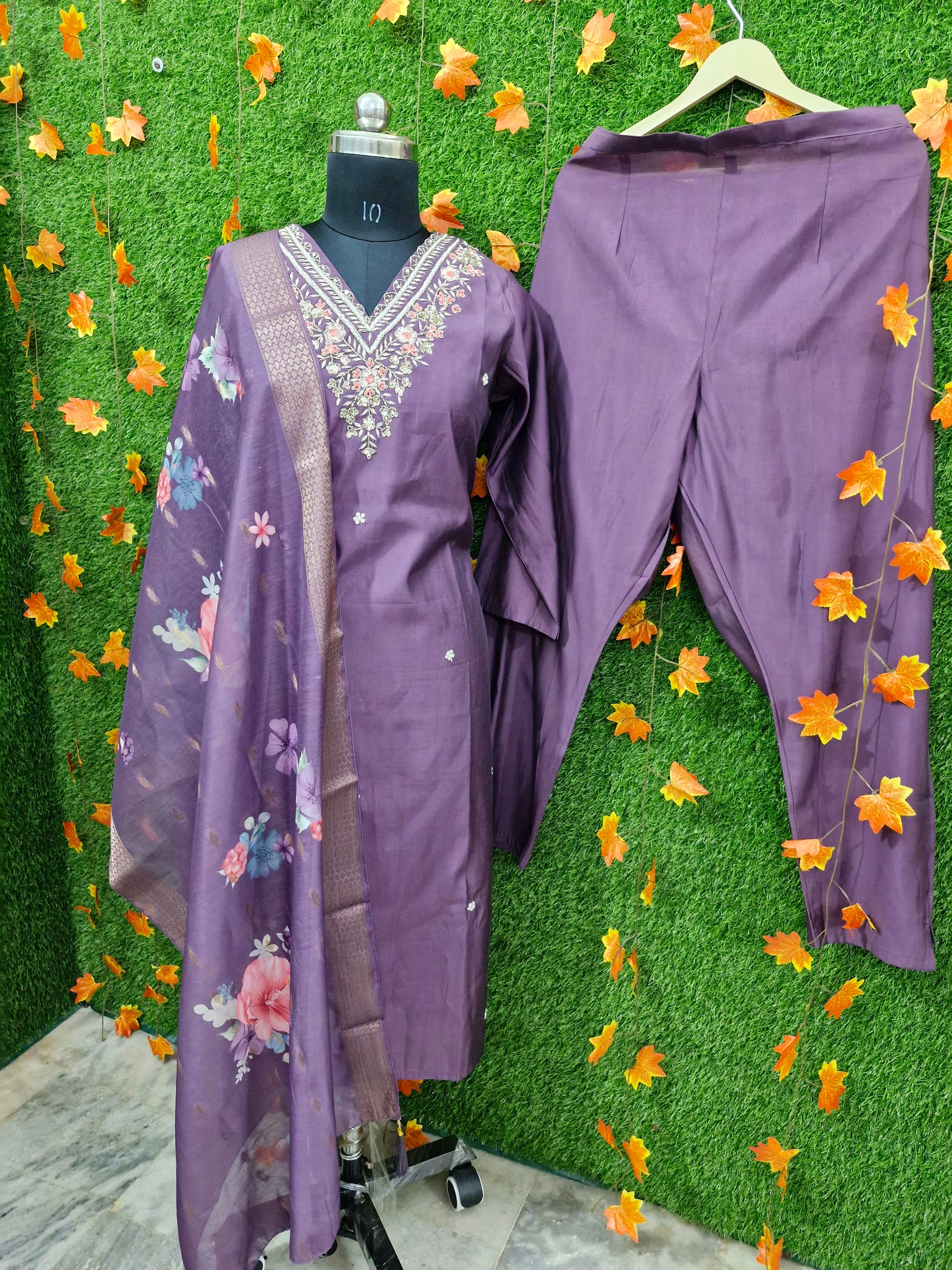 Indulge in luxury with this deep purple suit set crafted from premium Dola silk, perfect for festive and semi-formal occasions. The kameez showcases intricate floral embroidery around the neckline, giving it a rich and sophisticated look. Paired with sleek straight pants, this outfit offers a modern yet traditional appeal. The set is completed with a sheer organza dupatta, adorned with vibrant floral prints, adding a soft and graceful touch to the overall ensemble.