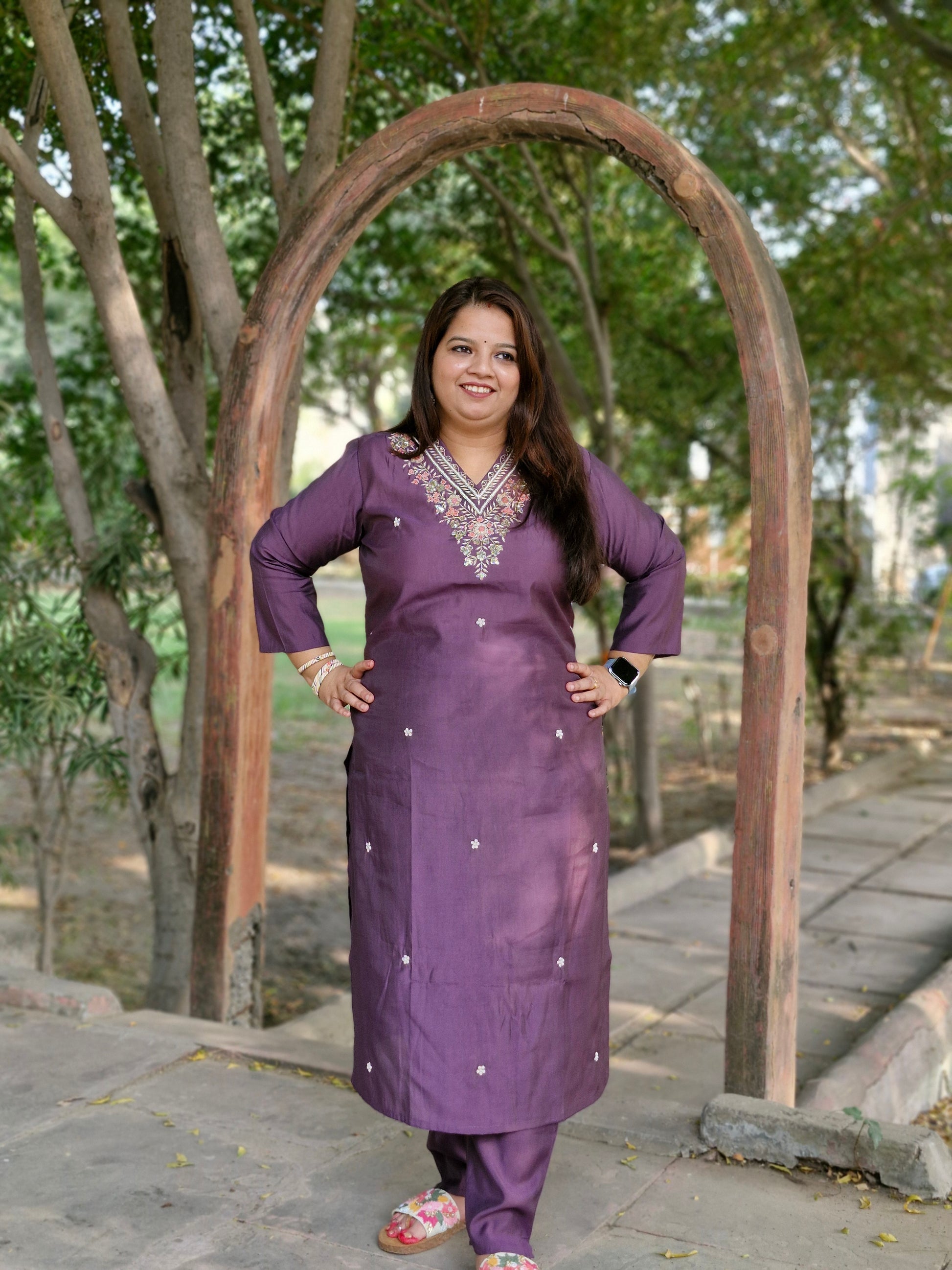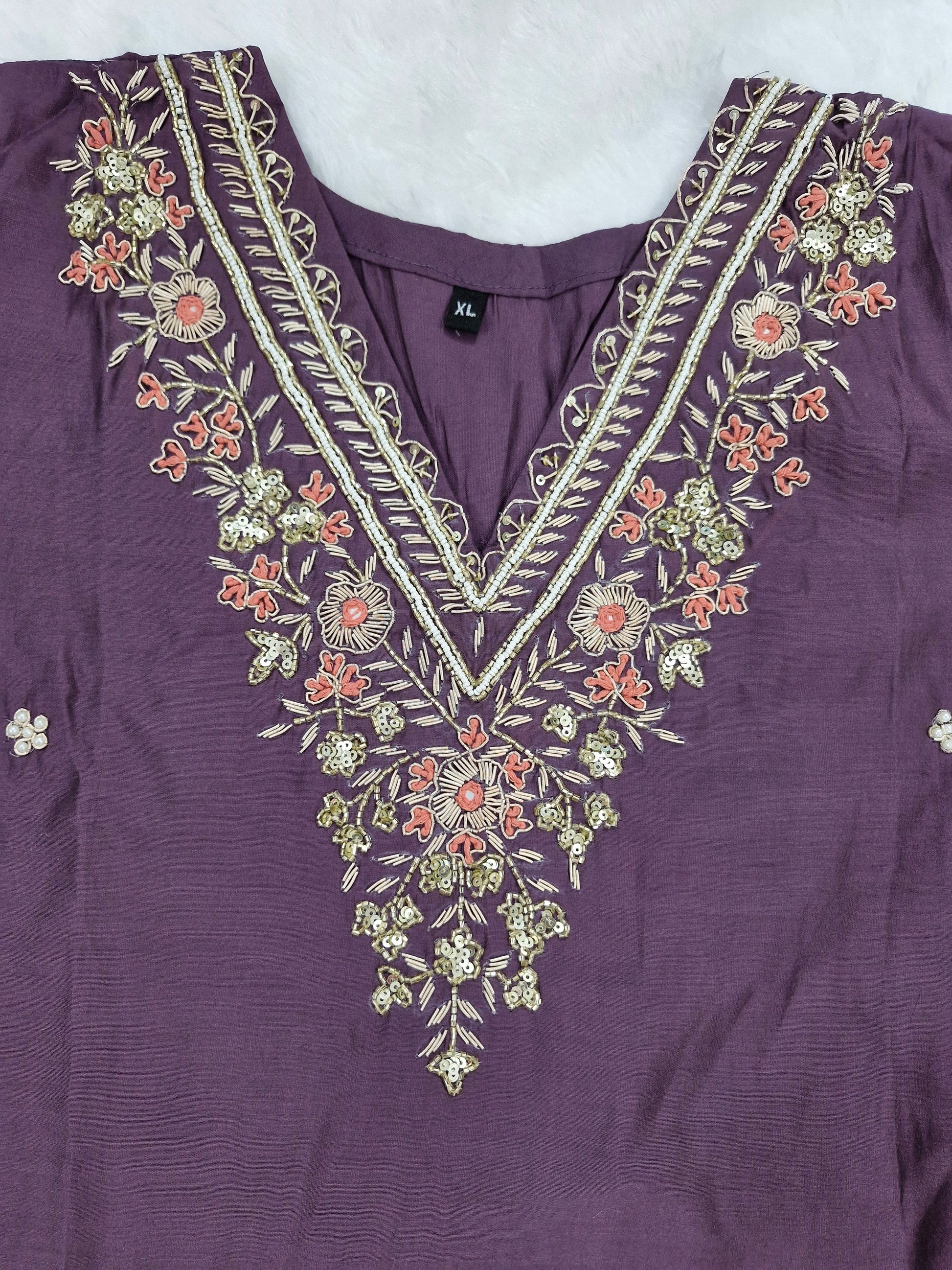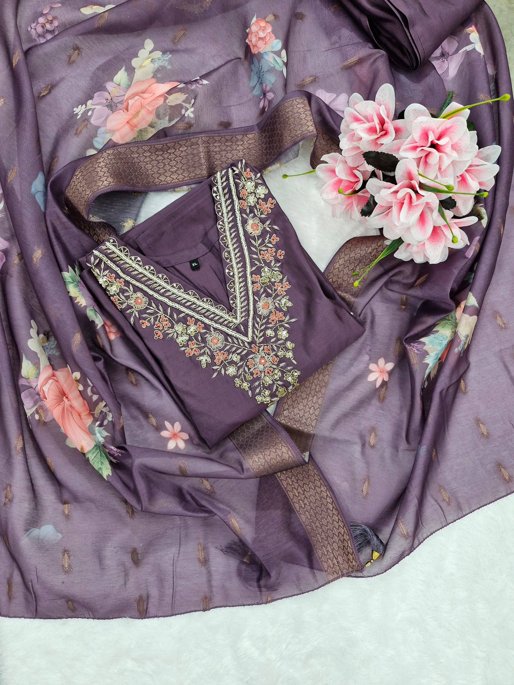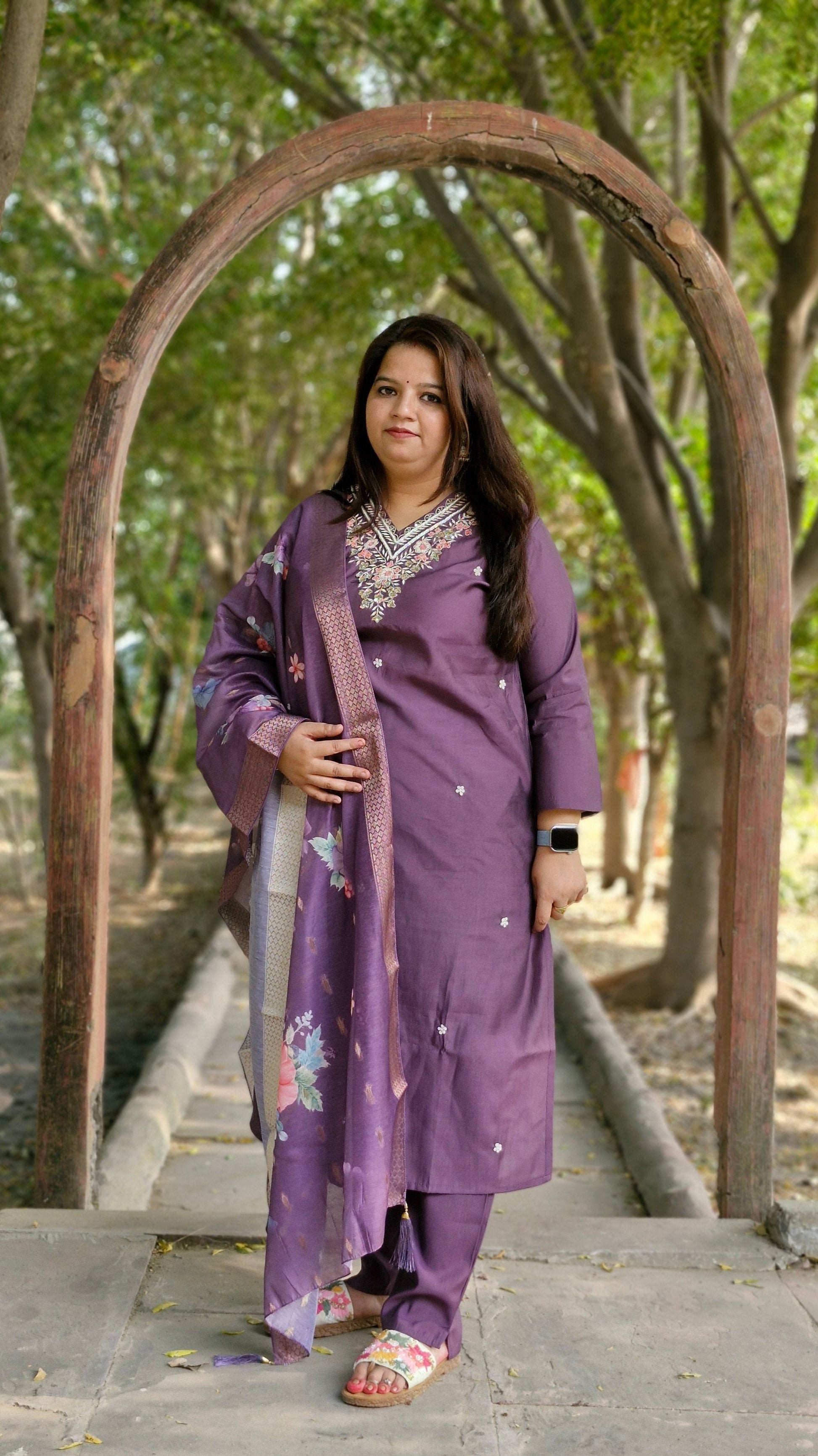 Indulge in luxury with this deep purple suit set crafted from premium Dola silk, perfect for festive and semi-formal occasions. The kameez showcases intricate floral embroidery around the neckline, giving it a rich and sophisticated look. Paired with sleek straight pants, this outfit offers a modern yet traditional appeal. The set is completed with a sheer organza dupatta, adorned with vibrant floral prints, adding a soft and graceful touch to the overall ensemble.