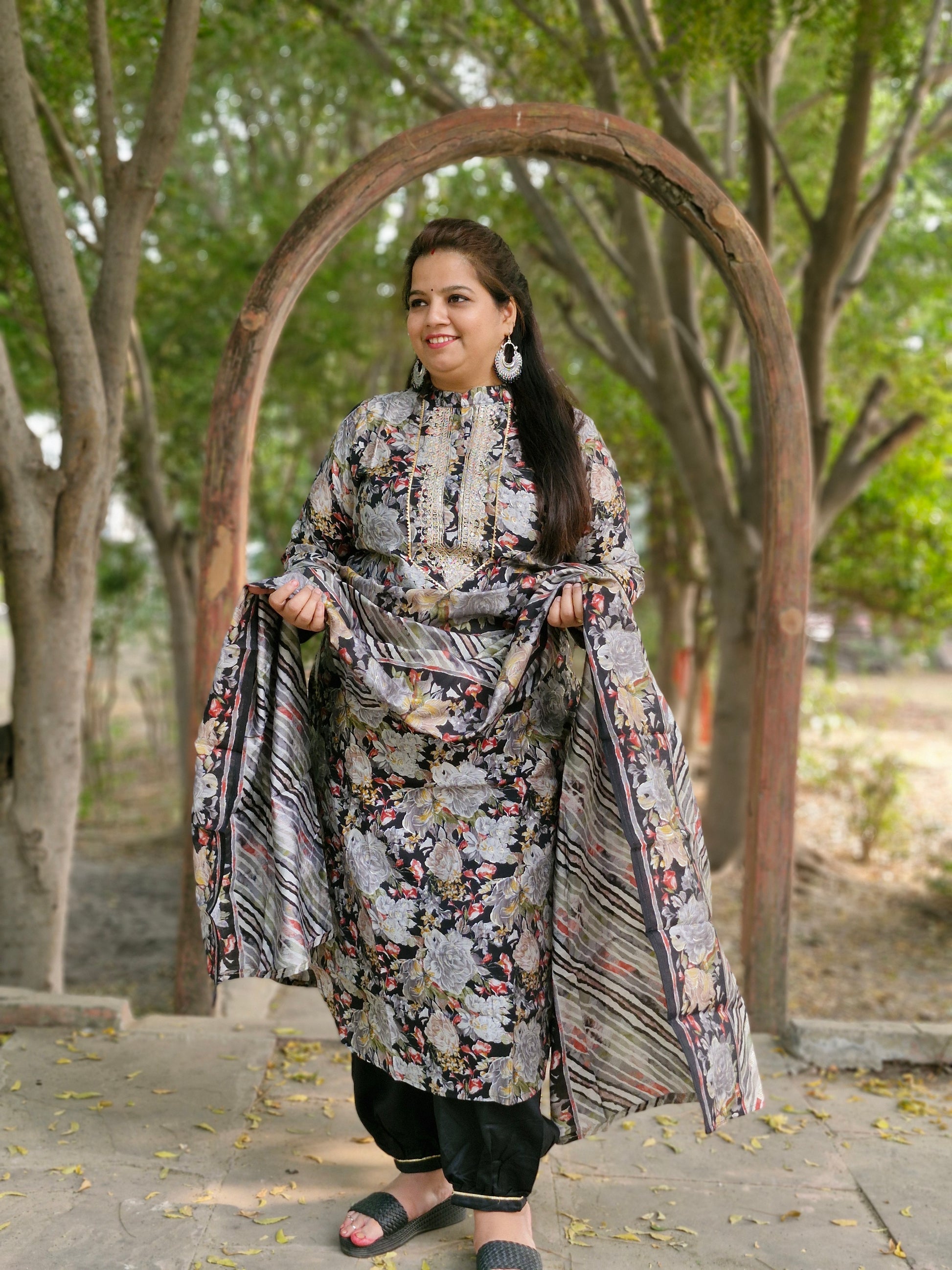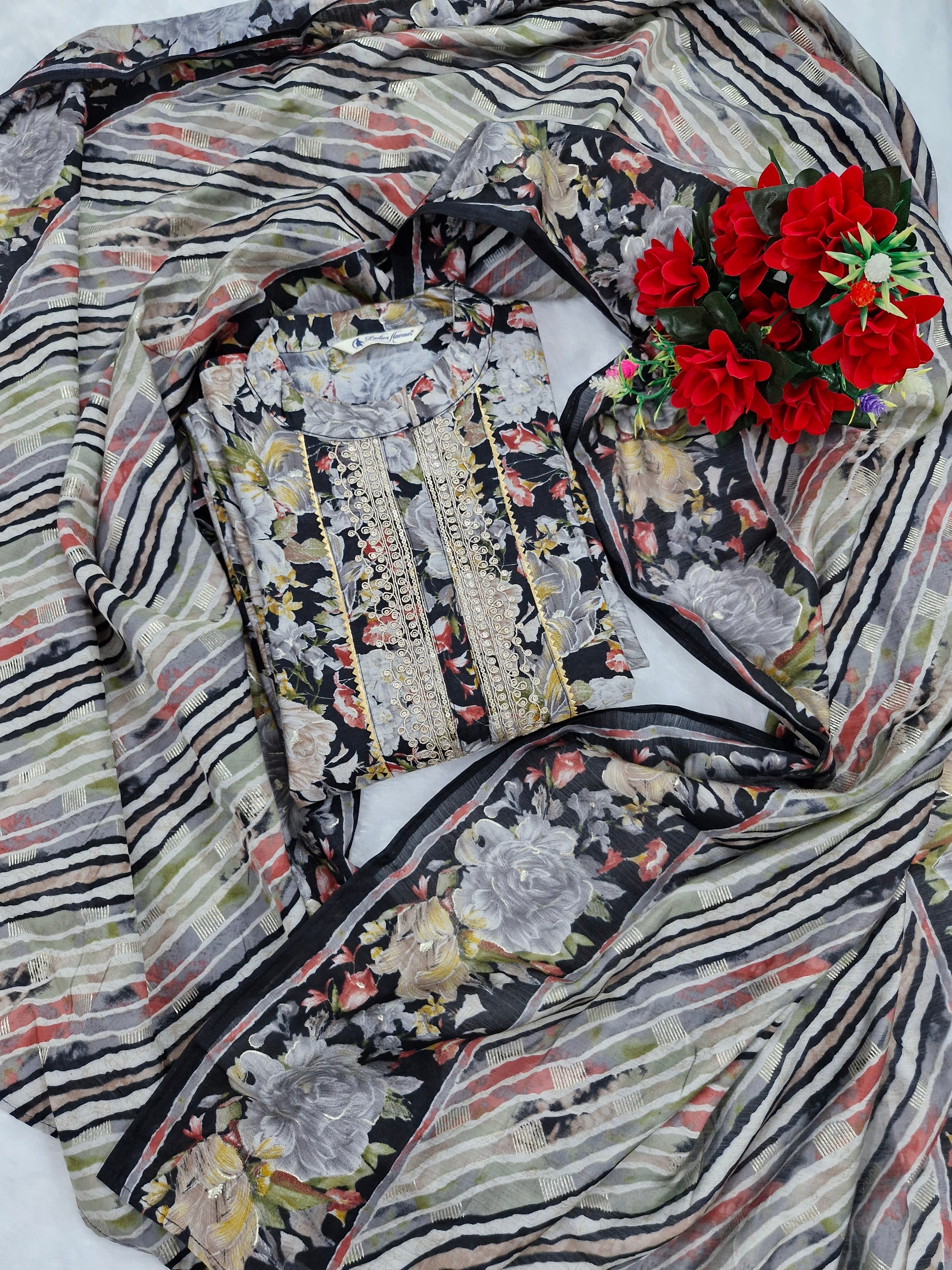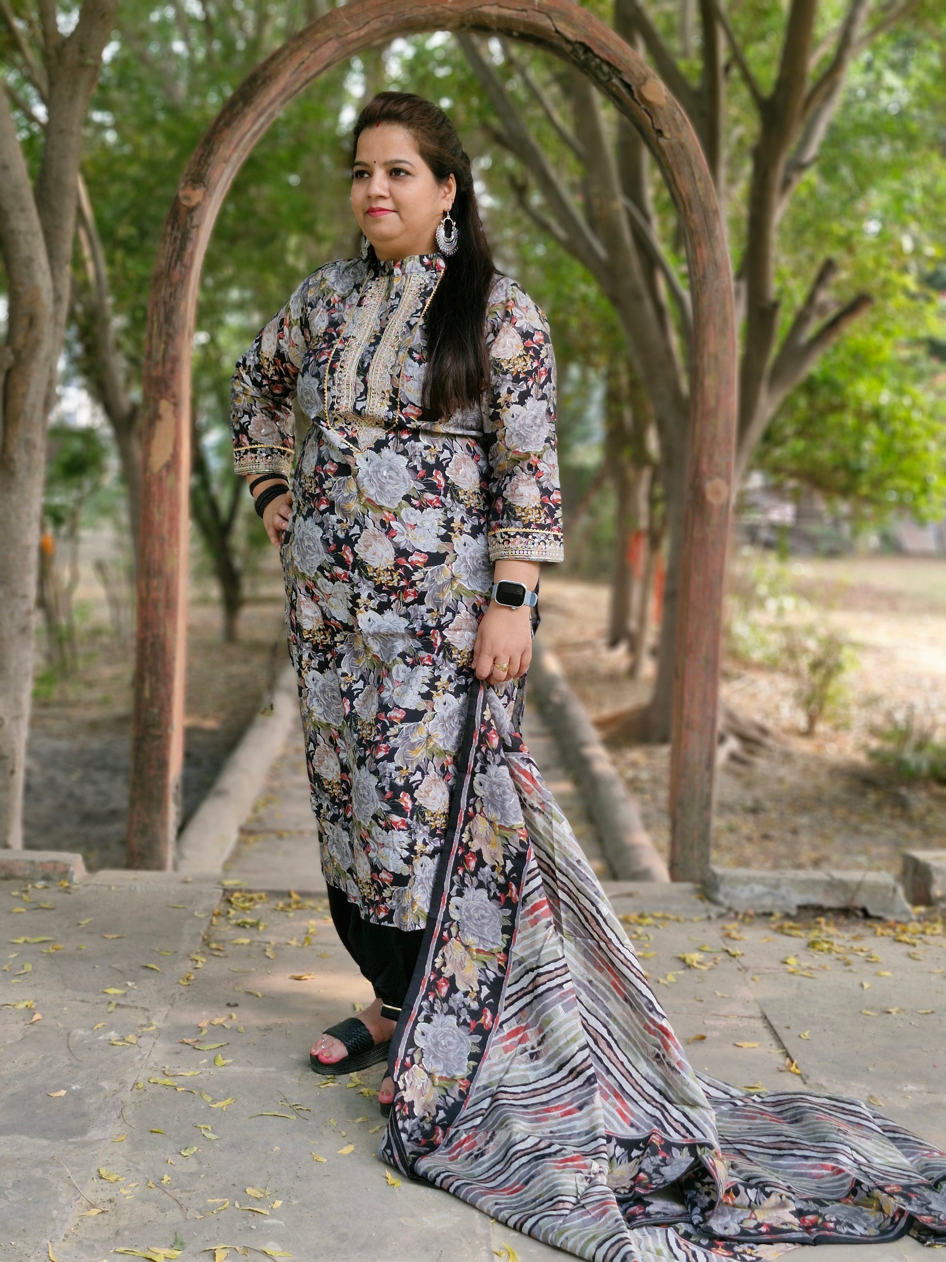 Elevate your ethnic wardrobe with this sophisticated three-piece suit. The kurta features an elegant black base adorned with striking floral prints, complemented by intricate embroidery on the neckline. Paired with solid black bottoms and a stylish dupatta in a bold striped pattern, this outfit is a beautiful blend of tradition and modern flair.