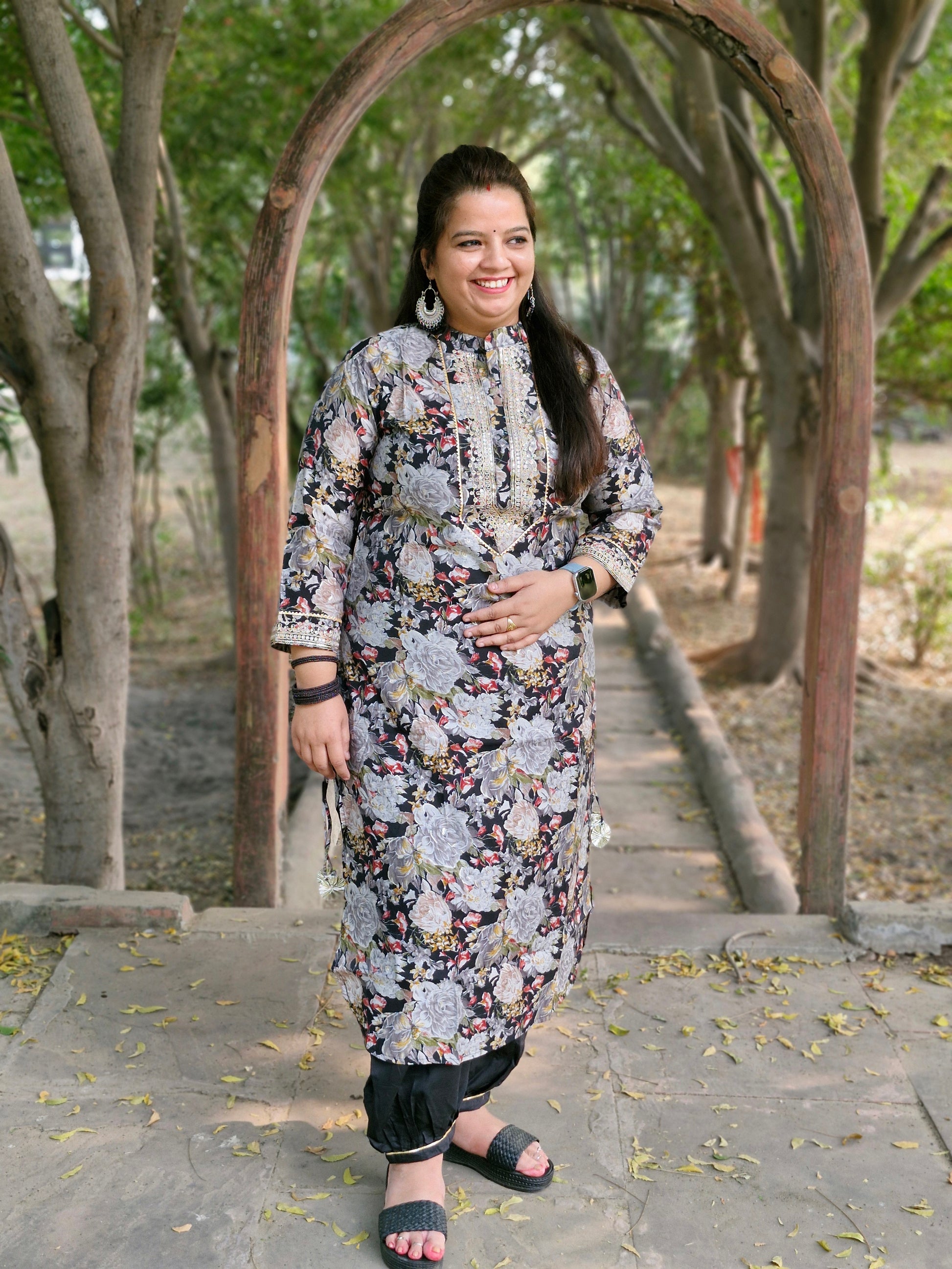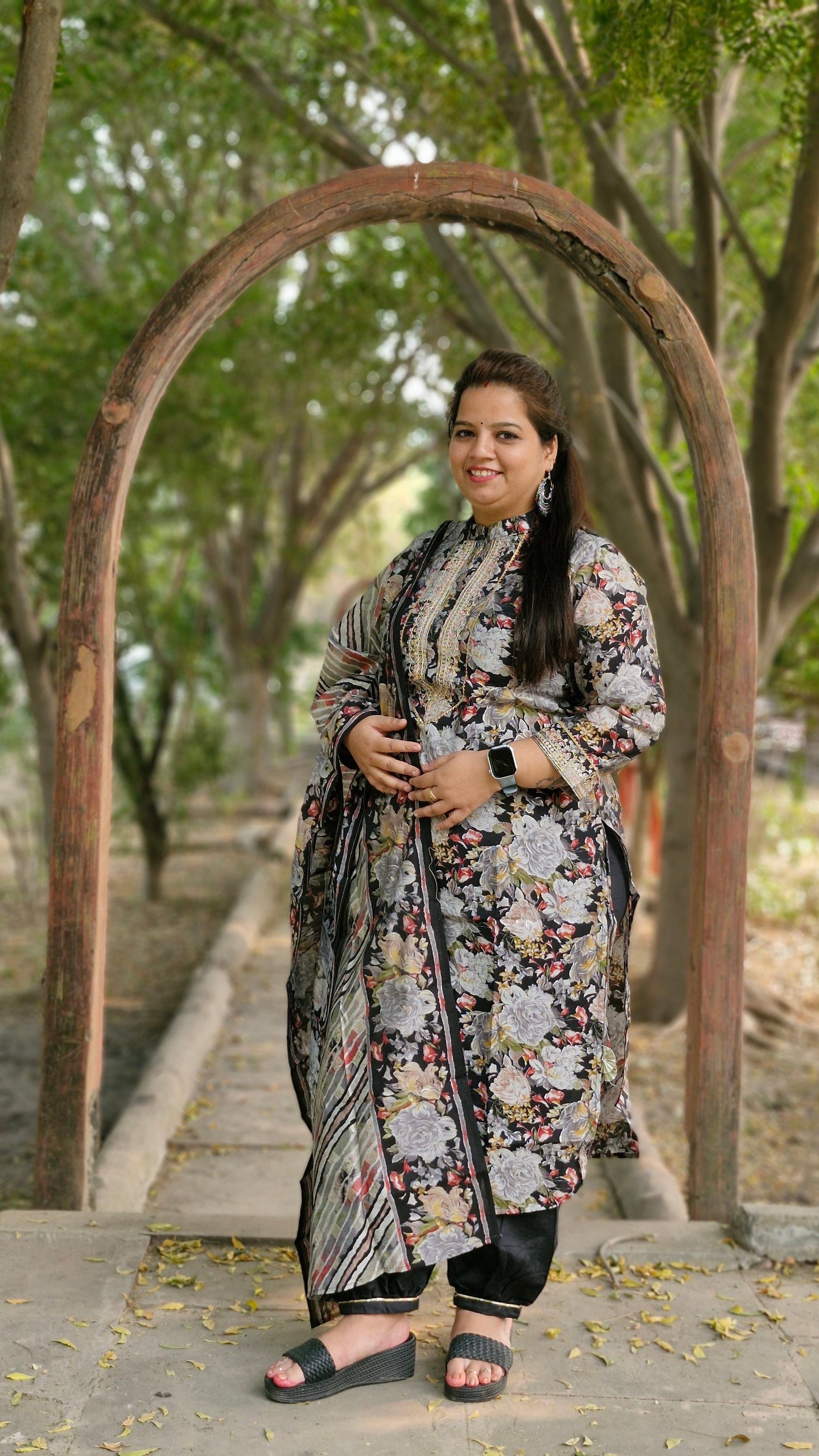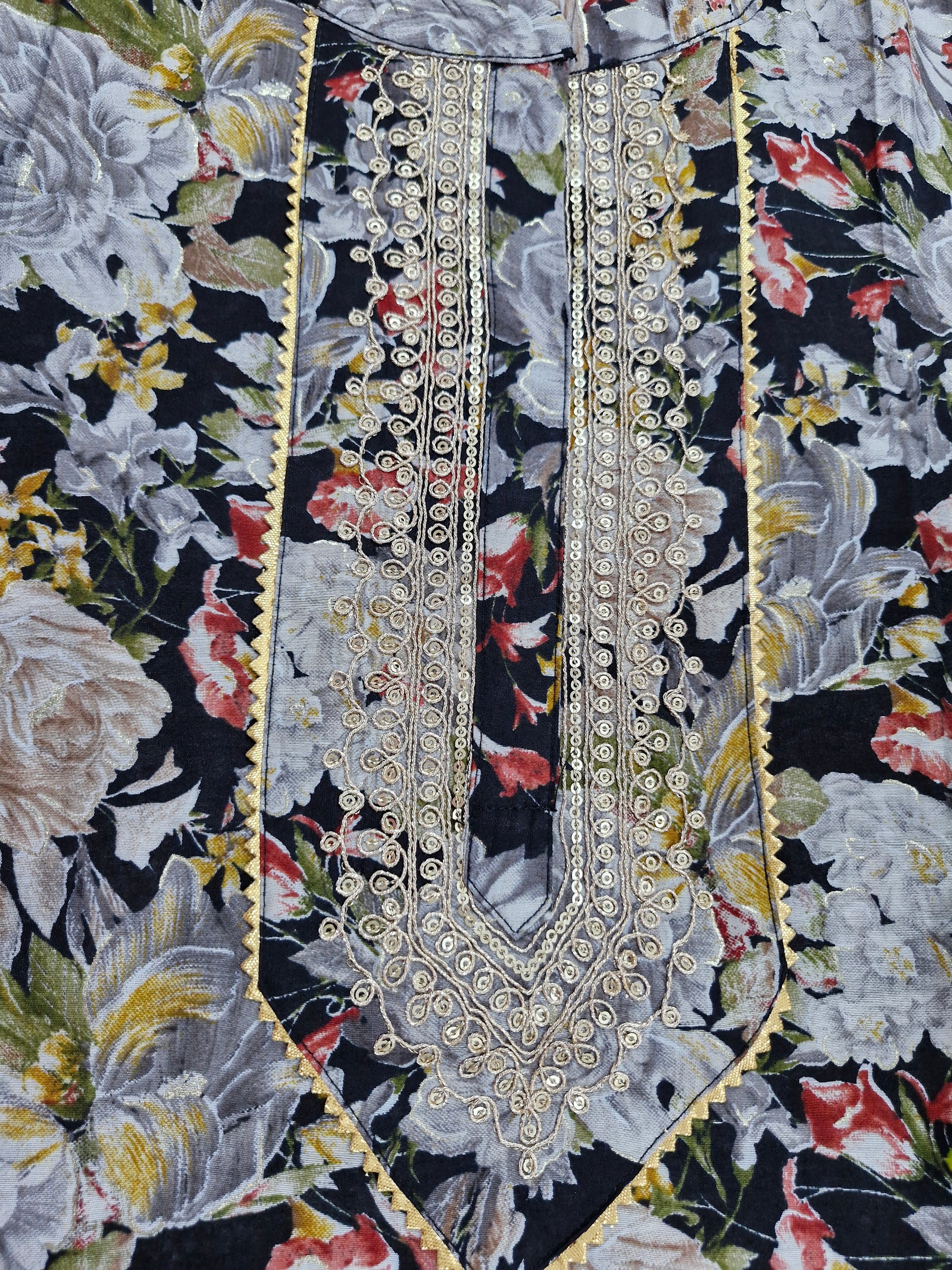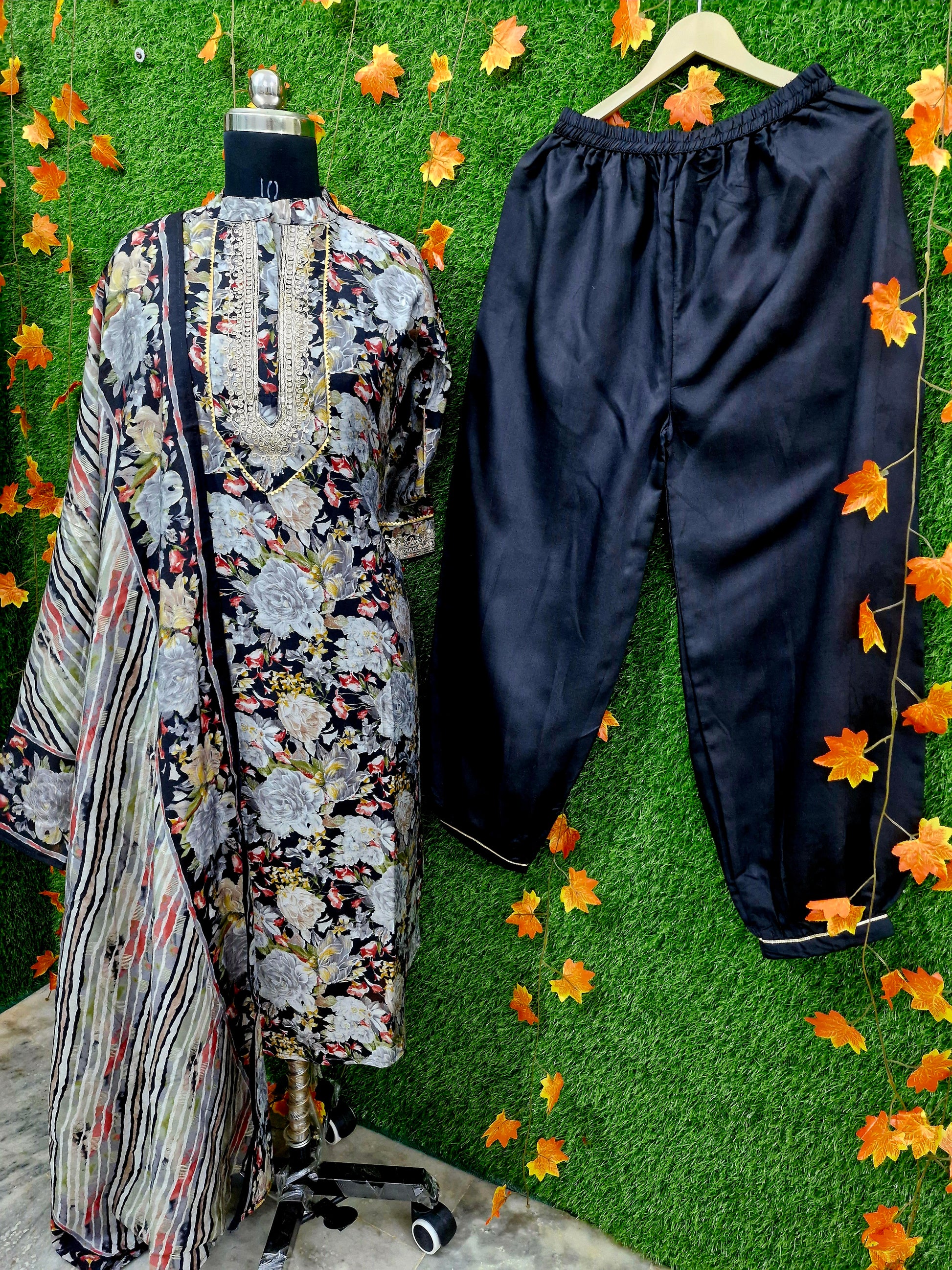 Elevate your ethnic wardrobe with this sophisticated three-piece suit. The kurta features an elegant black base adorned with striking floral prints, complemented by intricate embroidery on the neckline. Paired with solid black bottoms and a stylish dupatta in a bold striped pattern, this outfit is a beautiful blend of tradition and modern flair.