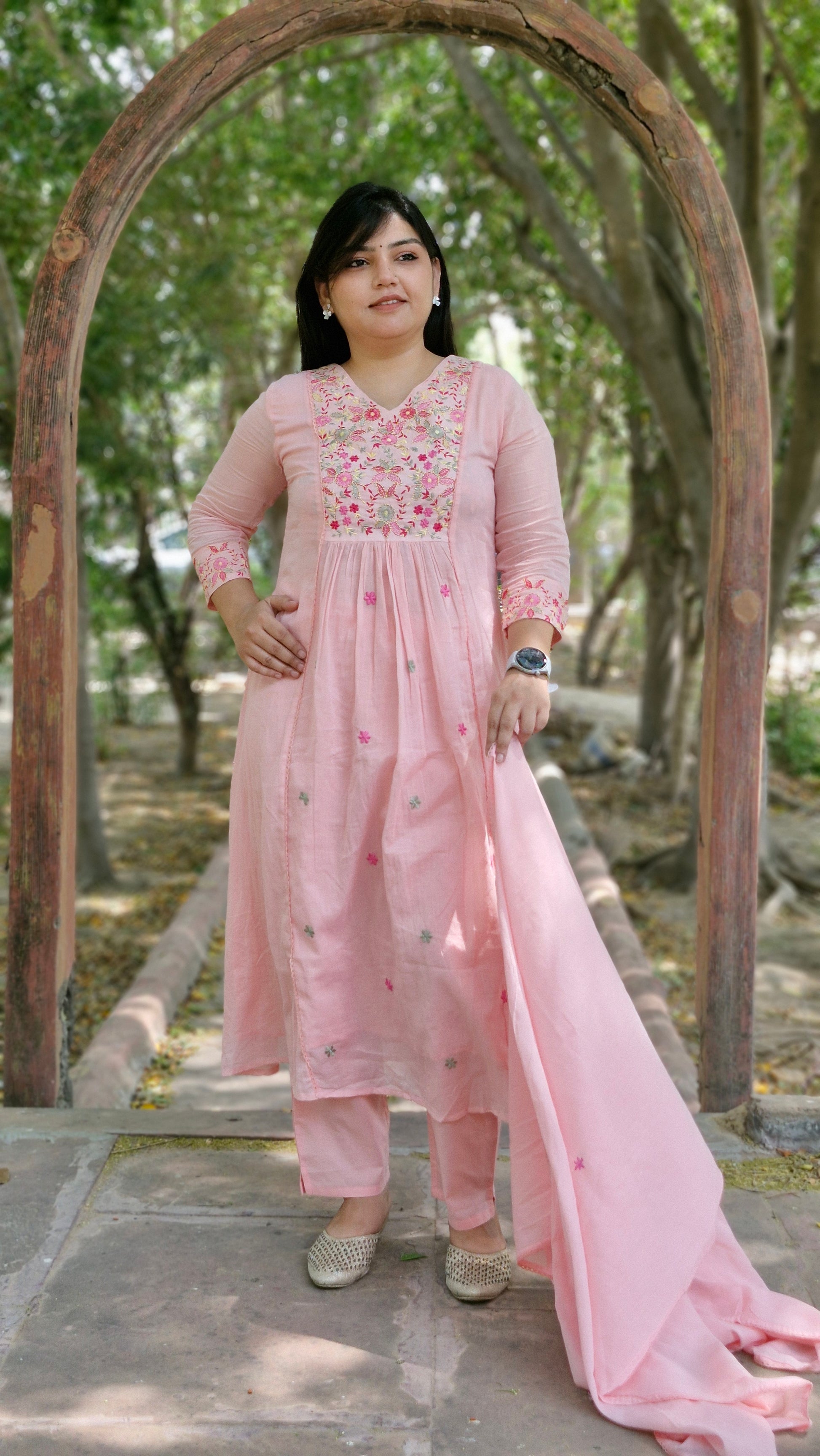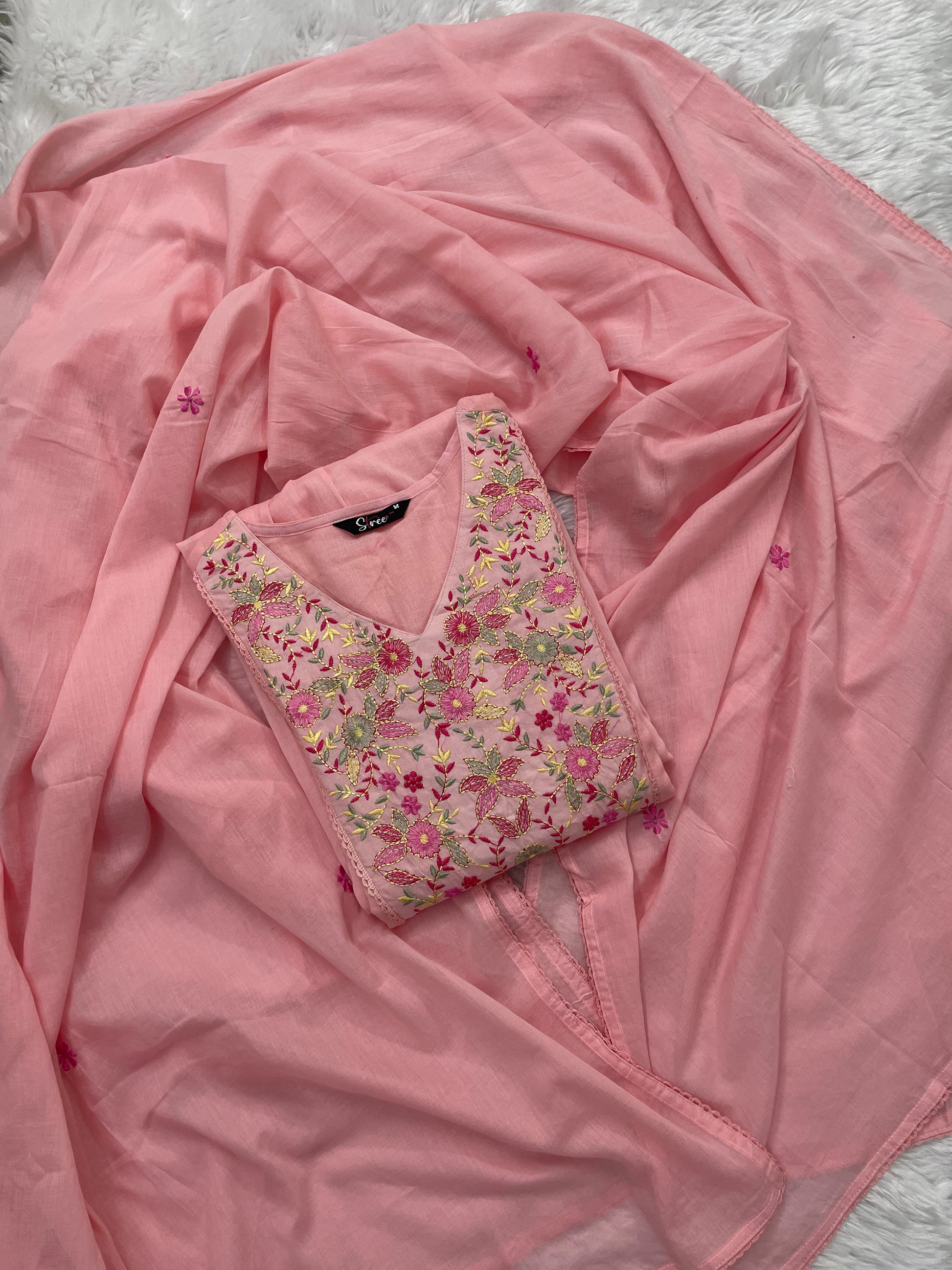 Embrace grace in our Blush Bloom three-piece suit set, where soft pastel charm meets delicate embroidery. The kurta features multicolored floral threadwork on the yoke and sleeves, paired with matching bottoms and a lightweight embroidered dupatta for a complete and soothing ethnic look.