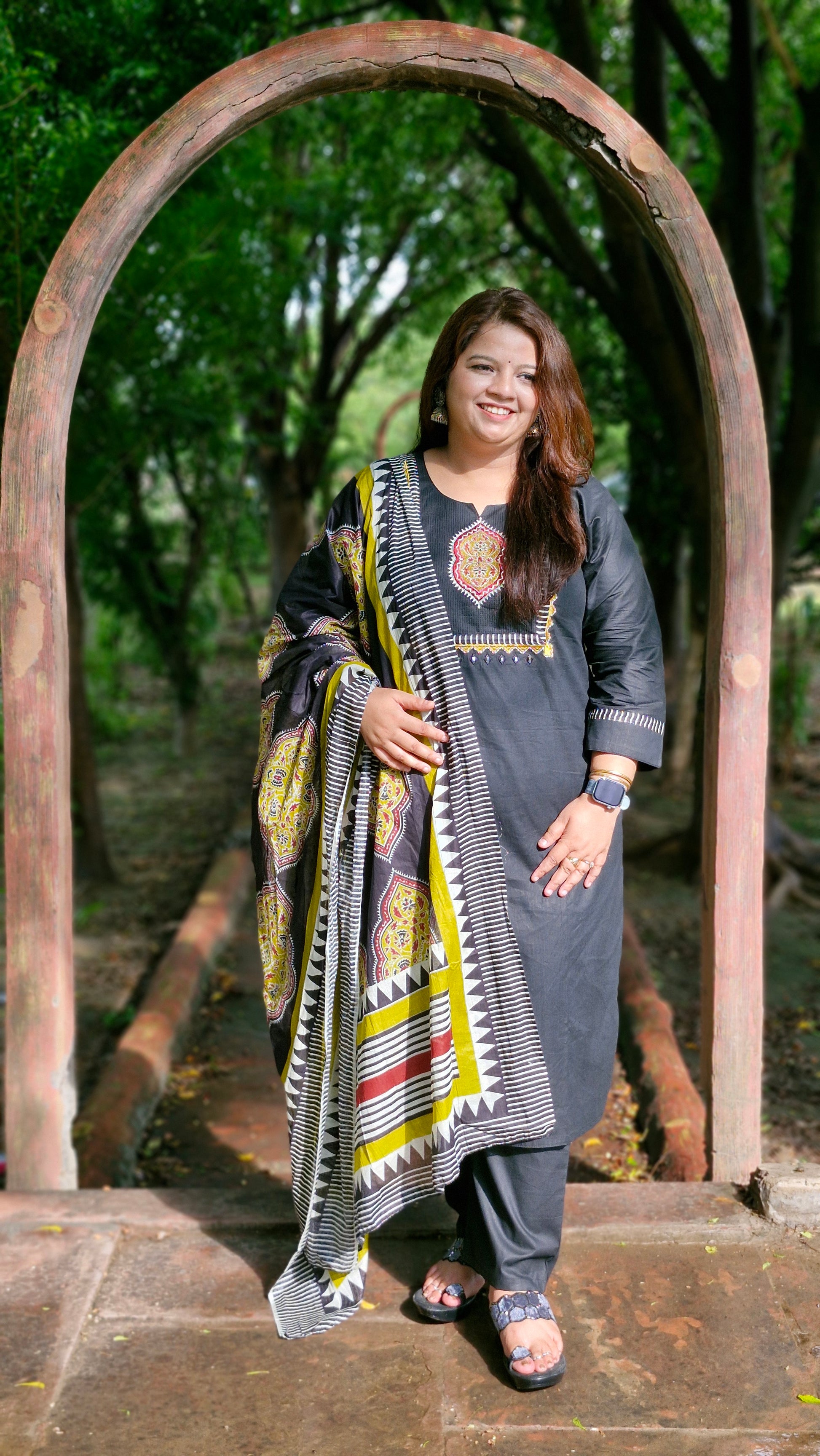 Step into effortless elegance with our Charcoal Charm three-piece suit set, designed in a deep charcoal shade. This beautiful ensemble is crafted from soft, breathable cotton fabric, making it a perfect choice for all-day comfort.