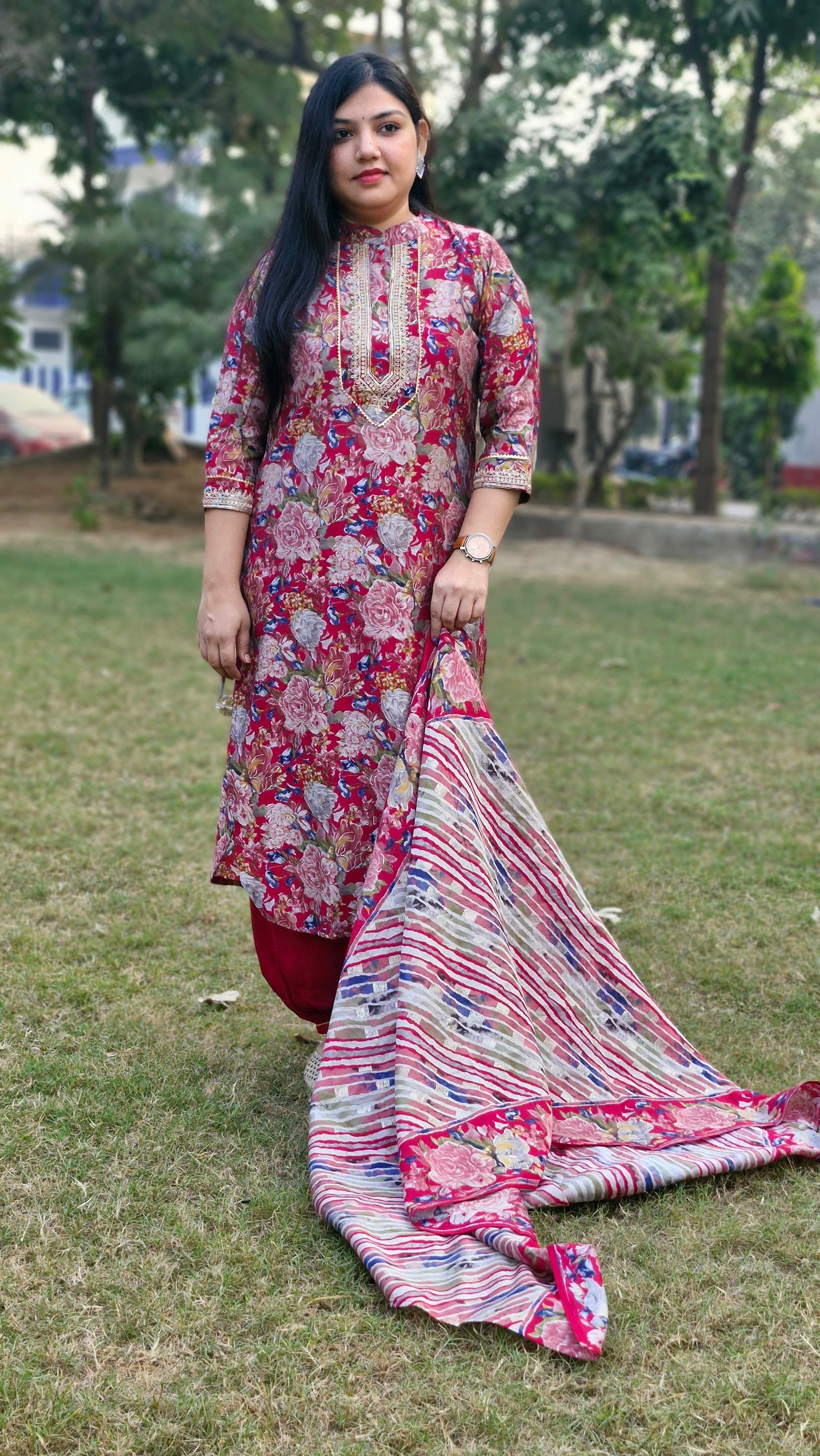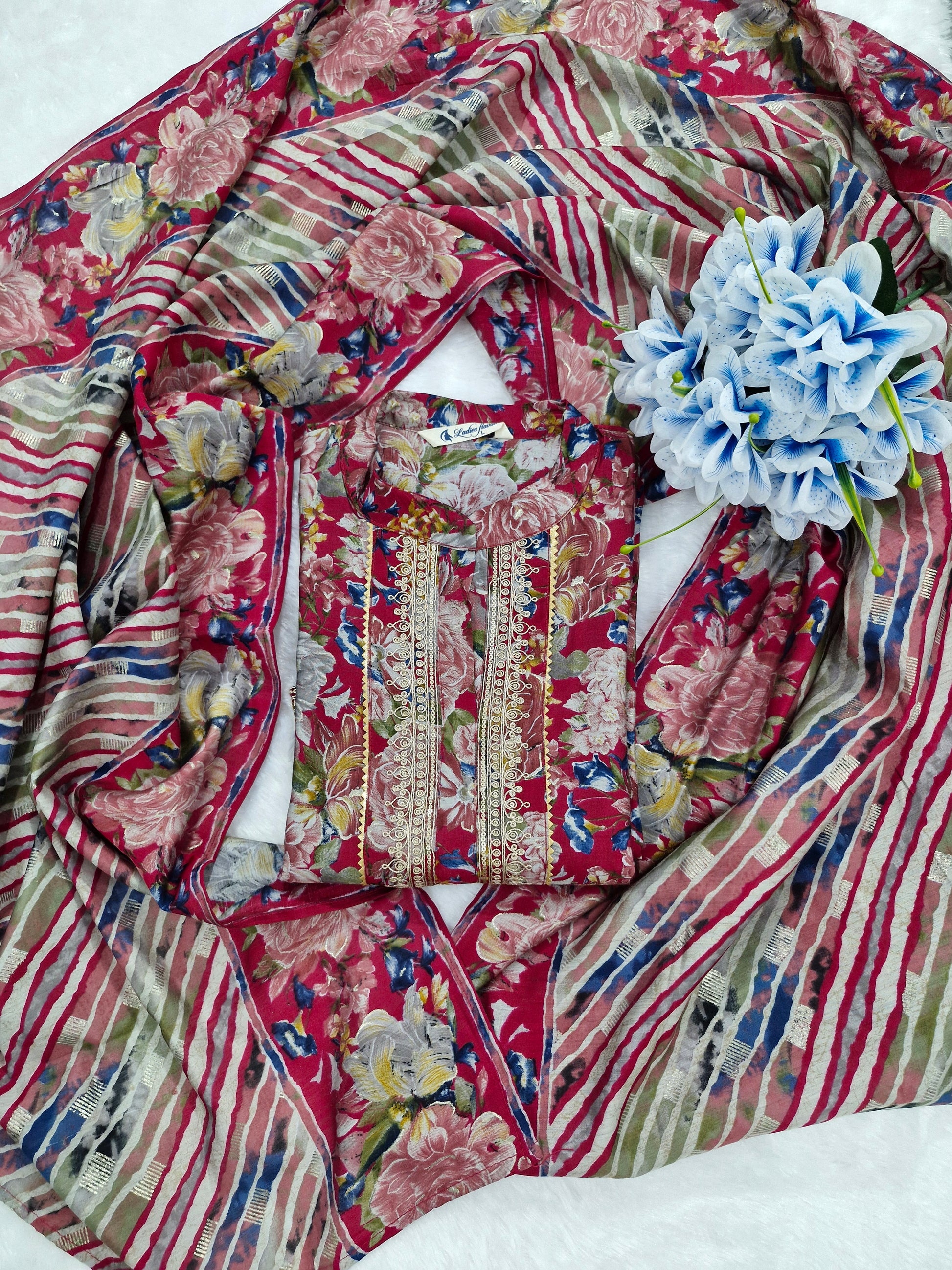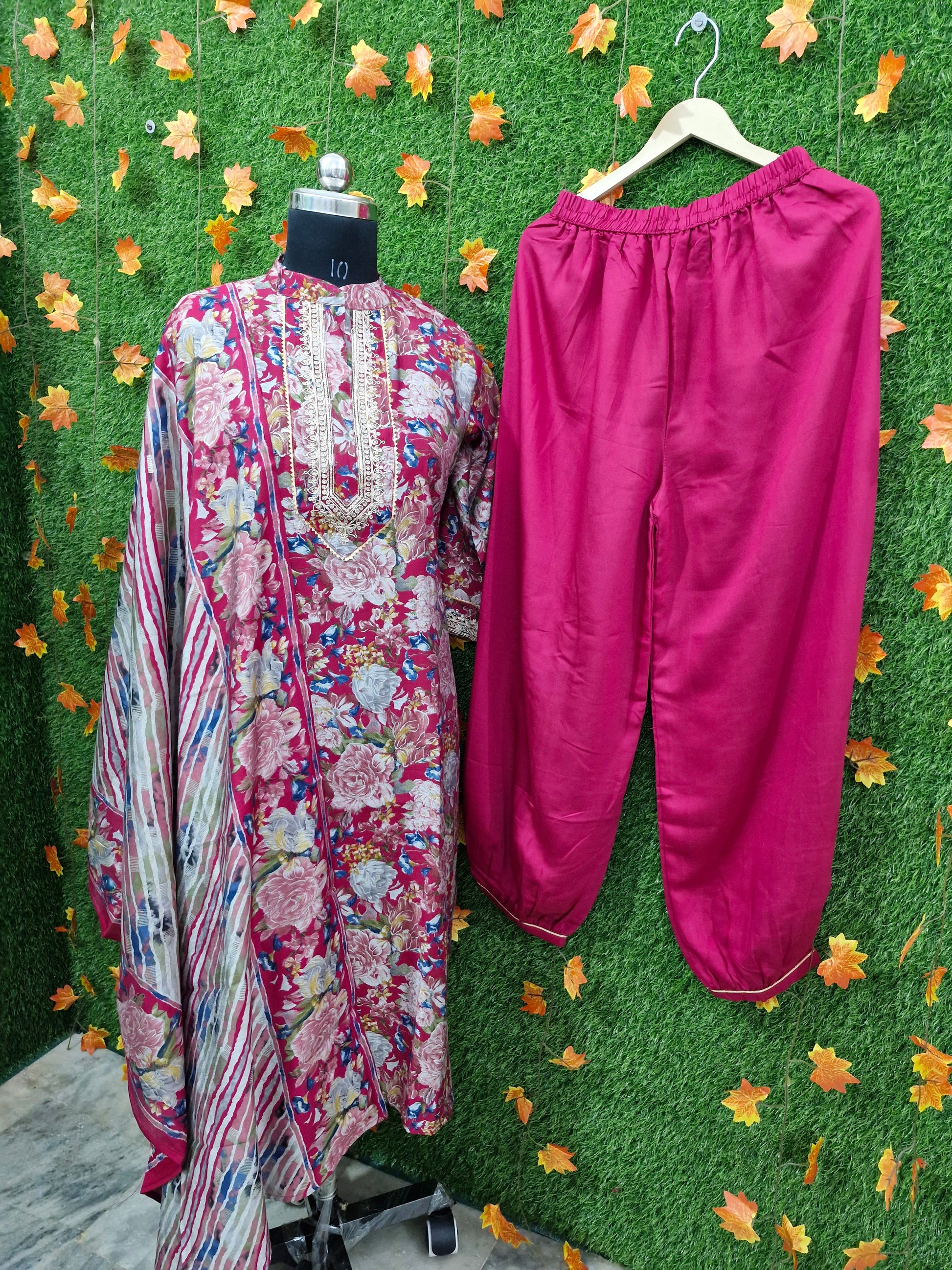 Make a statement with this vibrant three-piece suit, featuring a deep pink or magenta base adorned with elegant floral prints in shades of white, blue, and yellow. The neckline is beautifully embroidered, adding a touch of intricate detail. Paired with matching bottoms and a striking dupatta with a bold striped pattern, this outfit is perfect for any occasion where you want to stand out in style.