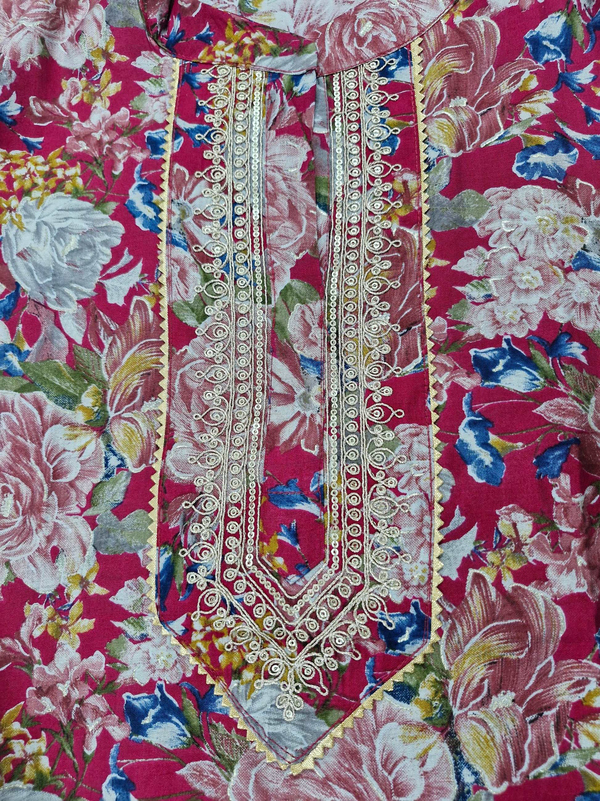 - Color: Deep pink or magenta with floral prints