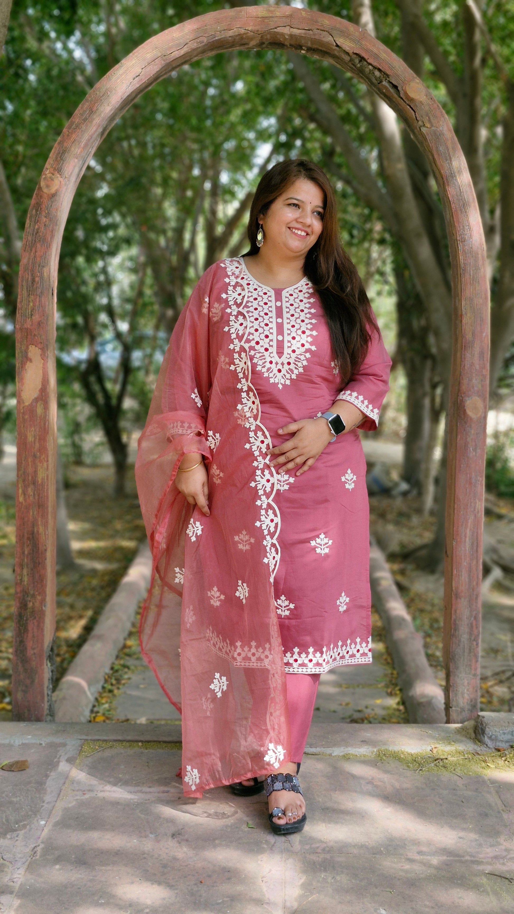 The kurta features a lovely dusty rose hue, delicately adorned with intricate white embroidery around the neckline, front panel, and hem. The detailed floral and geometric patterns add a touch of traditional elegance. The three-quarter sleeves and straight cut of the kurta provide a comfortable and flattering silhouette.