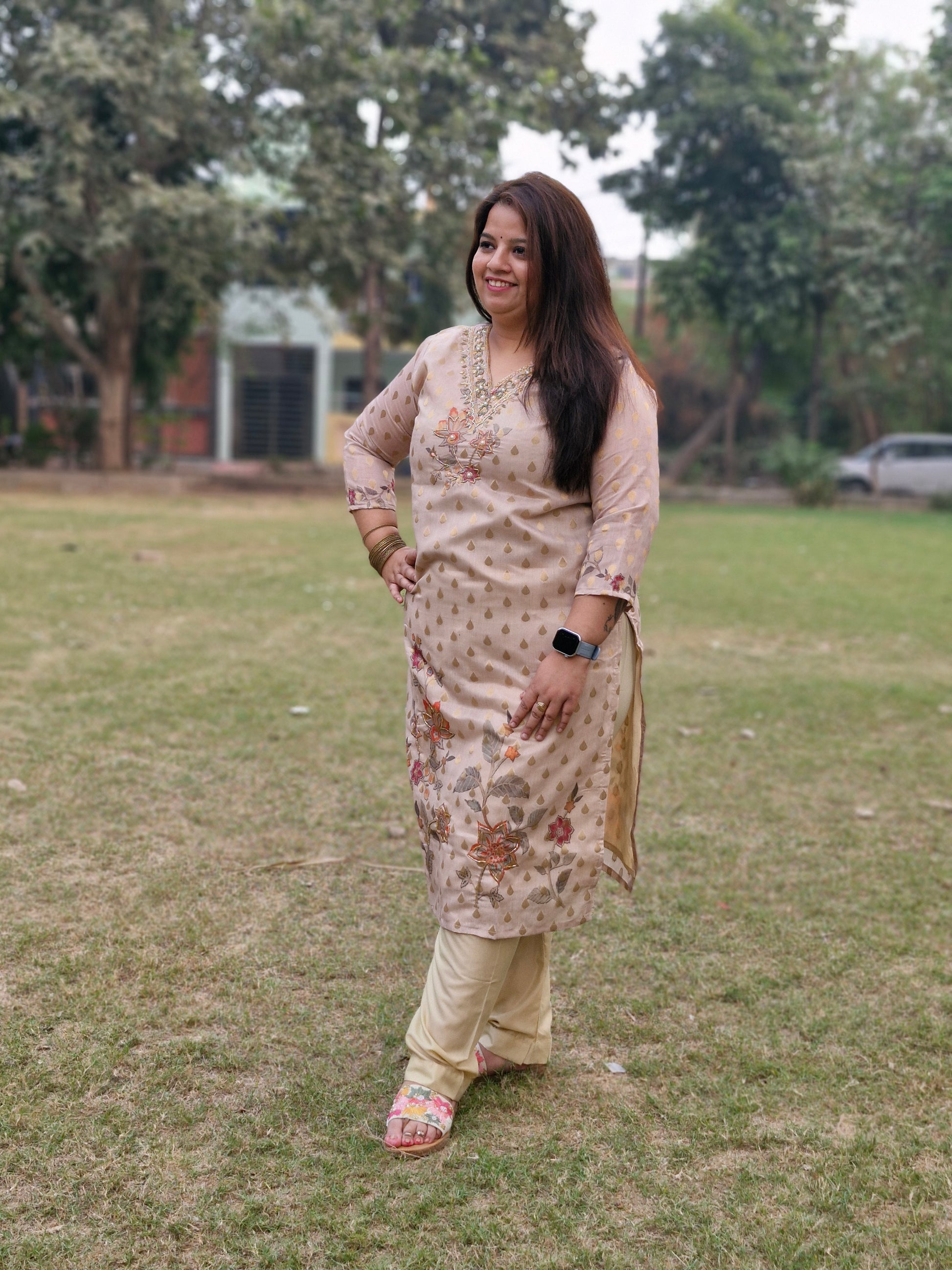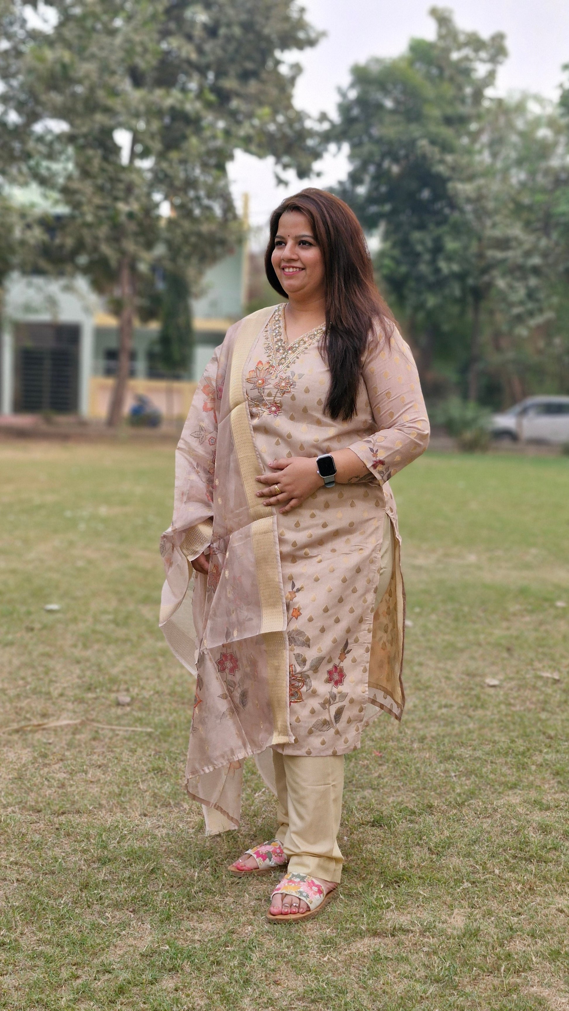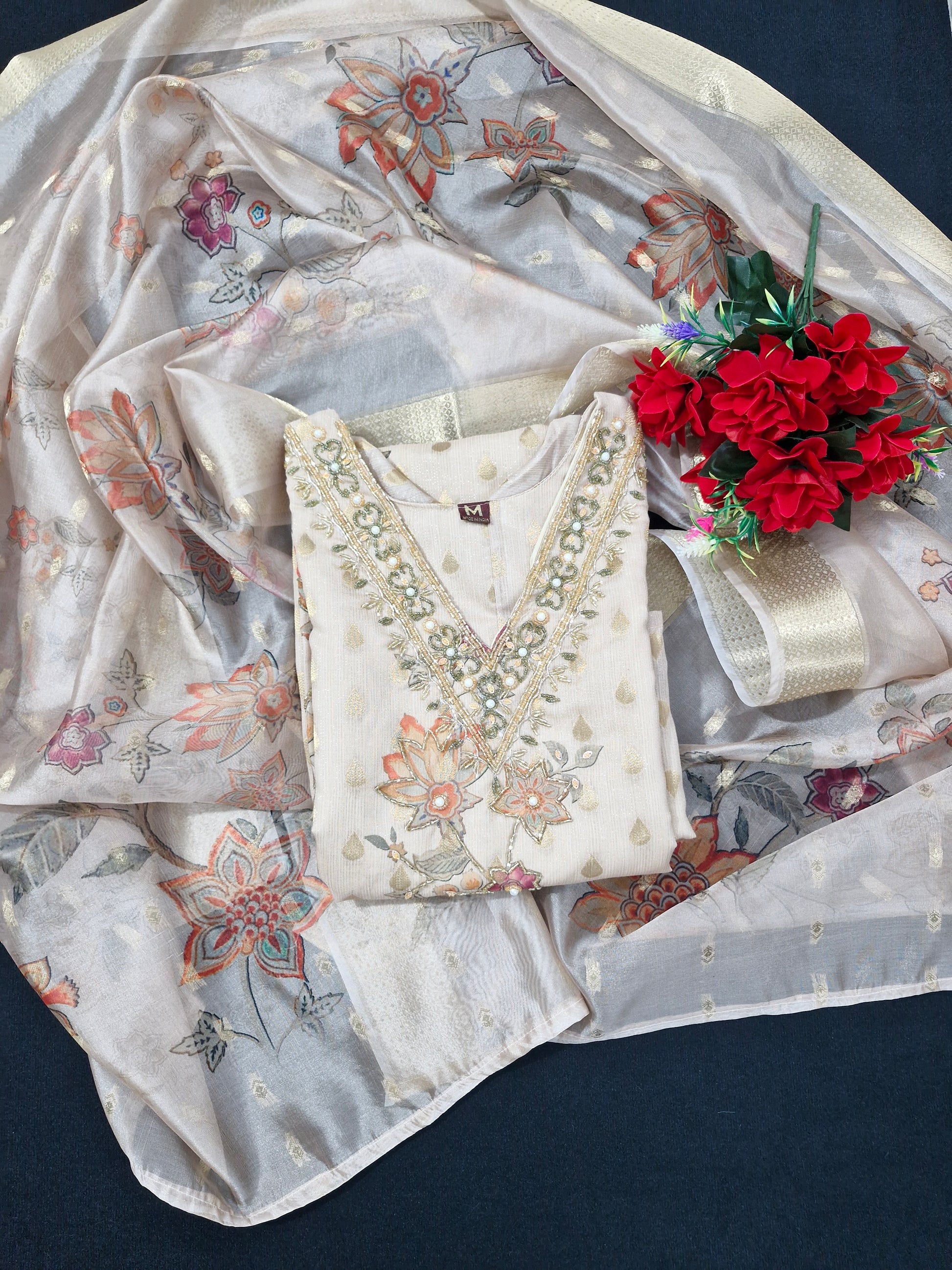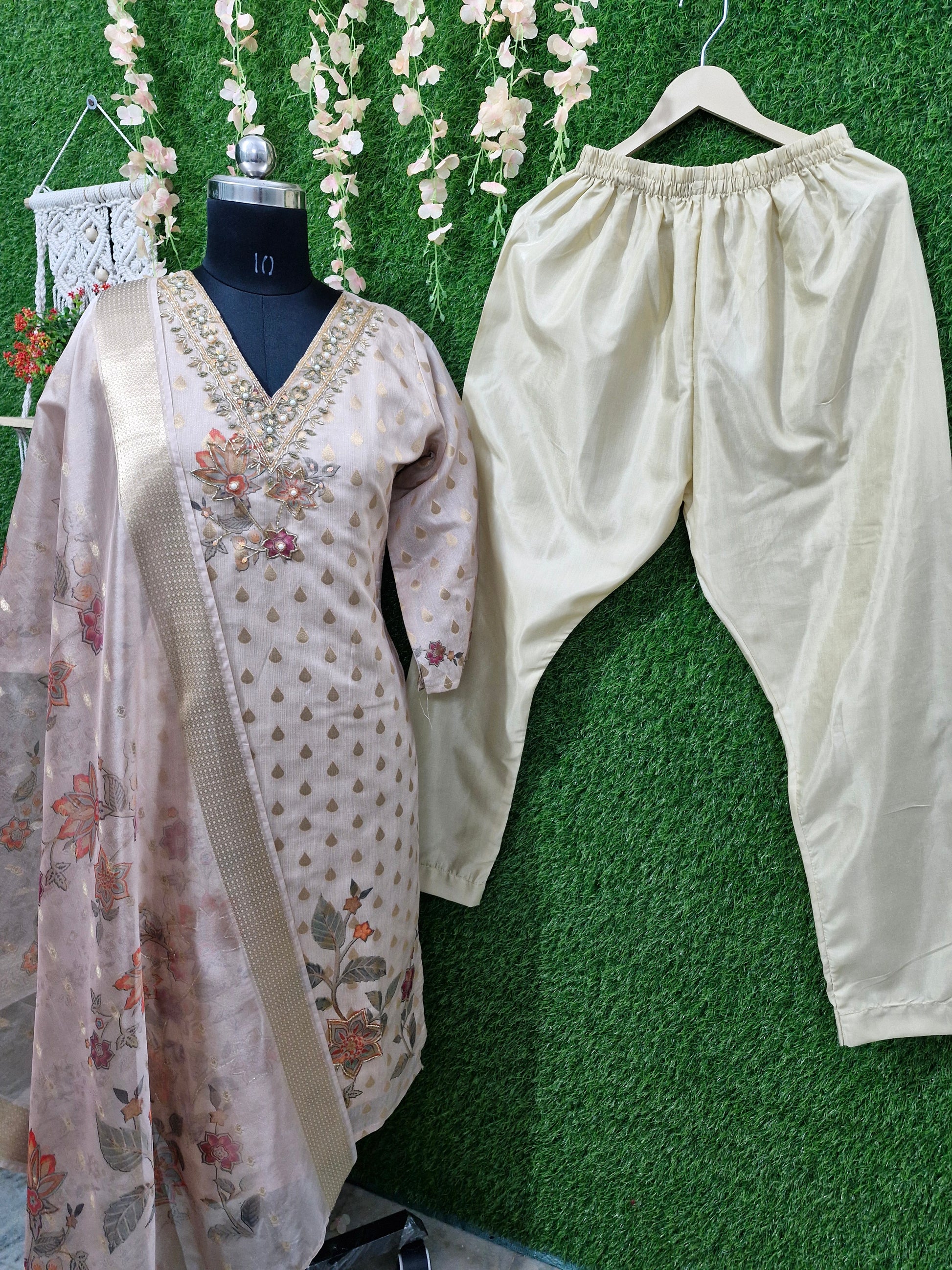 This stunning beige suit set is perfect for any festive or semi-formal occasion. The kameez features intricate gold embroidery around the neckline and scattered gold motifs throughout, adding a touch of elegance and luxury. Delicate floral designs enhance the bottom half of the kameez, offering a soft, feminine charm. Paired with loose-fit cream-colored pants for comfort and style, the set is completed with a sheer floral dupatta adorned with matching floral prints, giving the ensemble a graceful finish.