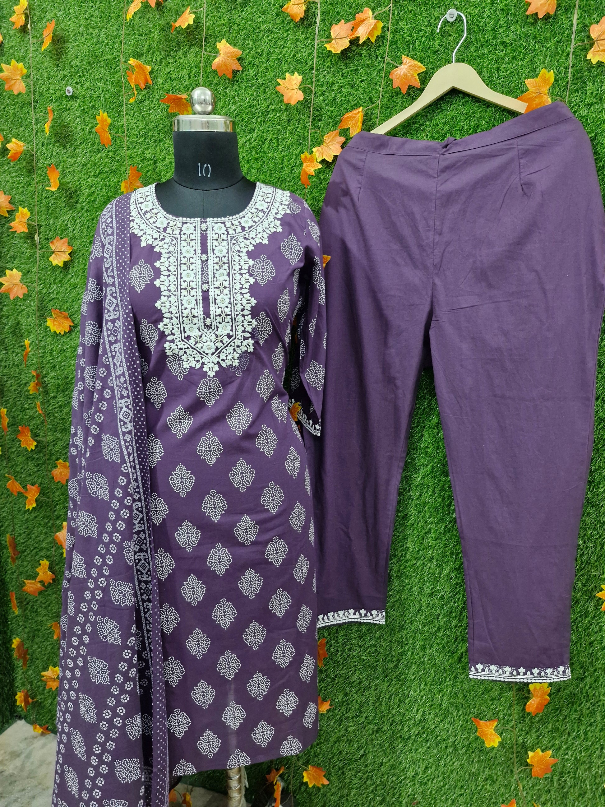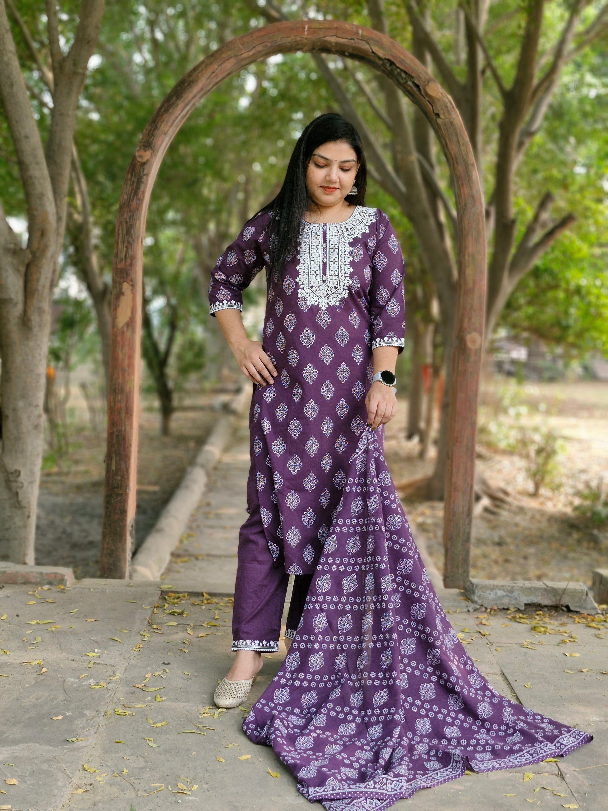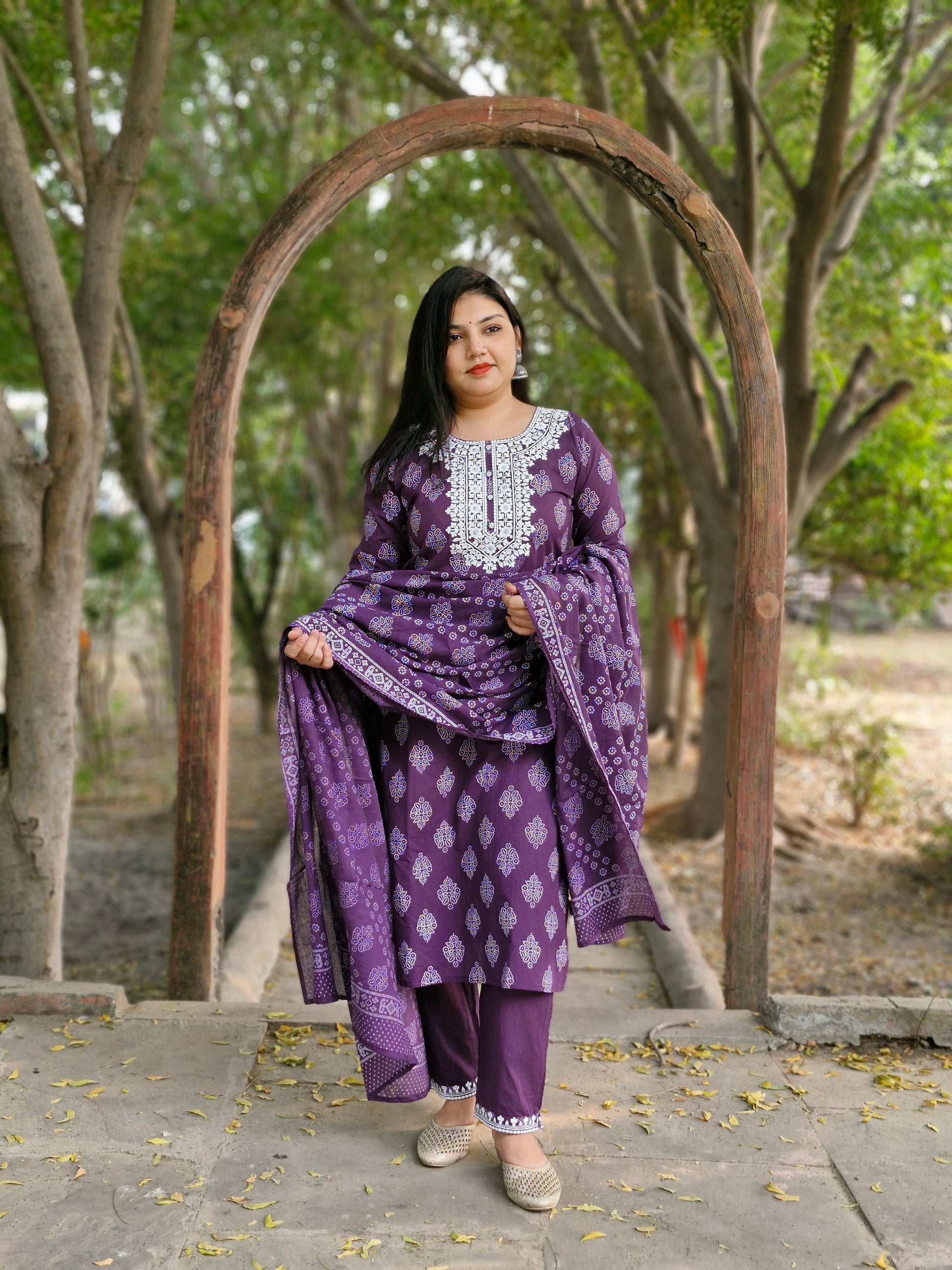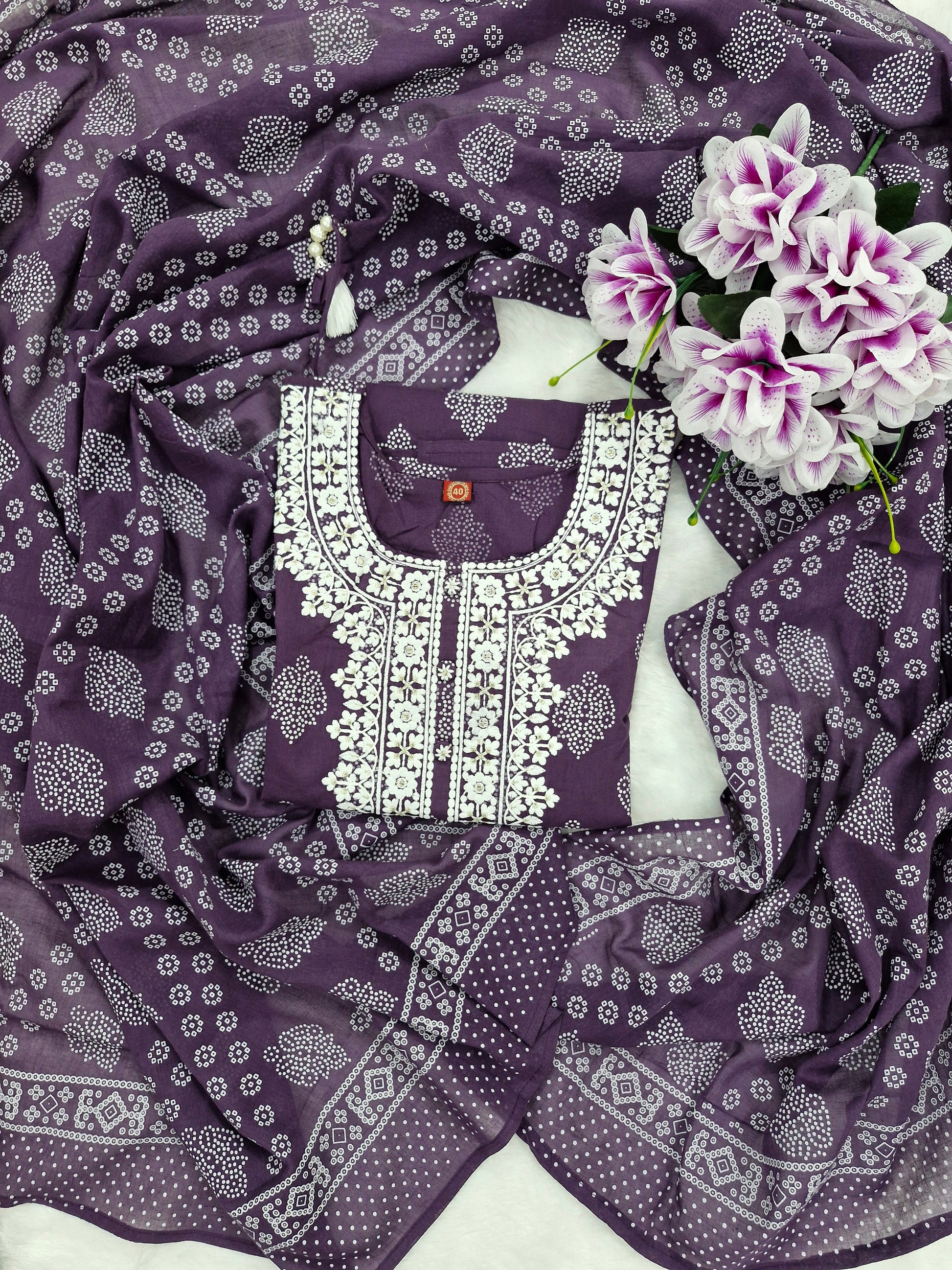 Elegant Purple Three-Piece Suit with Embroidery and Bandhani Print