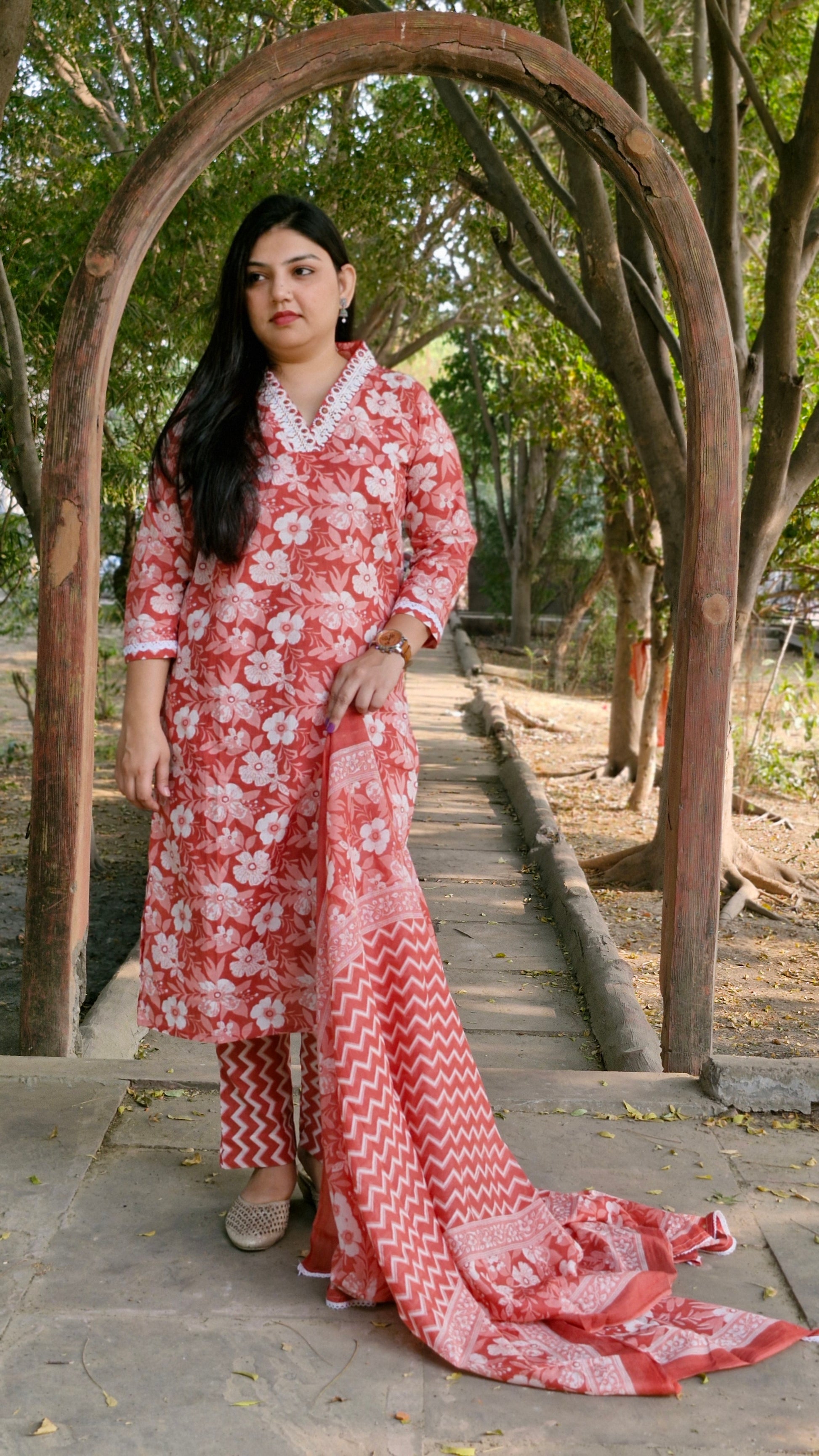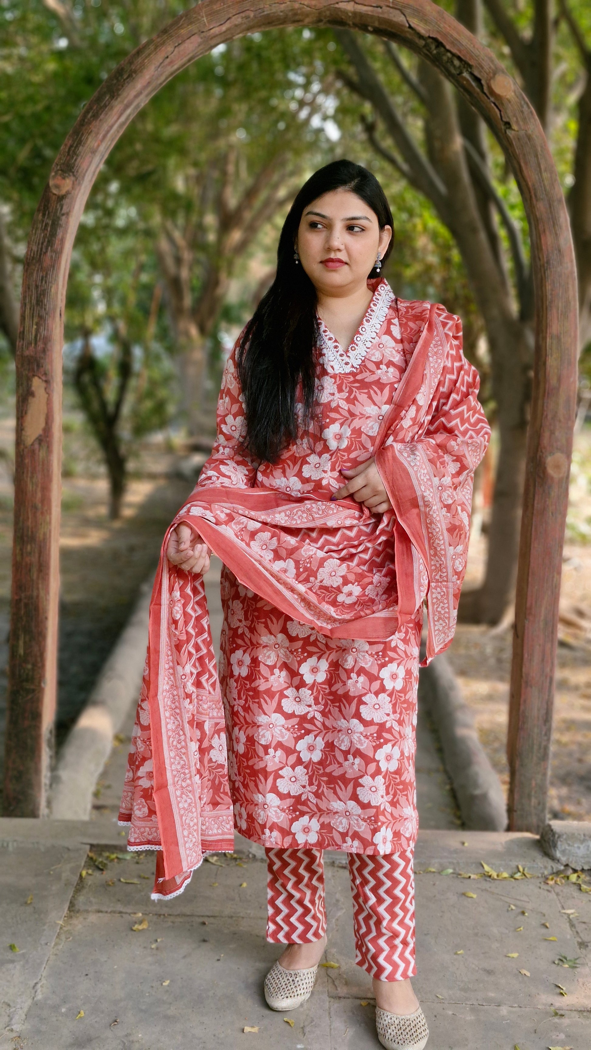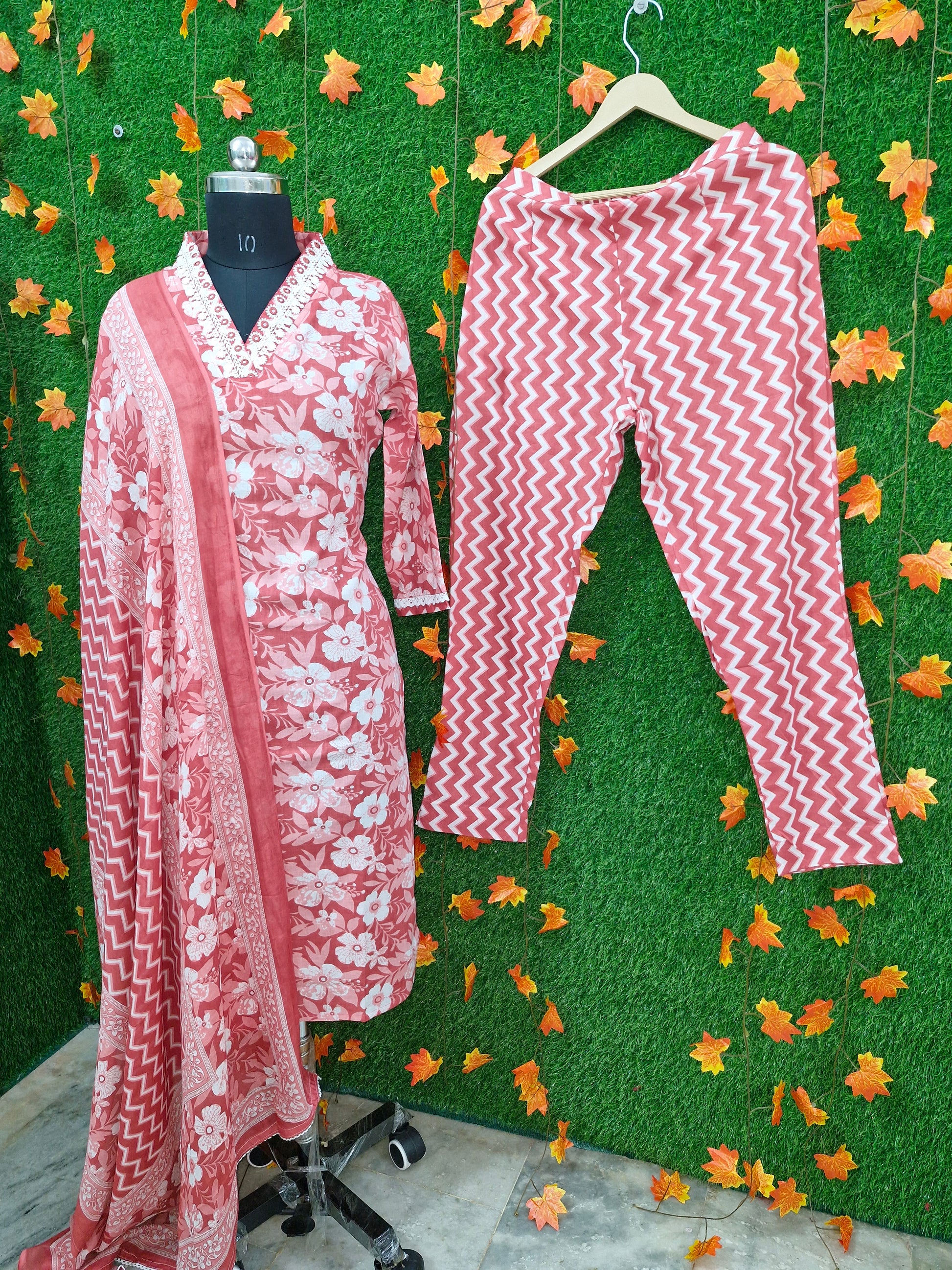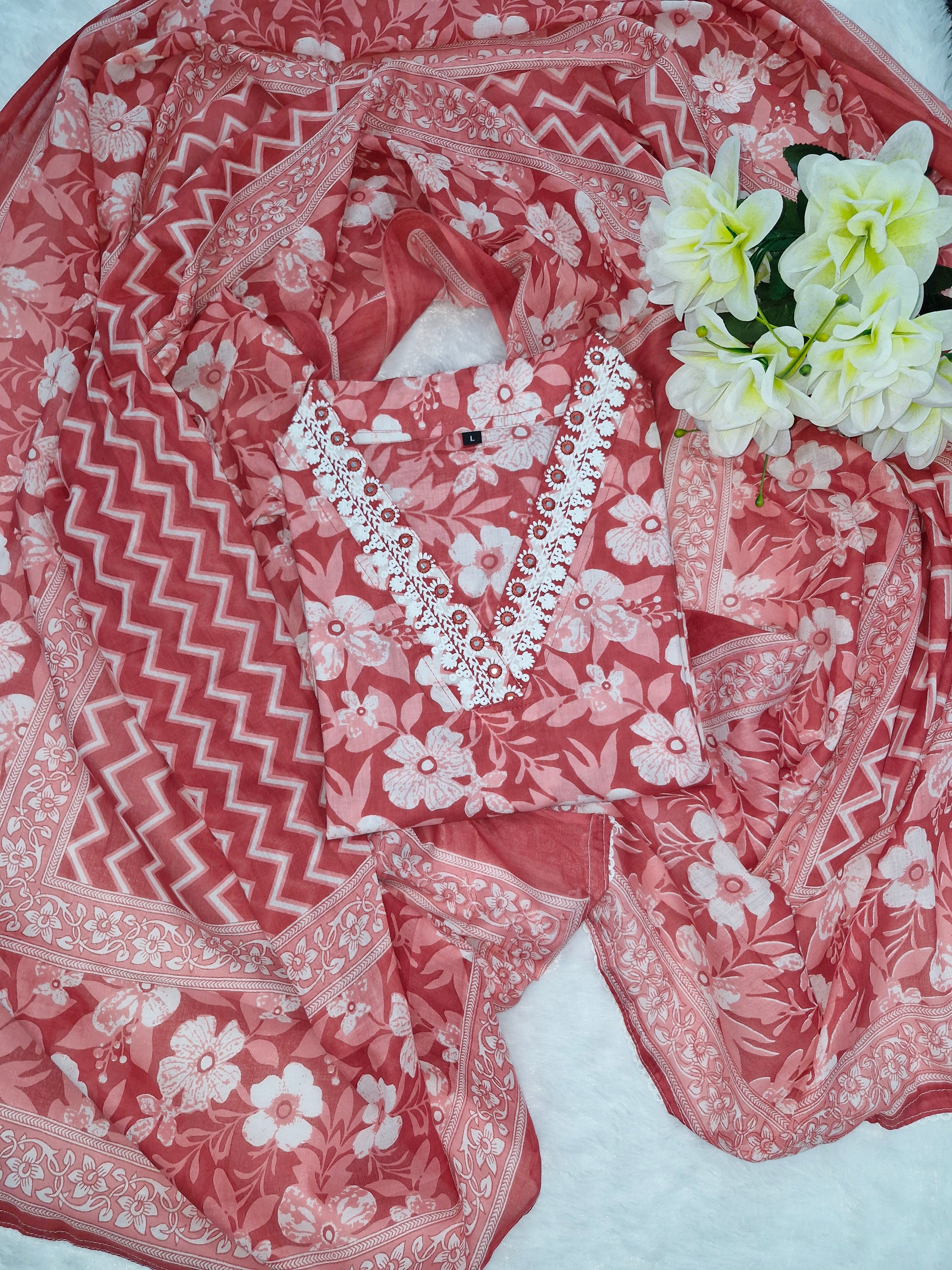 This exquisite three-piece suit is made from 100% pure cotton, providing unbeatable comfort and style. The kurta showcases a charming floral print in white on a dark peach base, paired with intricate embroidery around the V-neckline, giving the outfit a delicate handcrafted touch. The set includes a matching cotton dupatta with a floral border and a peach-and-white zigzag patterned bottom, adding a modern twist to the traditional look.