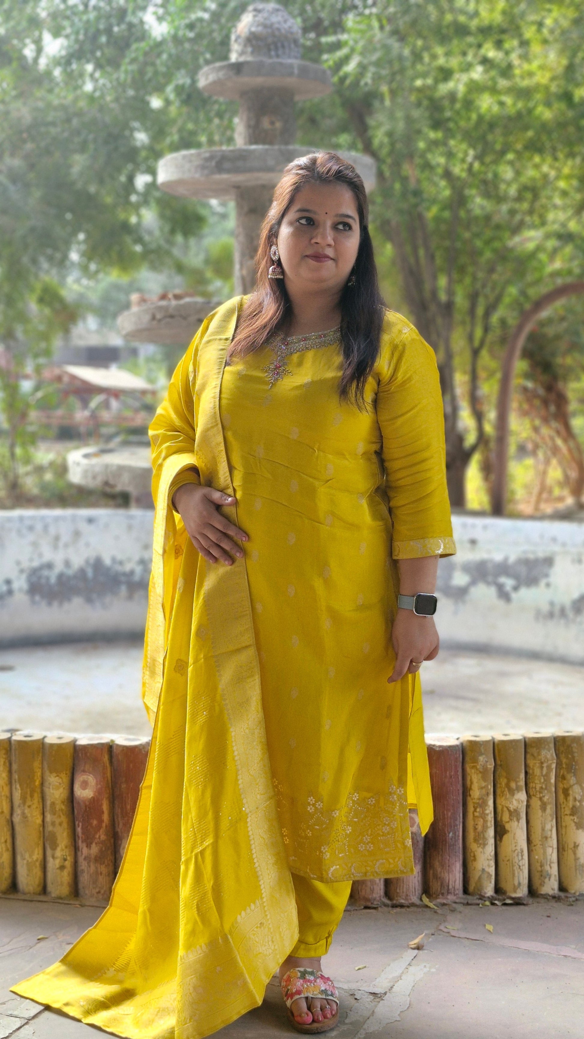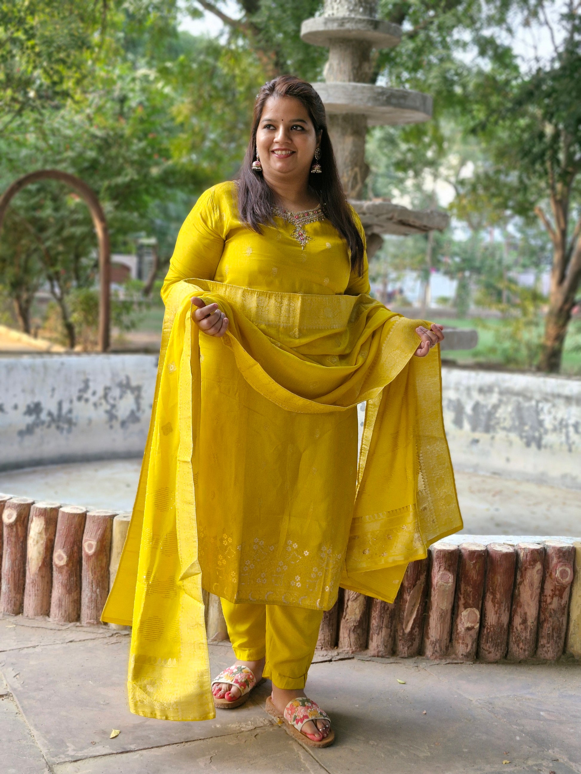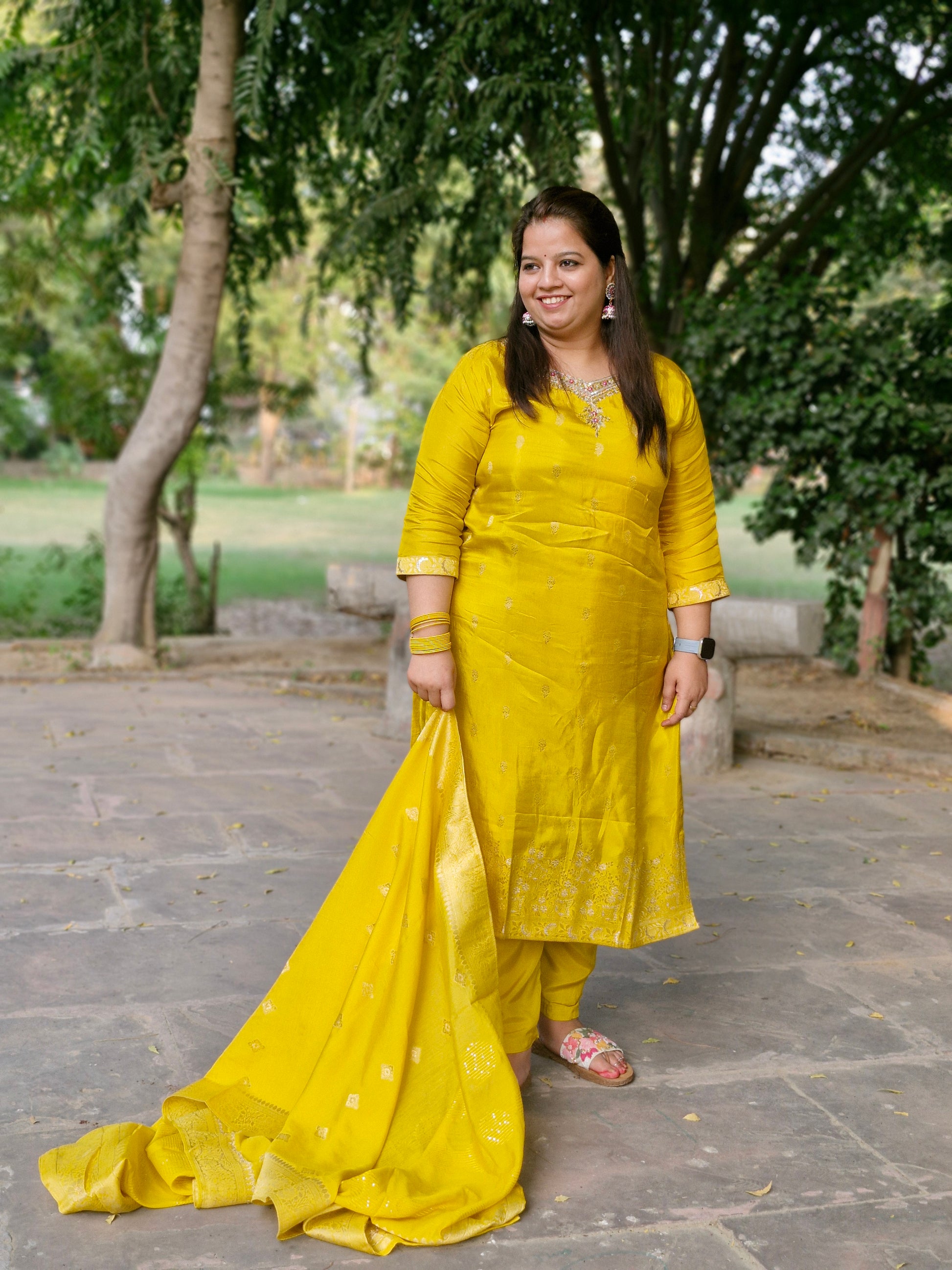 - Exquisite yellow silk salwar suit, perfect for festive occasions and celebrations.