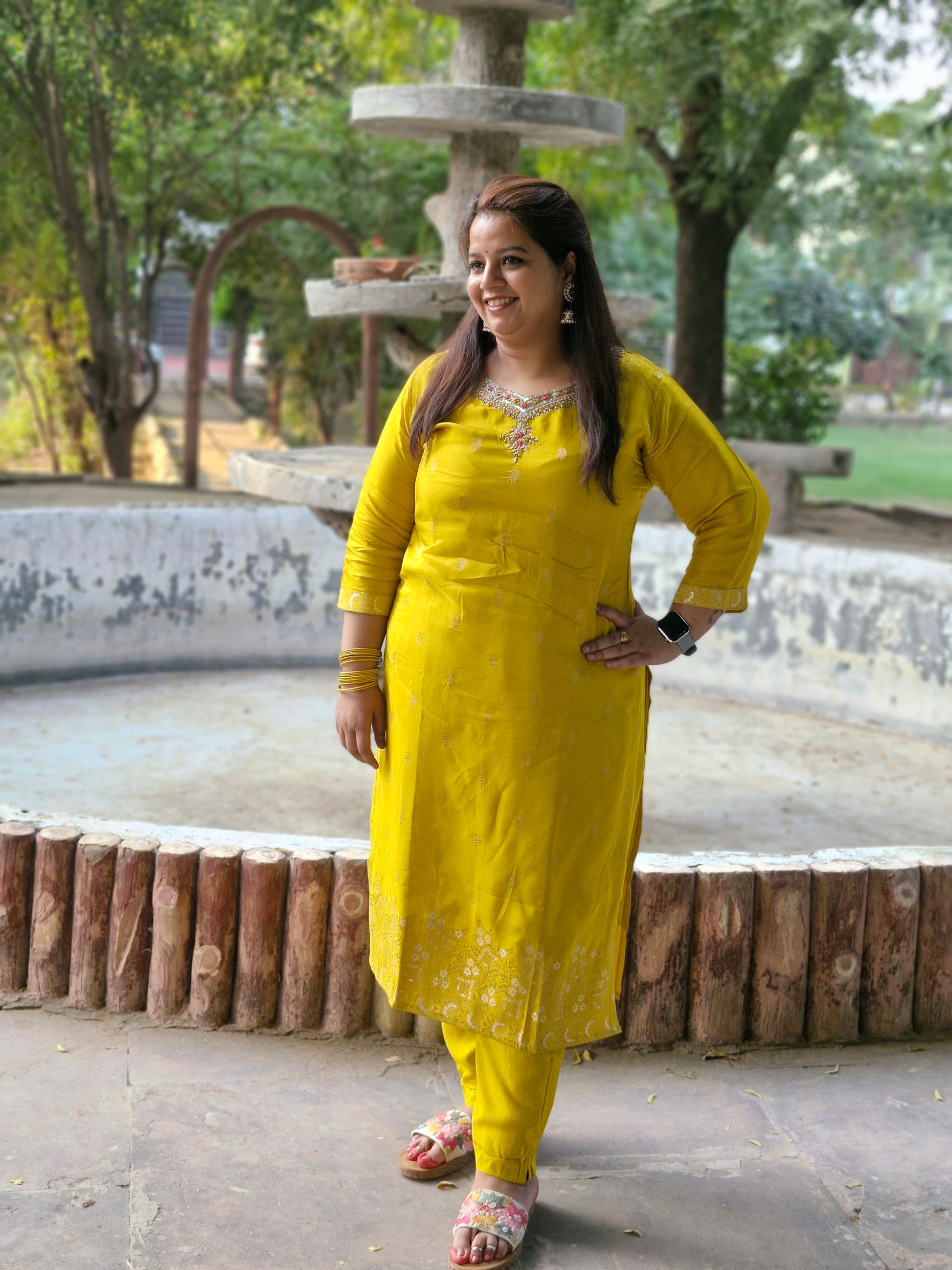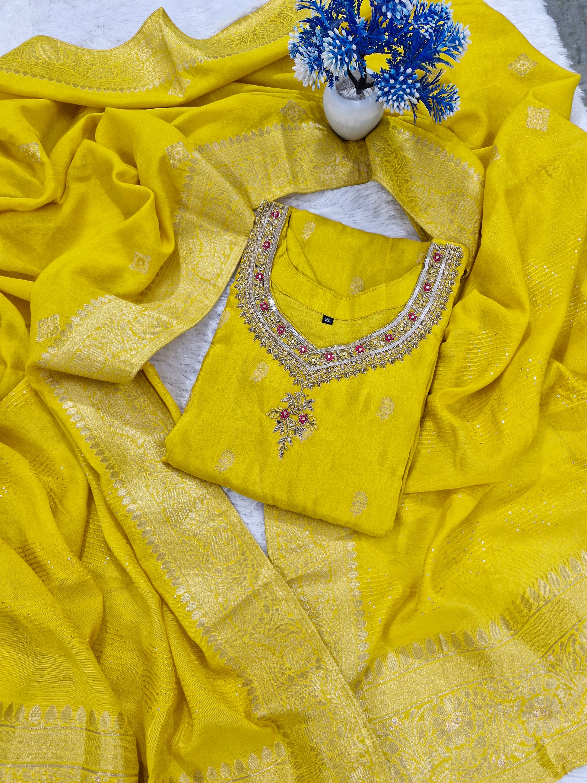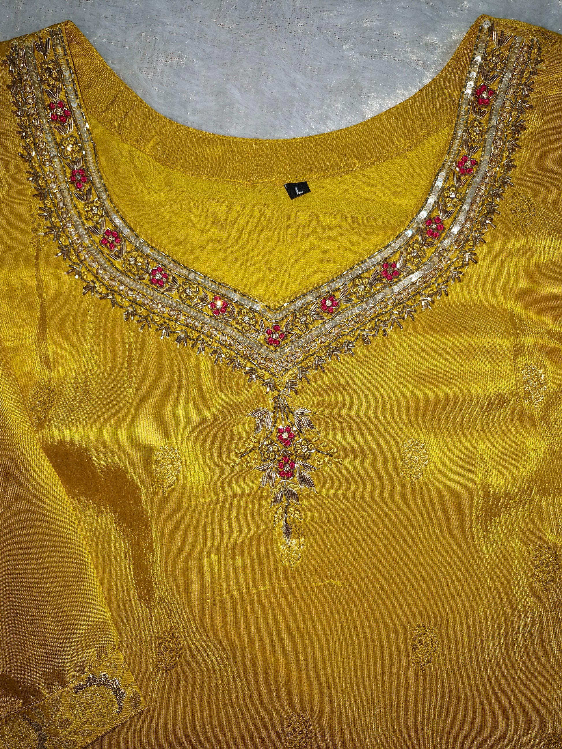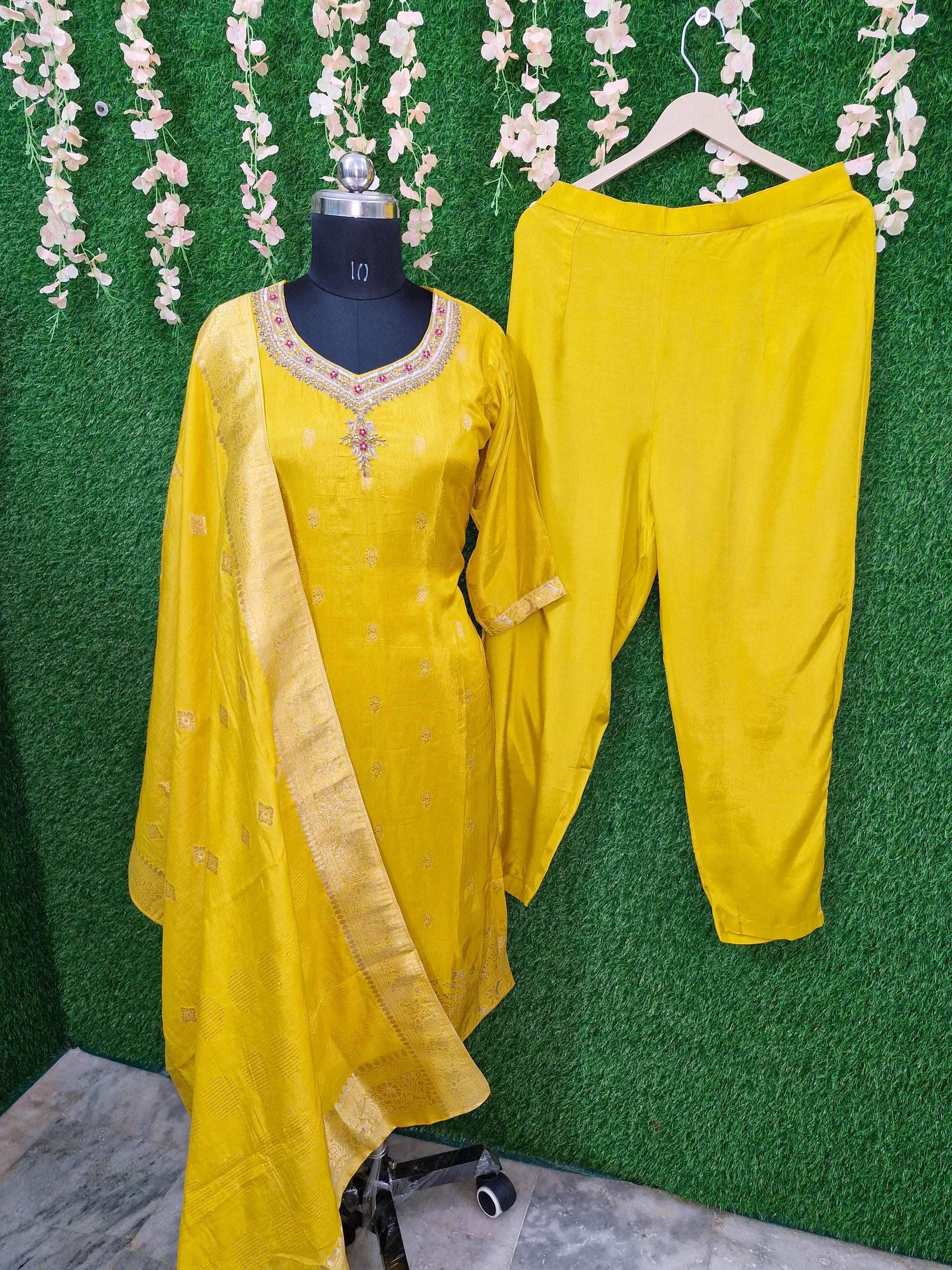 - Exquisite yellow silk salwar suit, perfect for festive occasions and celebrations.