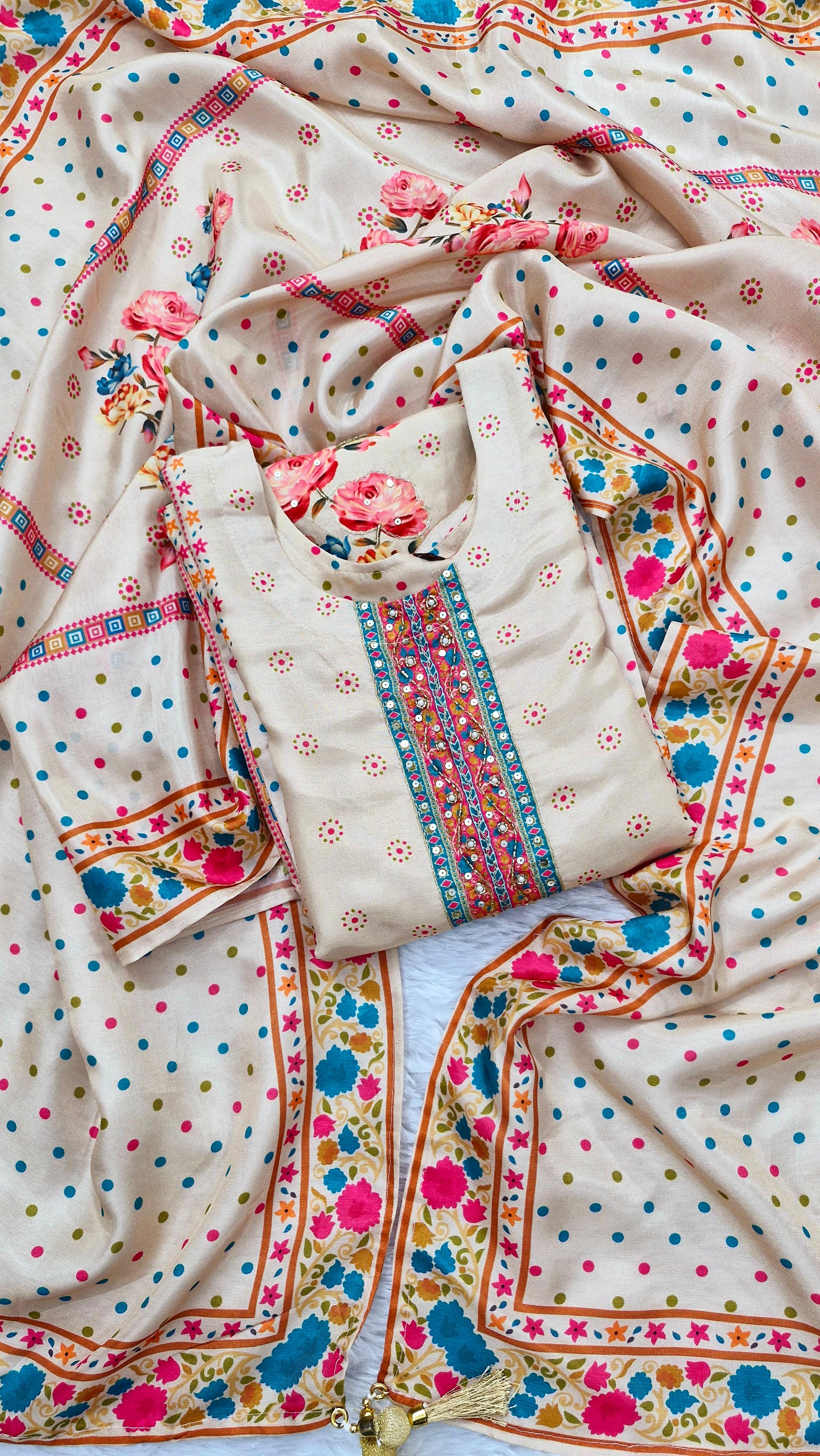 The soft beige kurta features beautifully placed rose motifs and delicate dotted accents, paired with matching silk pants that add flow and finesse. The highlight is the opulent dupatta—lavishly printed with floral borders and vibrant polka dots, adding a splash of color and sophistication.