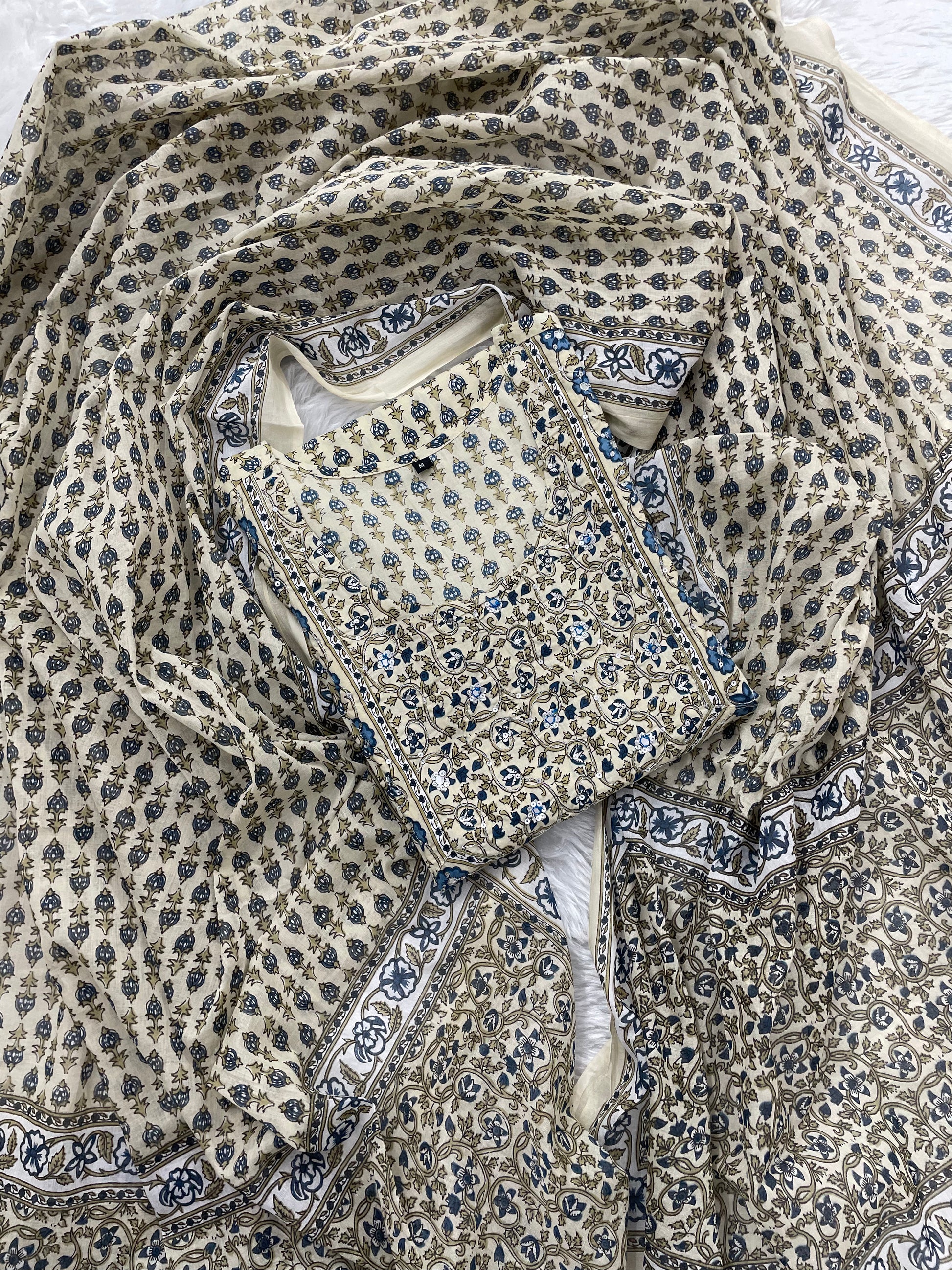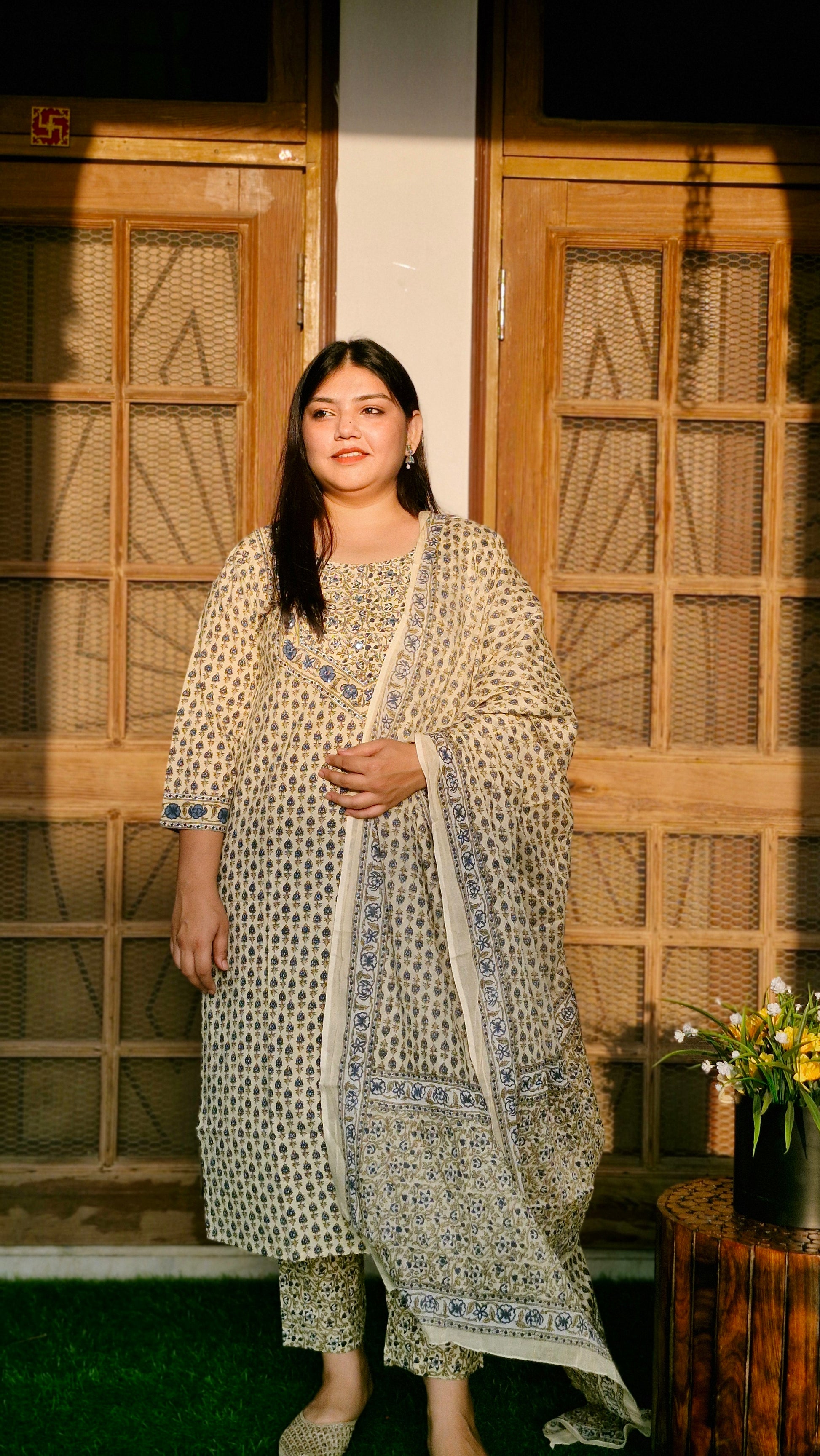 The straight-fit kurta features intricate hand-block floral motifs in earthy indigo and beige tones, complemented by a delicately embroidered neckline that adds just the right amount of detail. The matching printed pants offer a coordinated finish, while the soft cotton dupatta with its elegant border work completes the ensemble with finesse.