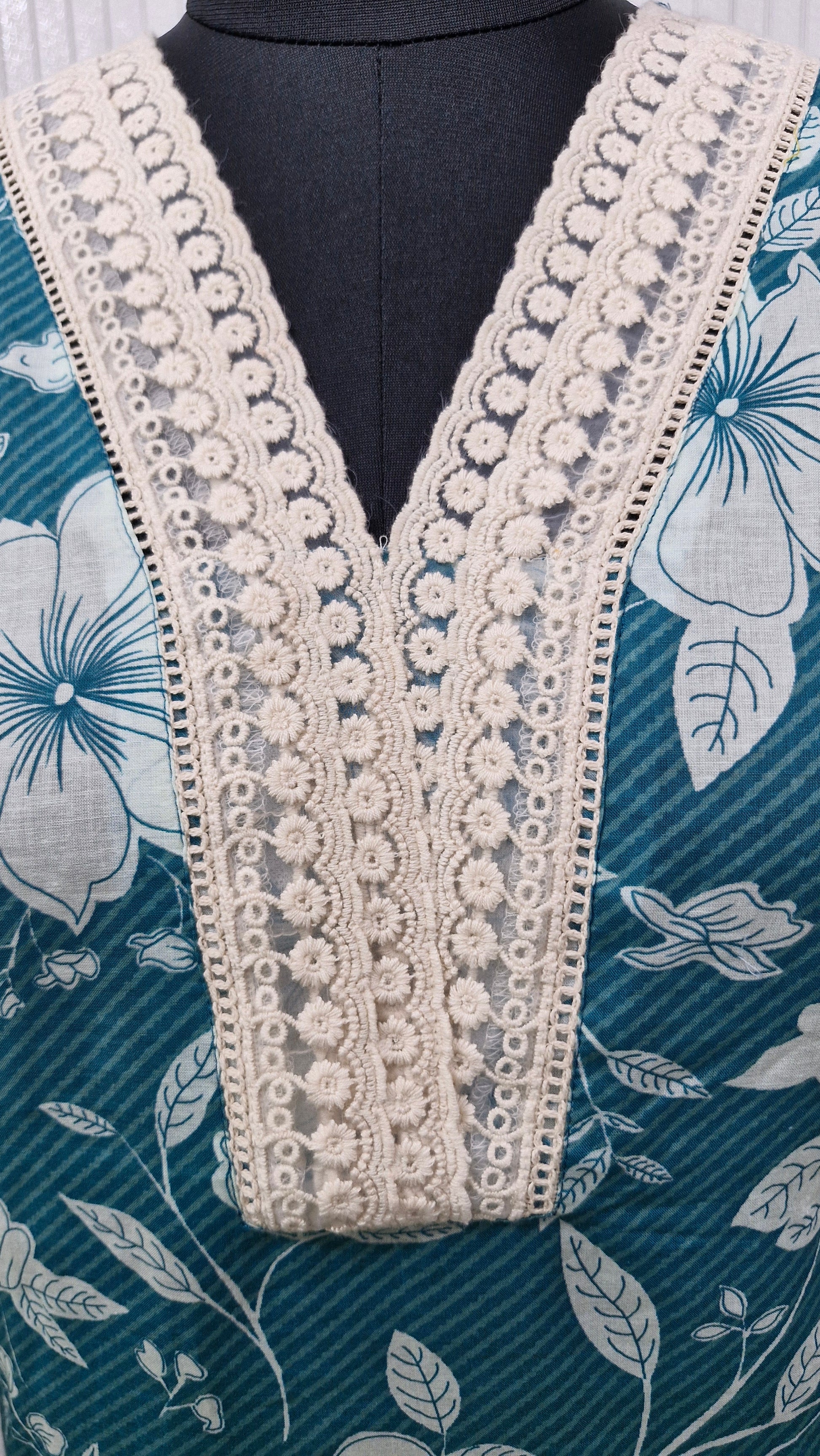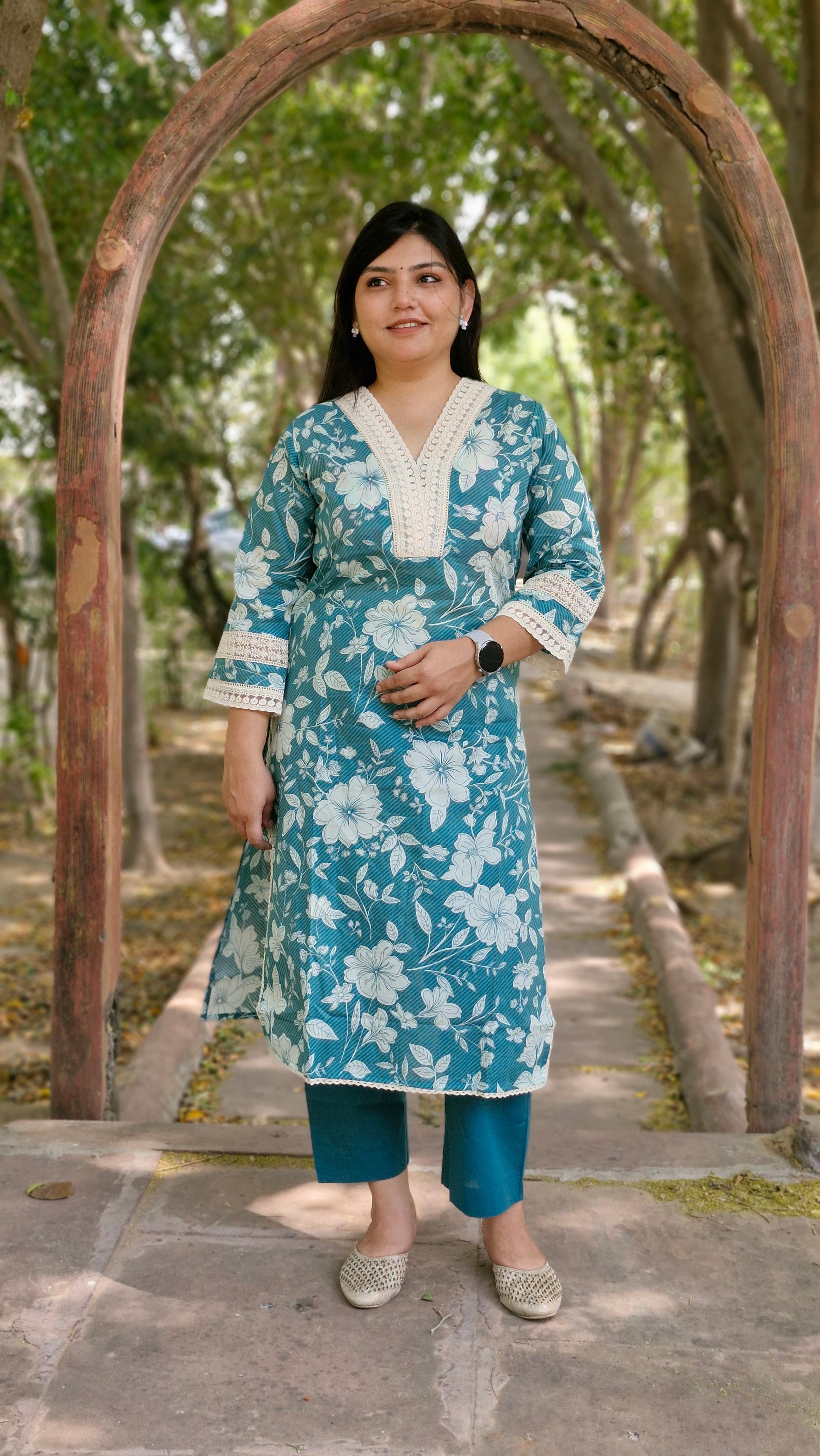 Grace meets freshness in our Gulnoor three-piece suit set, designed in a serene teal tone with soft floral prints all over. Crafted in breathable cotton, the kurta features intricate lacework around the neckline and sleeves, adding a subtle touch of elegance. The floral-print dupatta with striped elements complements the solid straight-fit pants beautifully.