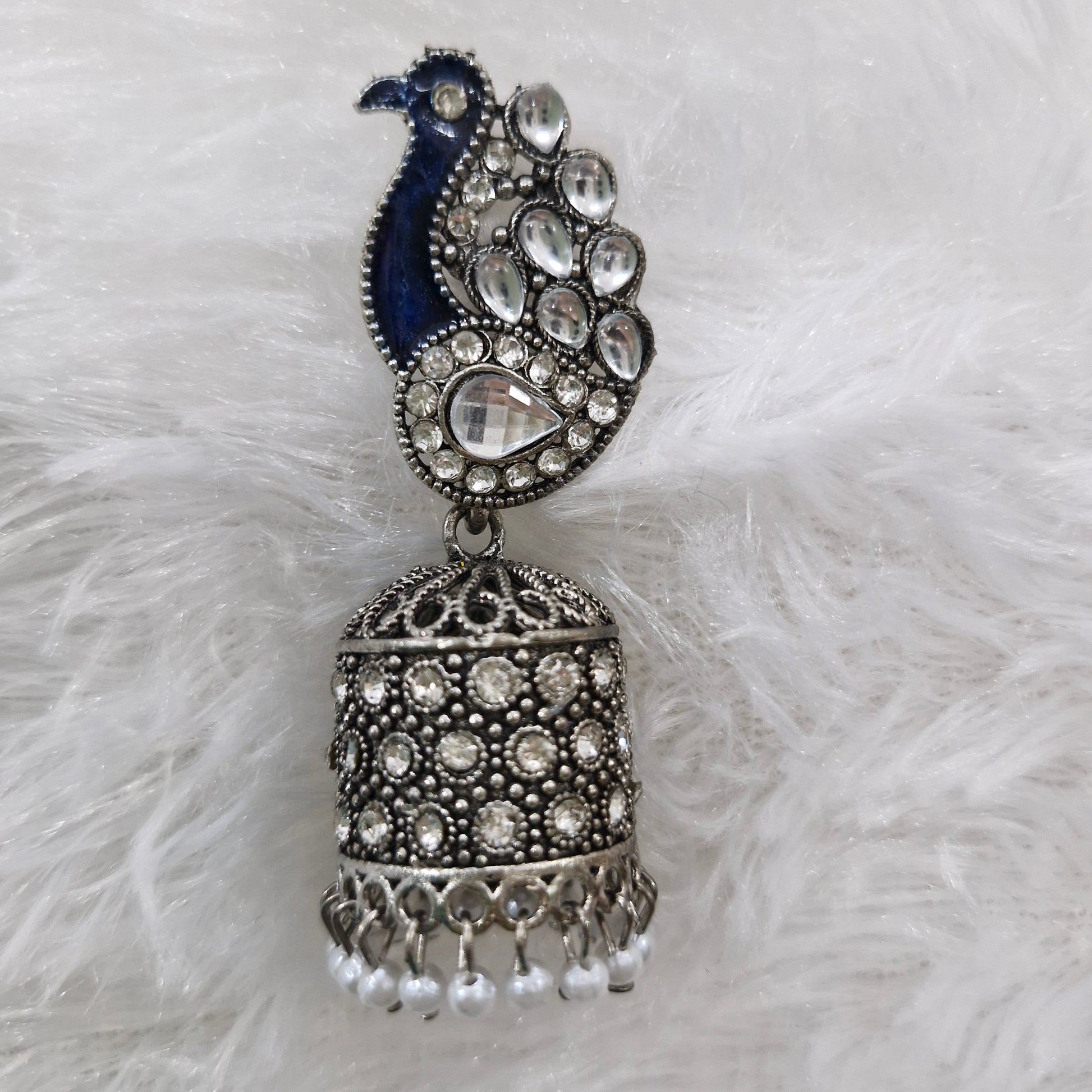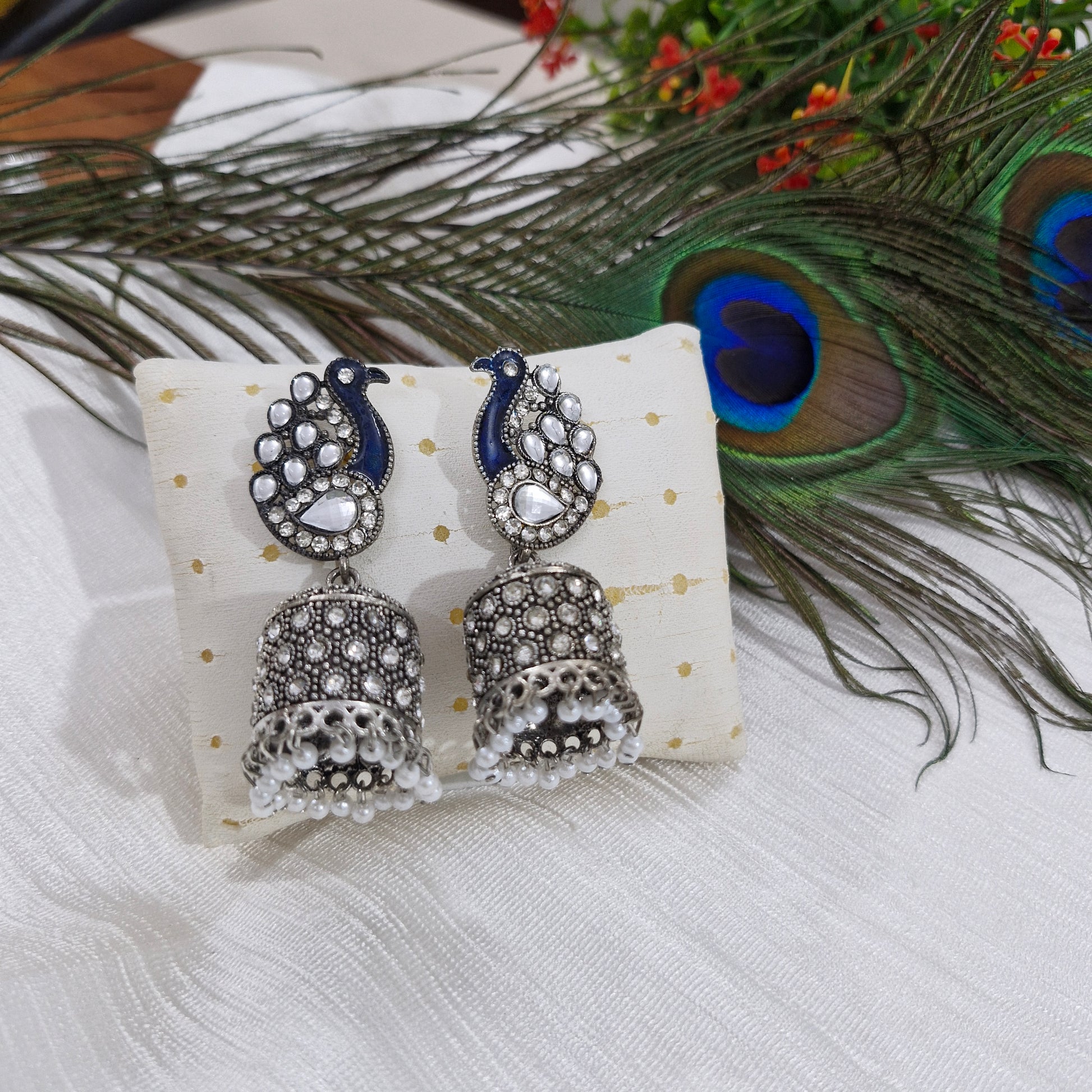 - Design: Peacock motif stud with traditional jhumka bell