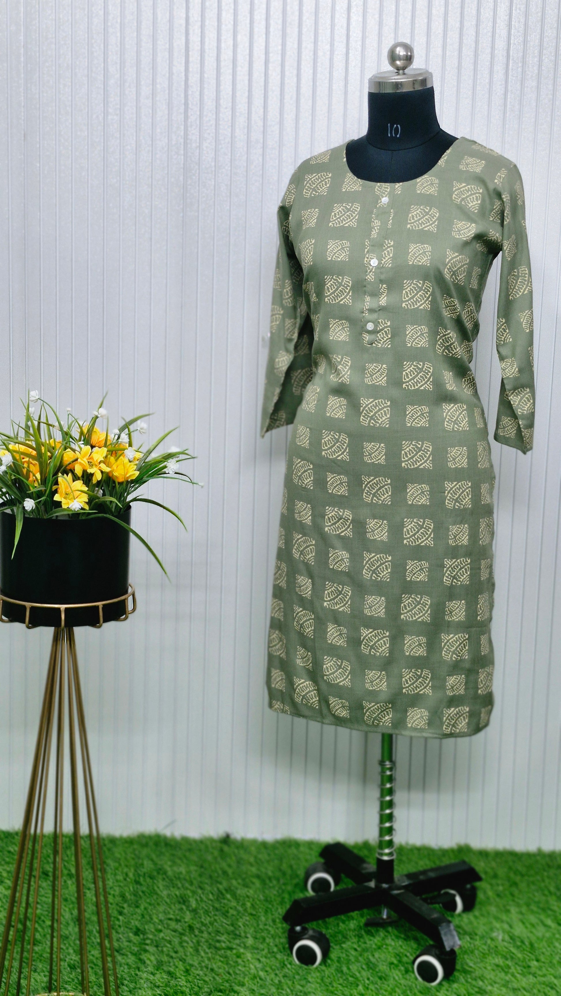 The kurta features a symmetrical grid of rustic block motifs in beige, perfectly balancing boldness with subtlety. Paired with comfortable matching pants adorned in miniature butis, this set offers an earthy, elegant vibe that's perfect for everyday wear or casual get-togethers.