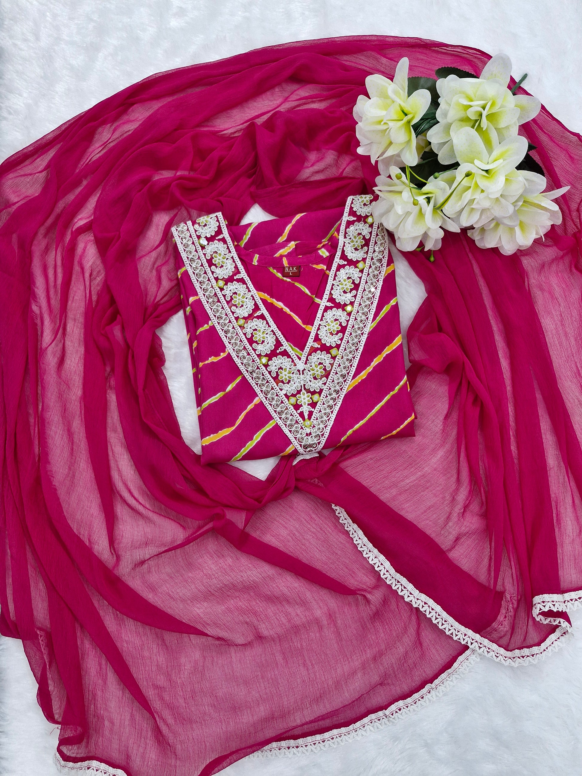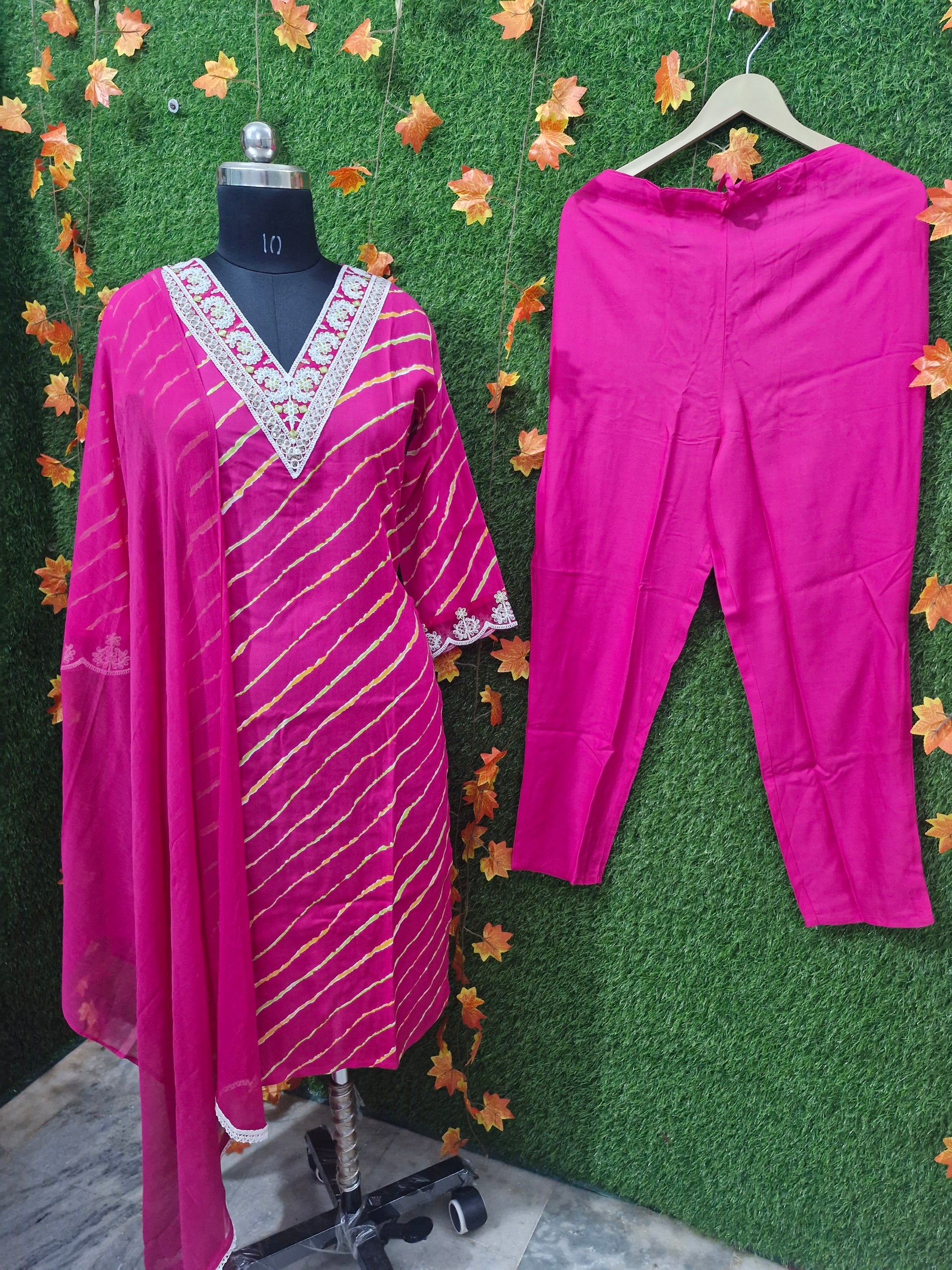 This product is a stunning three-piece suit featuring a magenta Bandhani print kurta, matching bottoms, and a complementing dupatta. The kurta showcases diagonal Bandhani-style stripes in shades of yellow, green, and white, giving it a vibrant and traditional aesthetic. The neckline is adorned with intricate floral embroidery in white and gold, which extends to the sleeve cuffs for added elegance.