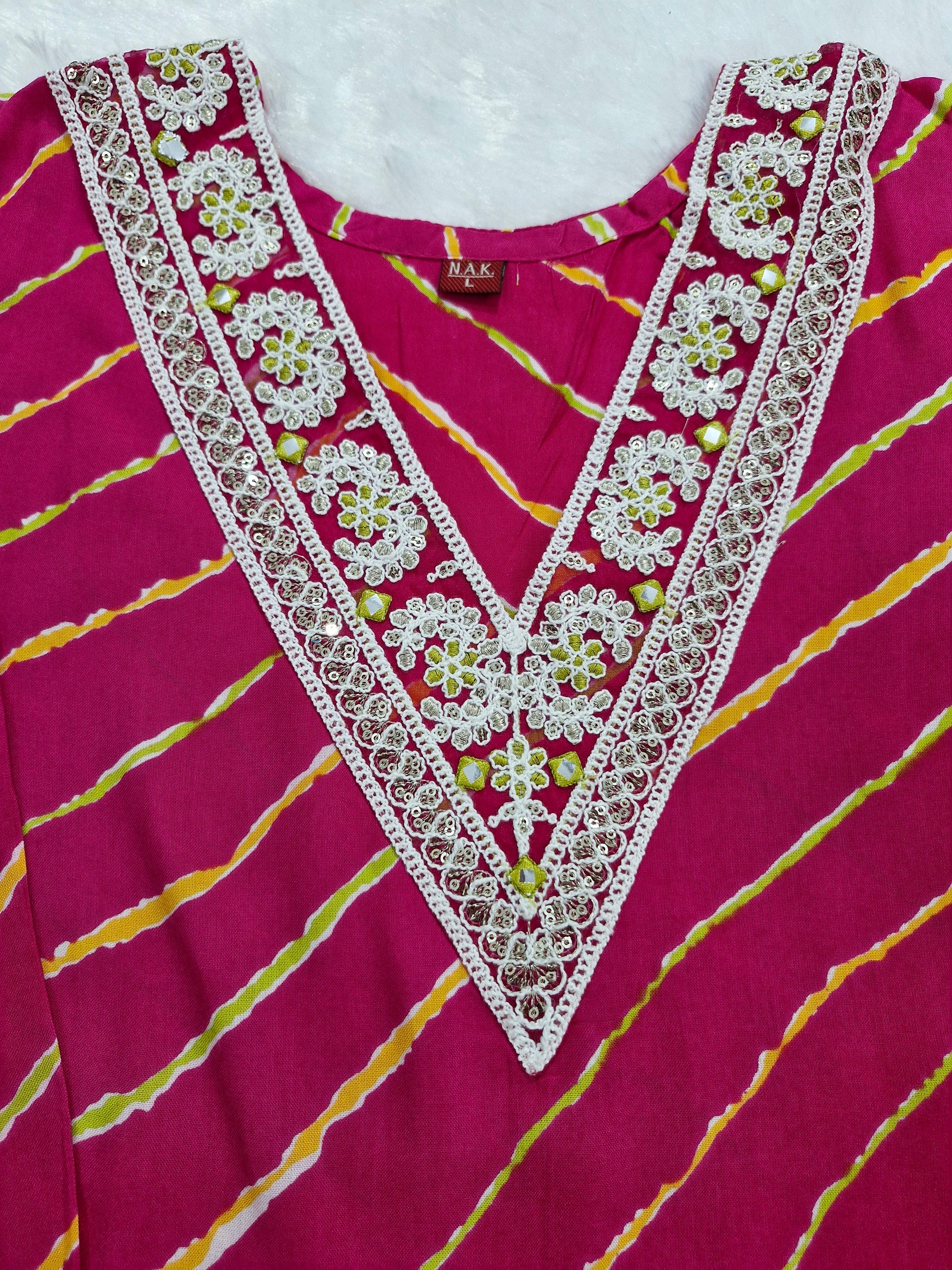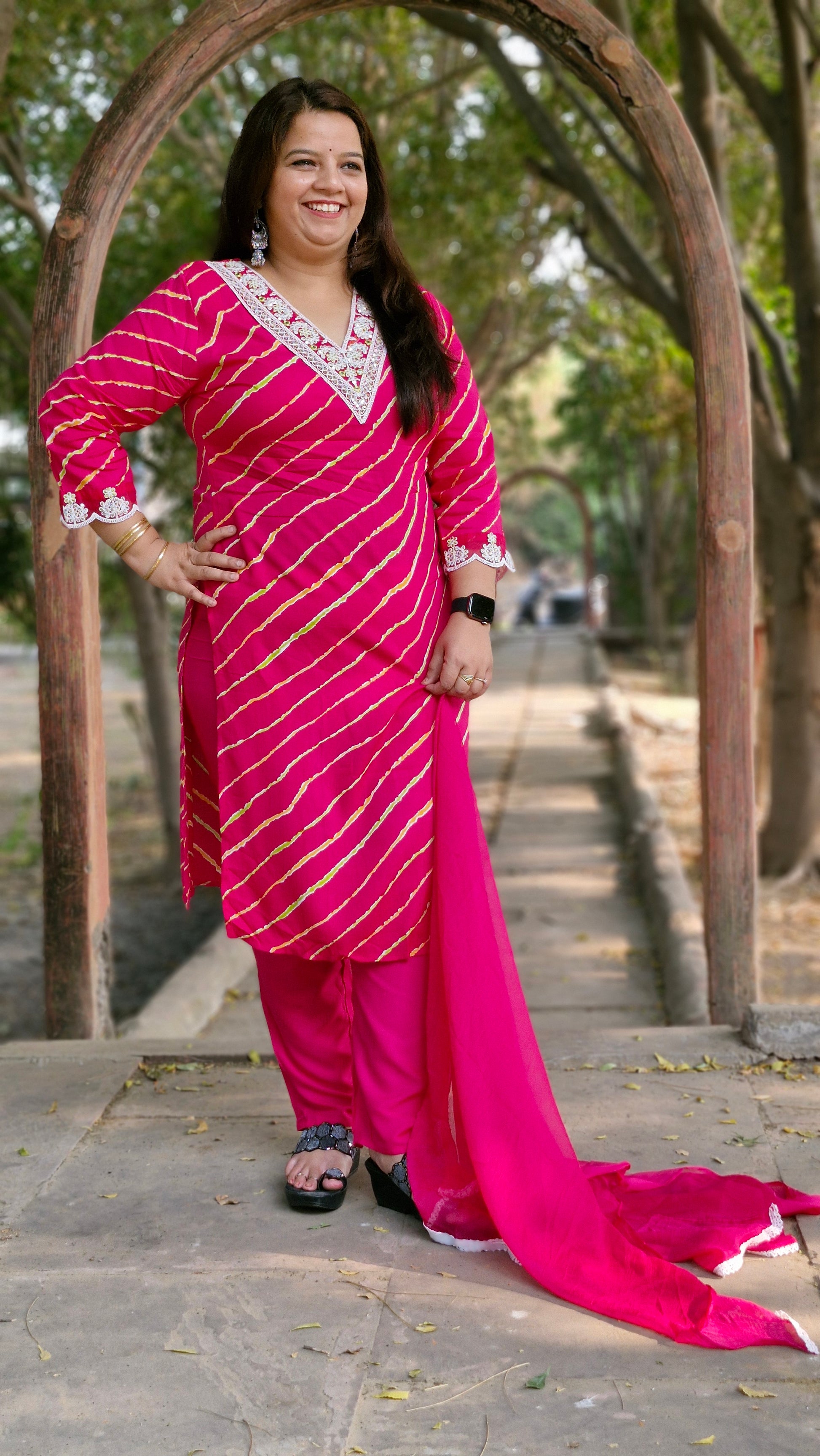 - Kurta: Magenta with diagonal Bandhani-style stripes, and a V-shaped neckline highlighted by delicate white and gold floral embroidery.