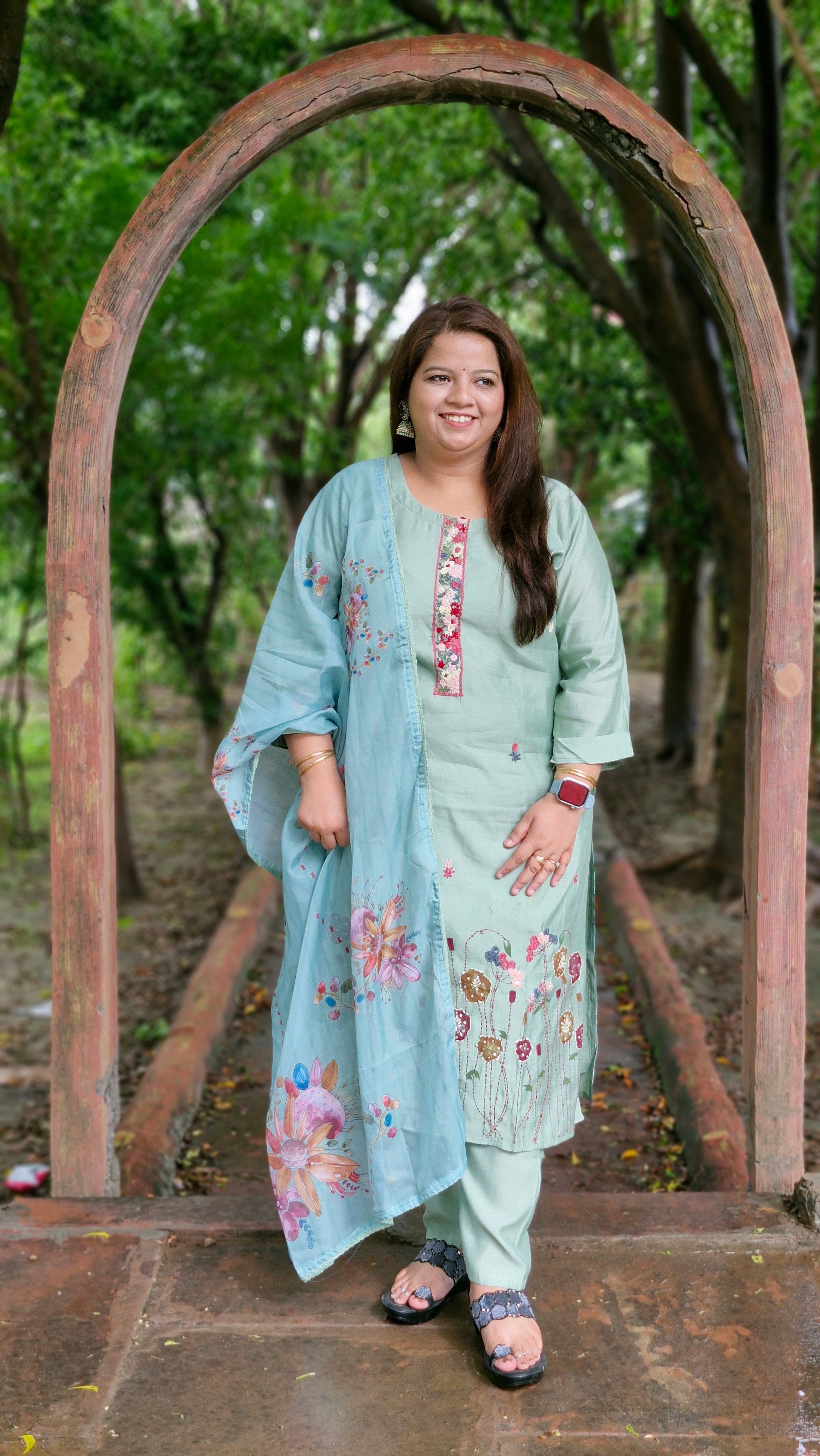 Mint Blossom – Embroidered Cotton Silk Suit Set