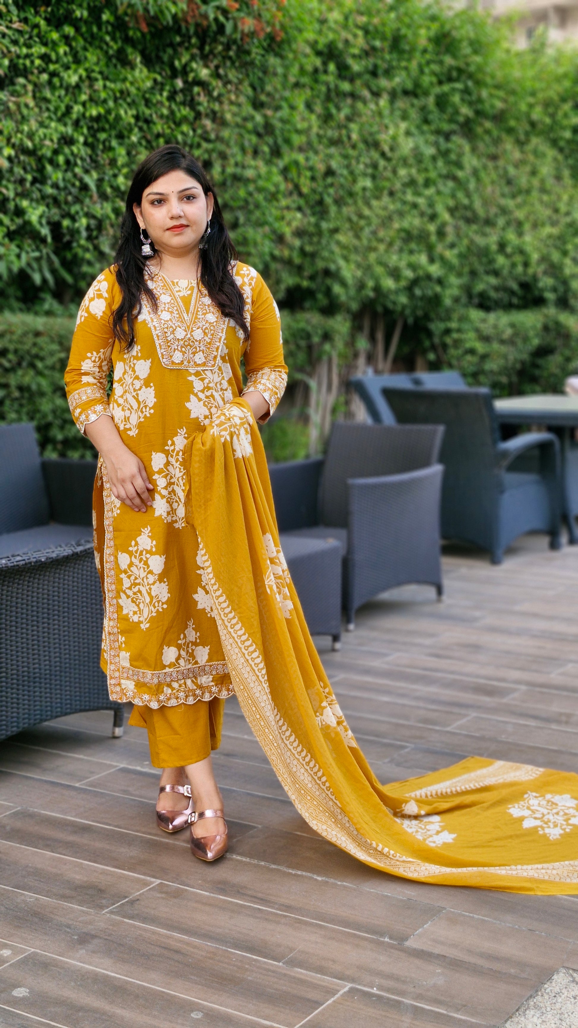 Paired with matching cotton bottoms and a coordinated printed dupatta, this ensemble is ideal for festive celebrations, family gatherings, or casual outings. Its vibrant mustard hue radiates warmth and confidence, making it a standout piece for all occasions.