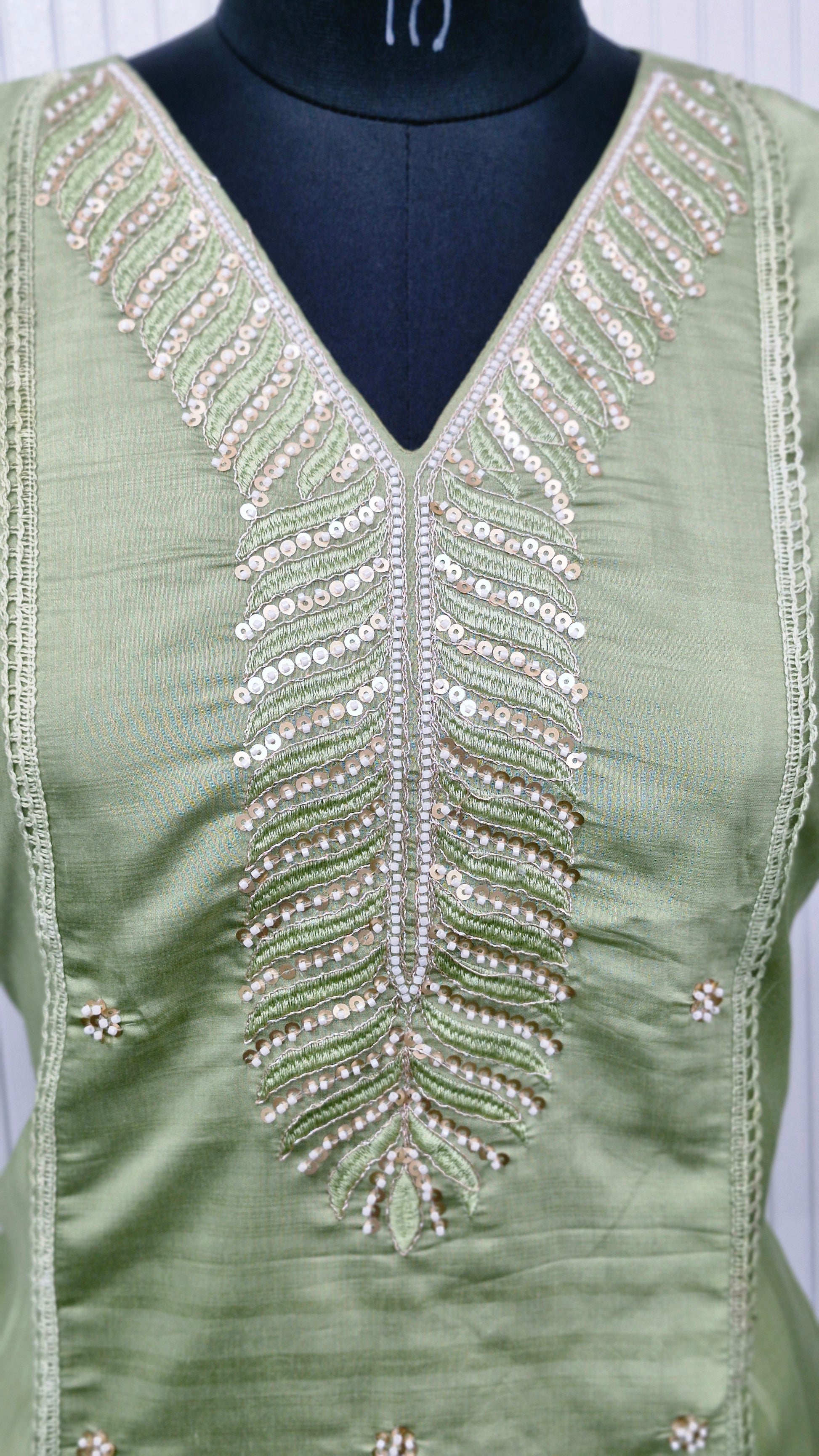 Step into effortless grace with our Noor-e-Pista three-piece suit set in a soothing pista green hue. This ensemble features delicate thread and mirror detailing along the neckline and hem, giving it a refined festive charm. Paired with straight-fit bottoms and a flowy dupatta, this look blends simplicity and sophistication beautifully.