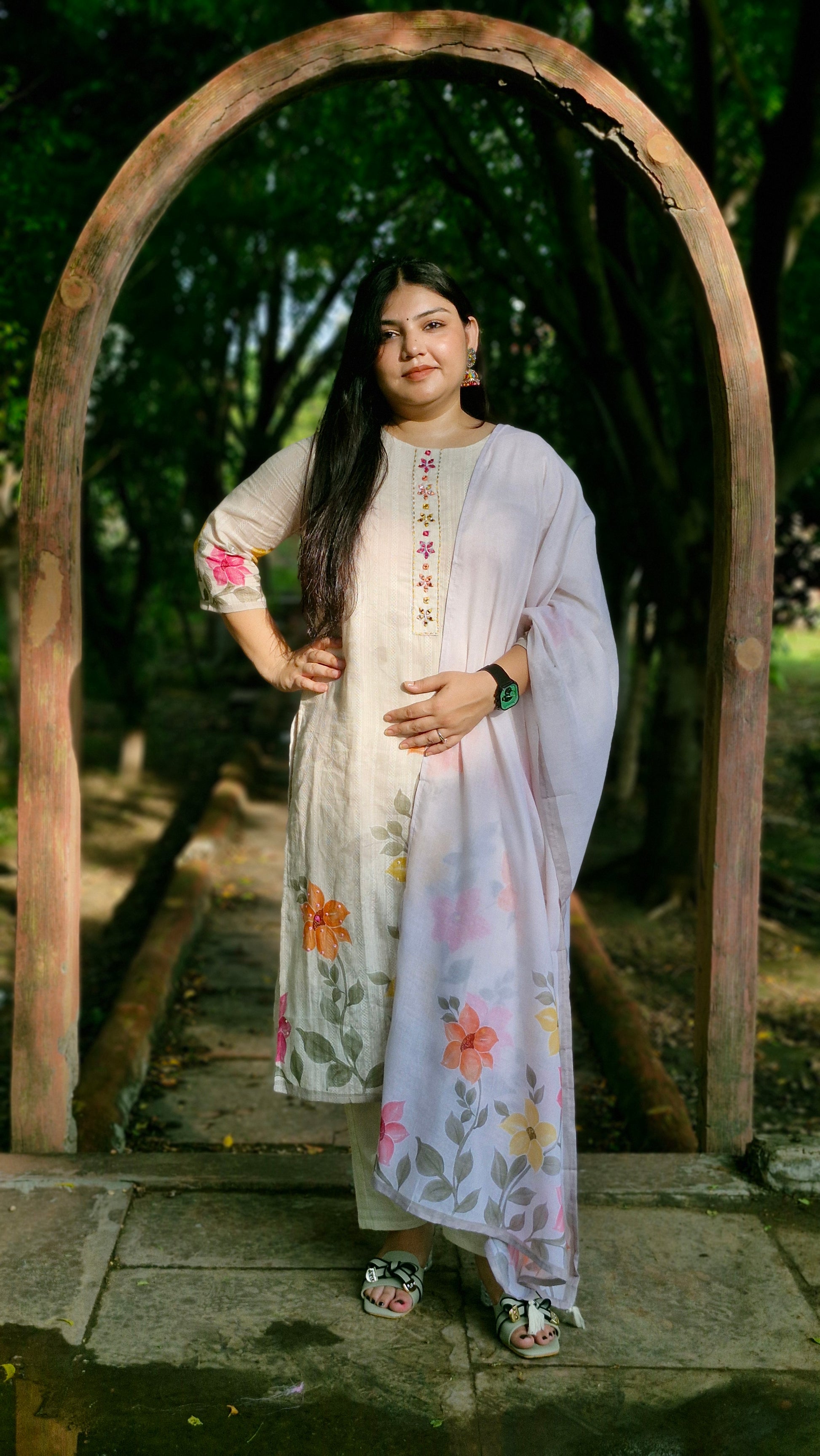 The light cotton dupatta is soft to drape and carries the same floral motif