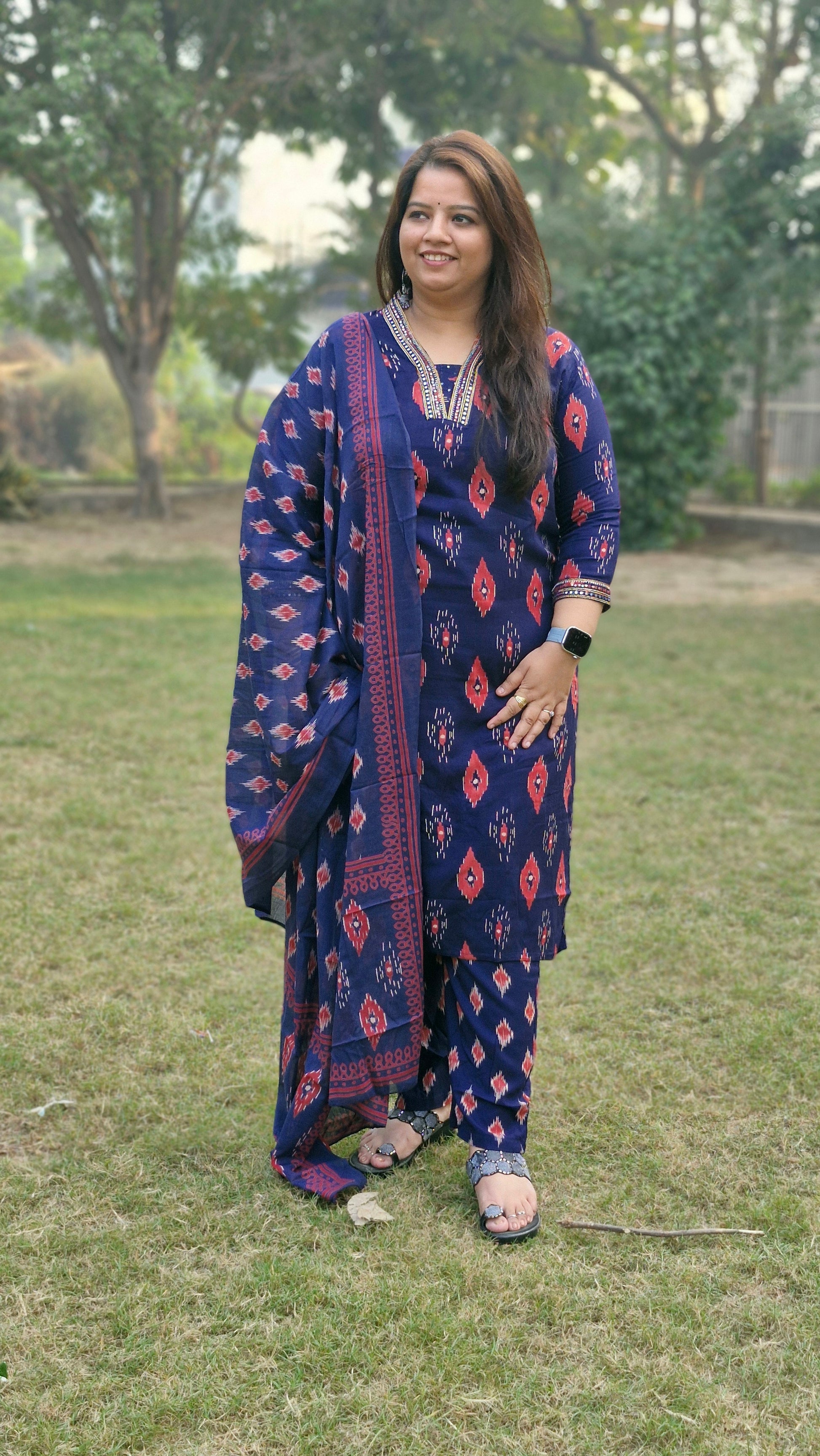 - Dupatta: The navy blue dupatta, decorated with the same Ikat-inspired print and bordered with fine detailing, completes the outfit with grace and charm.