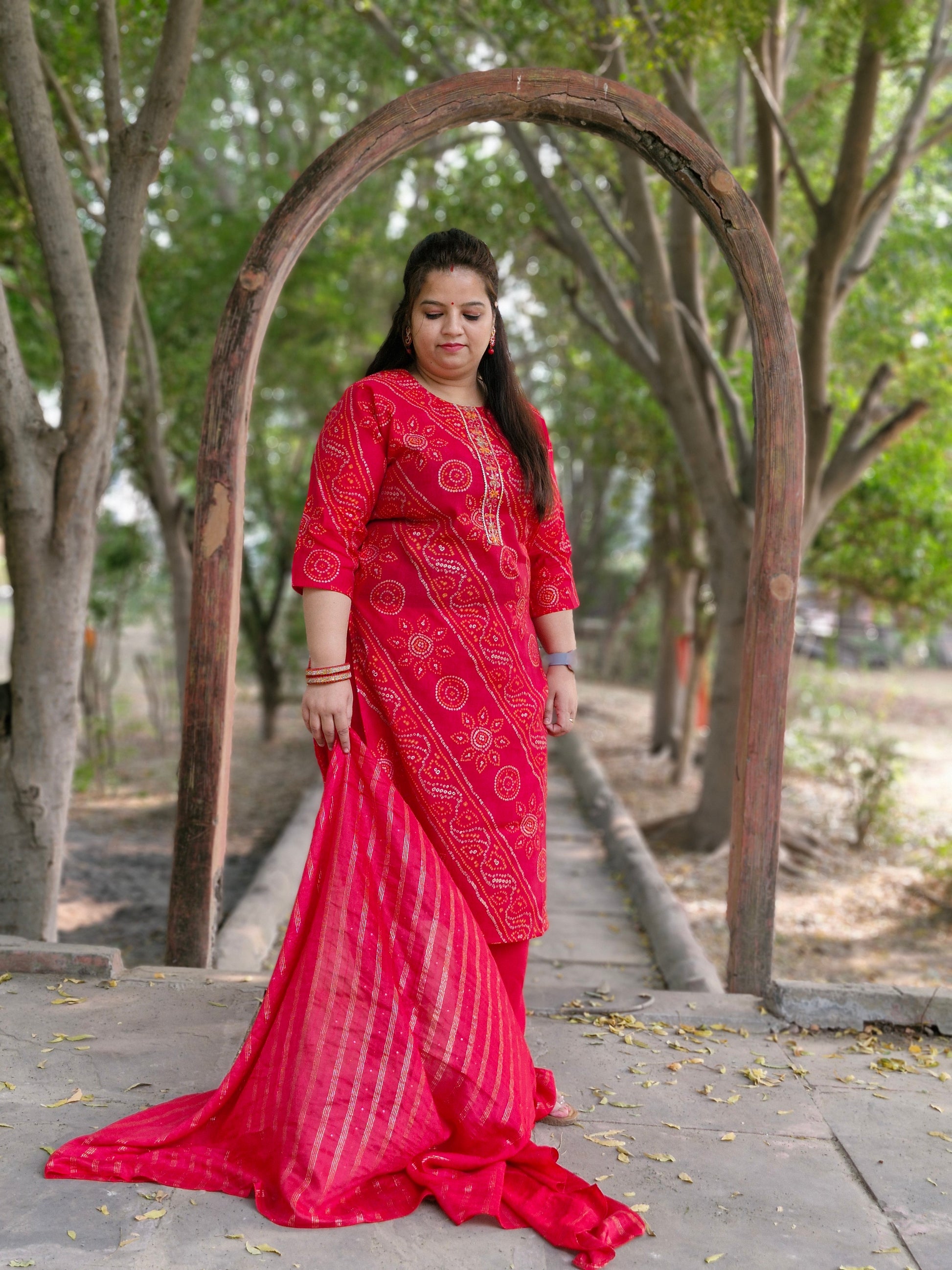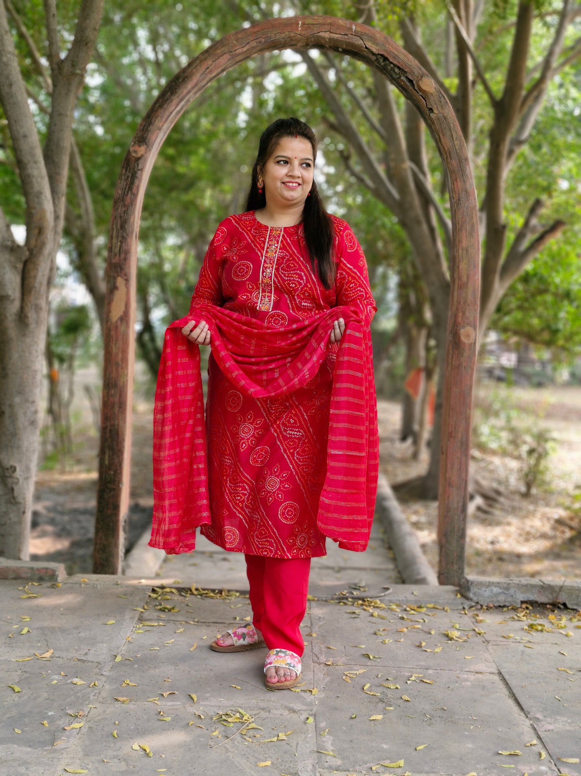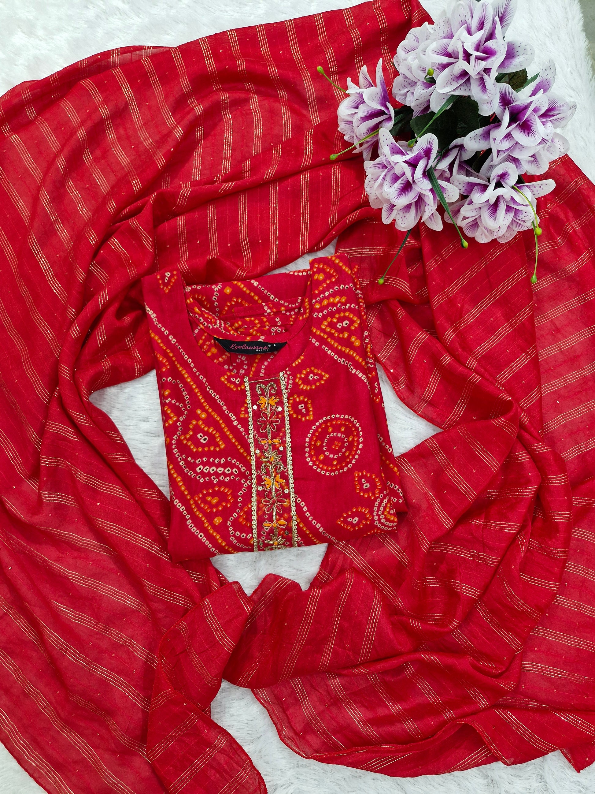 - Color: Red with traditional Bandhani print