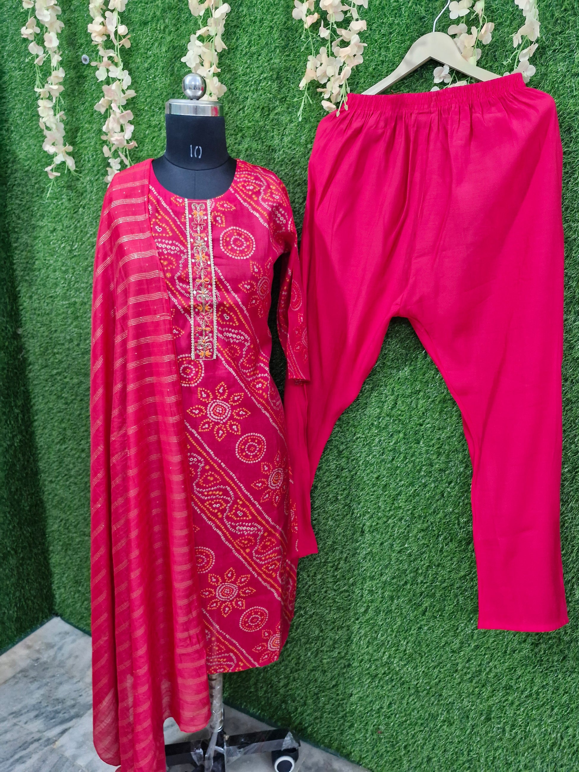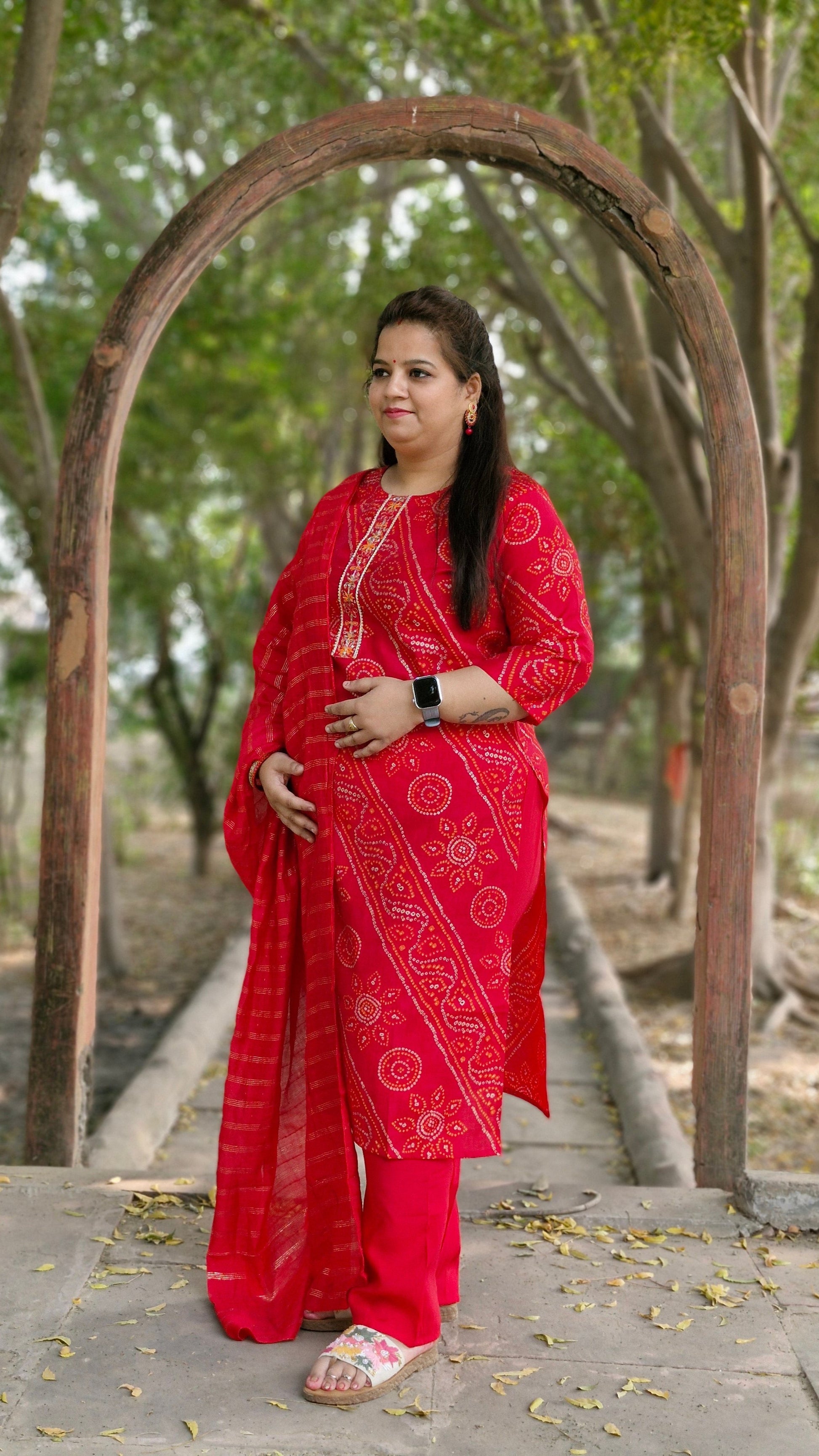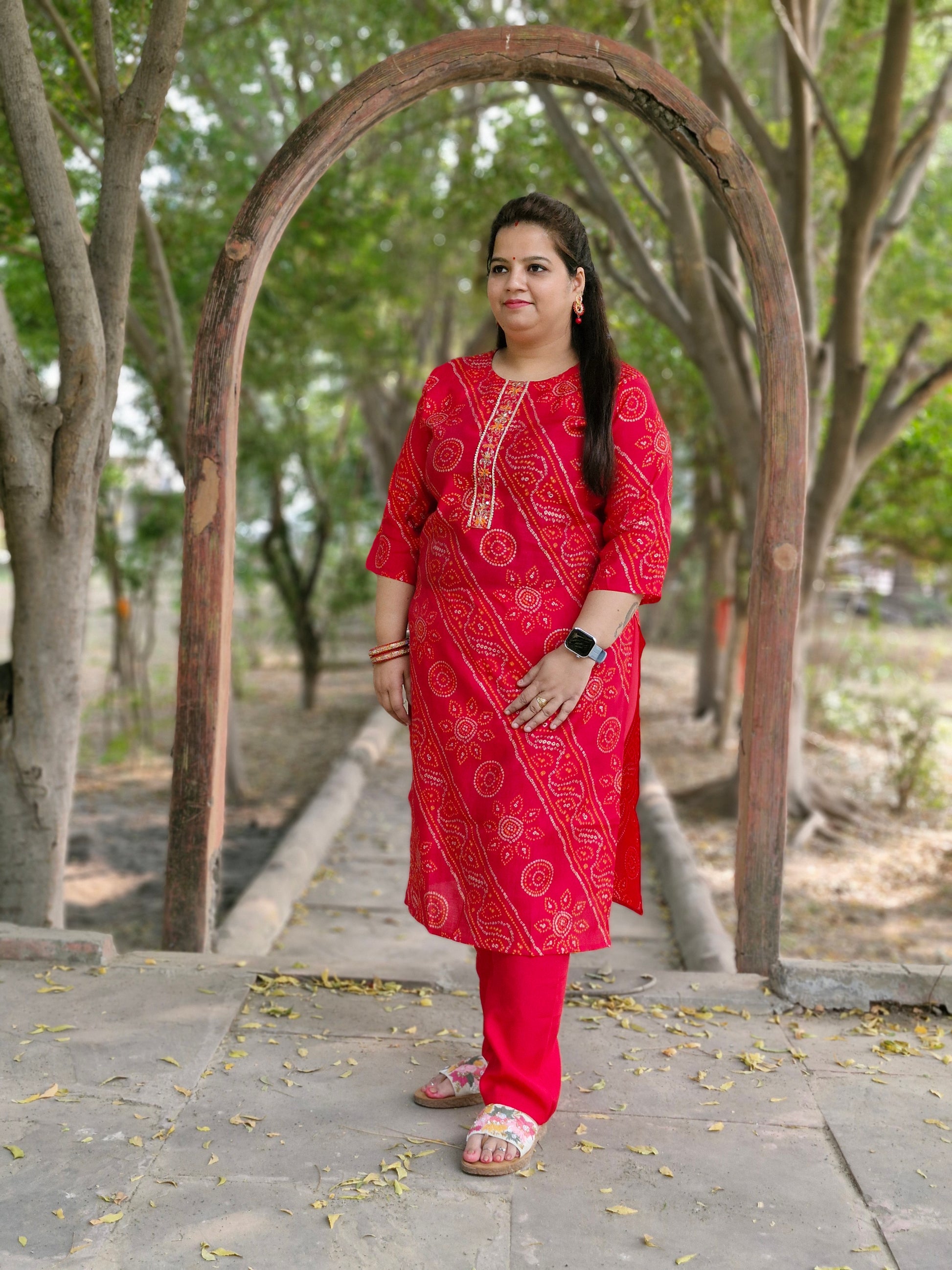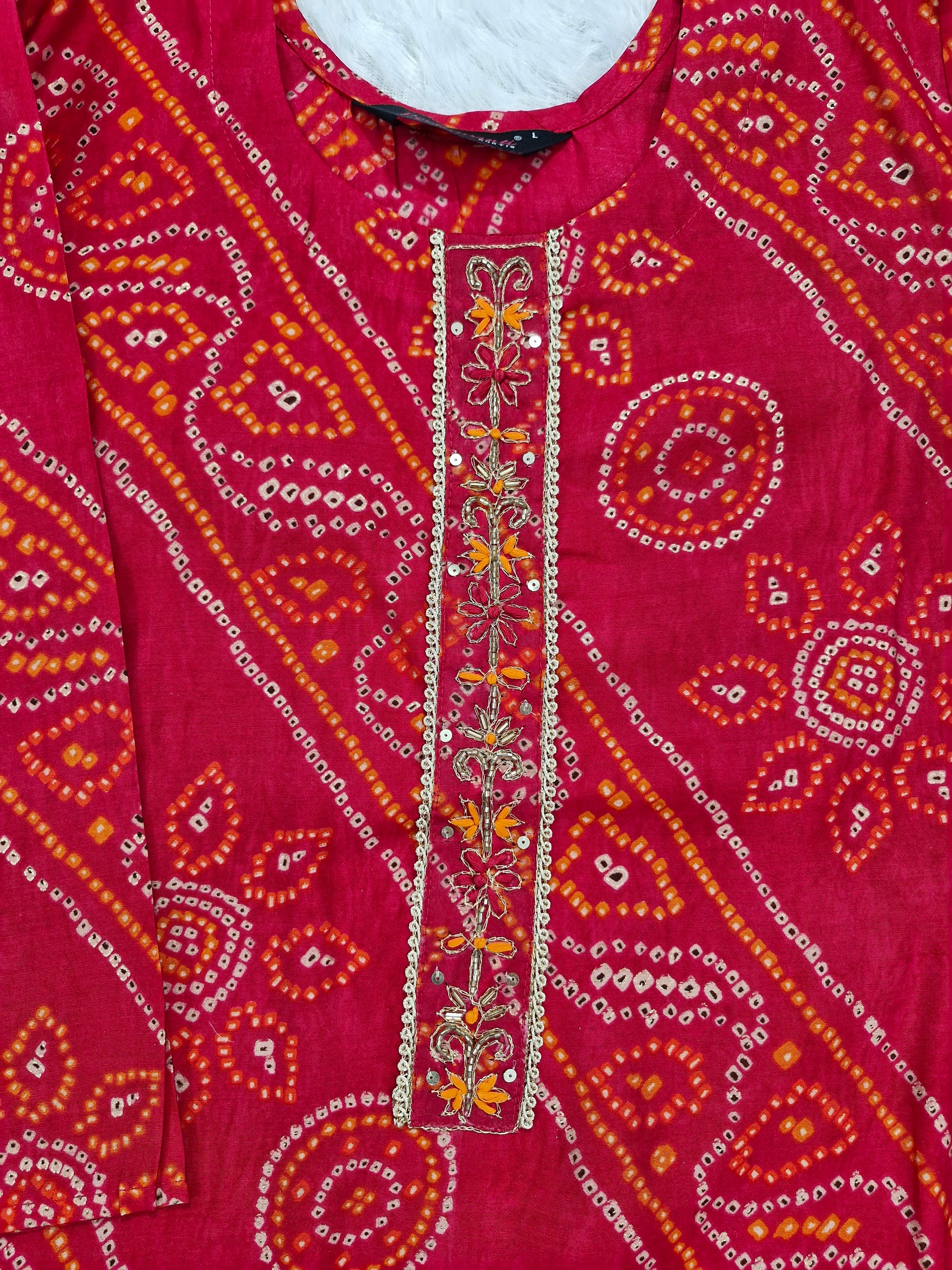 - Color: Red with traditional Bandhani print