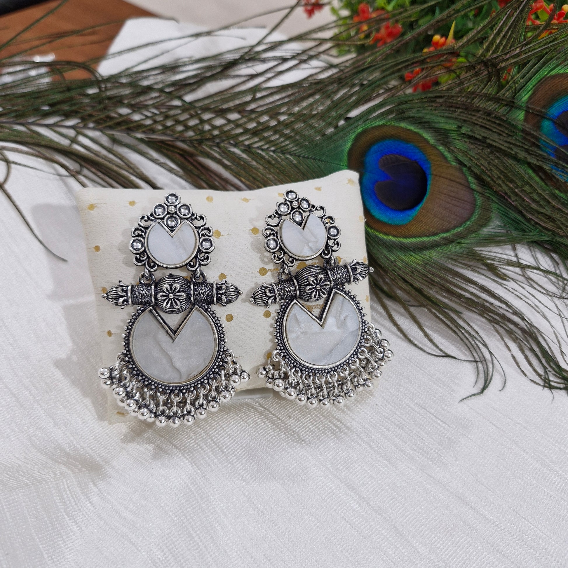 Silver-toned earrings featuring floral details, white accents, and beaded fringes. Height: 6.5 cm, Width: 4 cm.