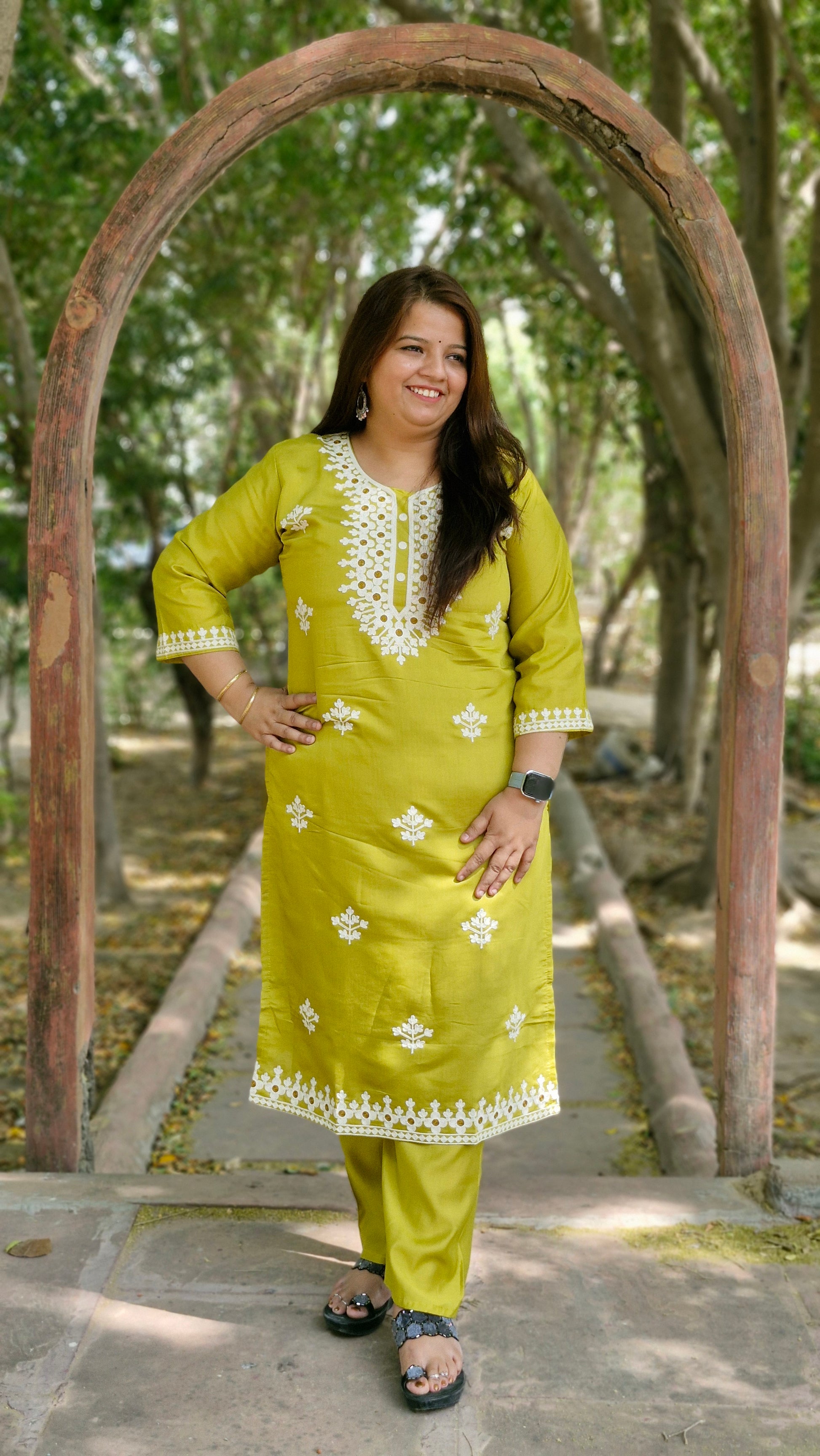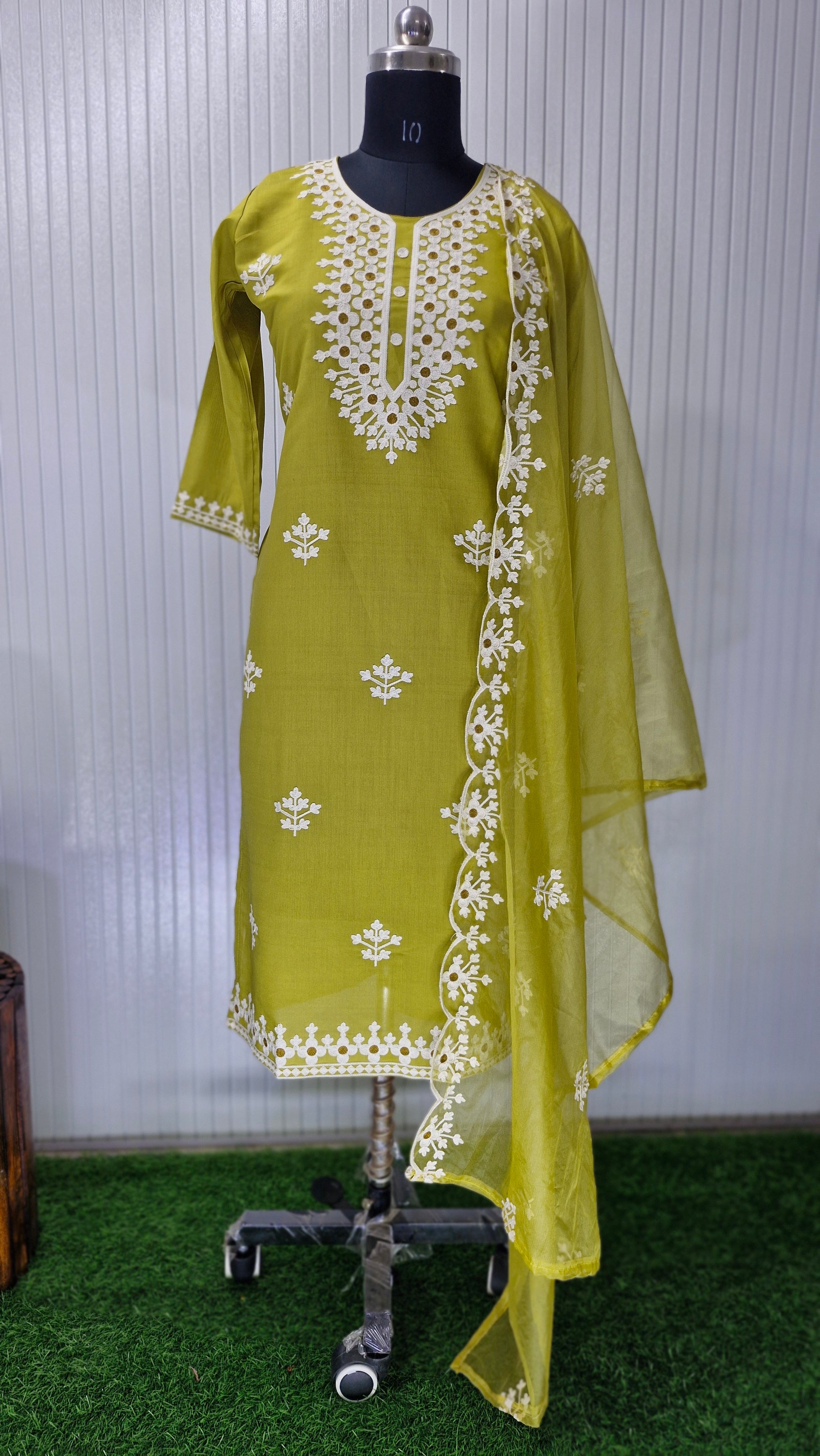 Refreshing lime green cotton suit featuring delicate white embroidery on the kurta and dupatta. Comfortable three-quarter sleeves. Perfect for casual elegance.