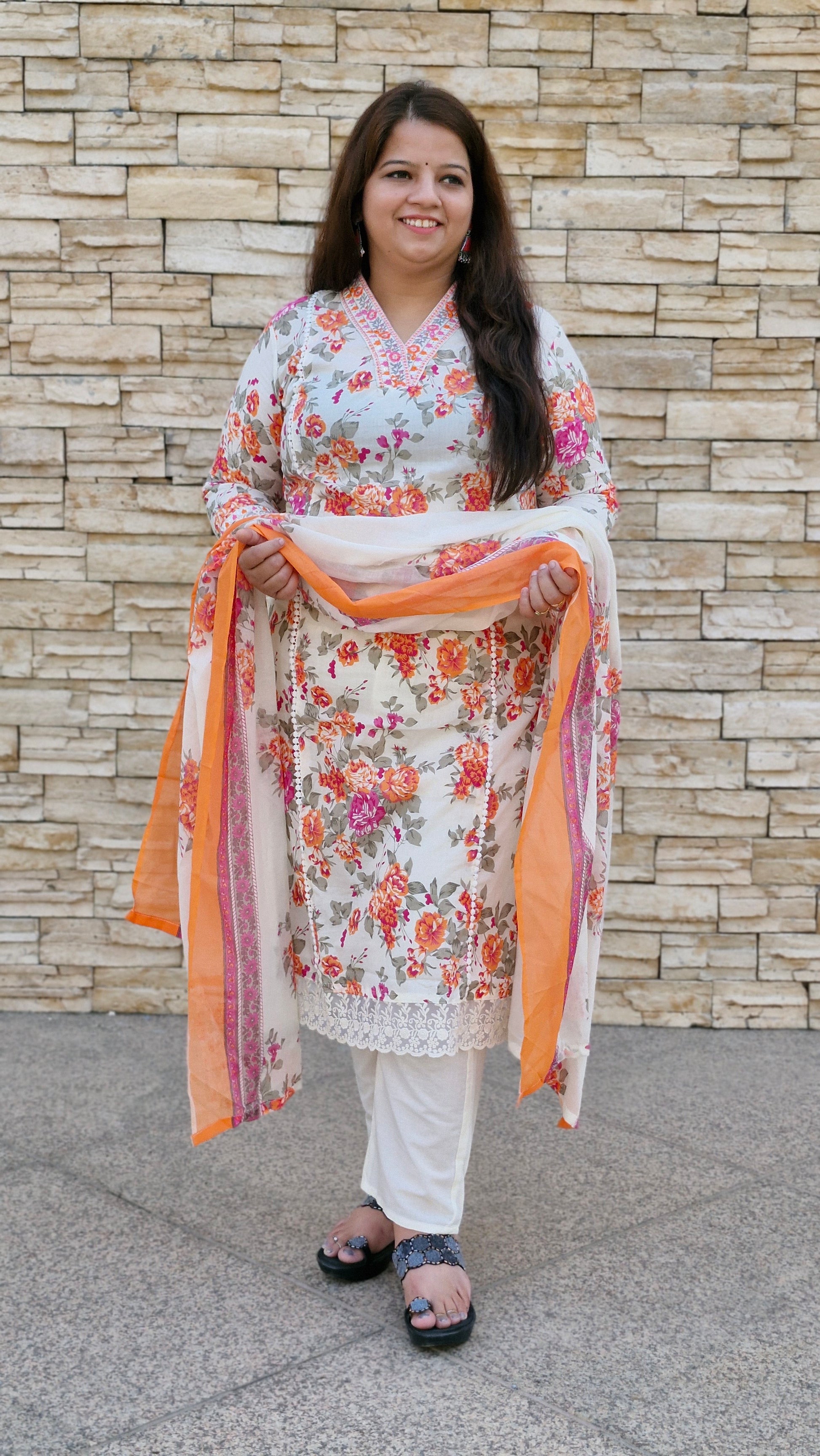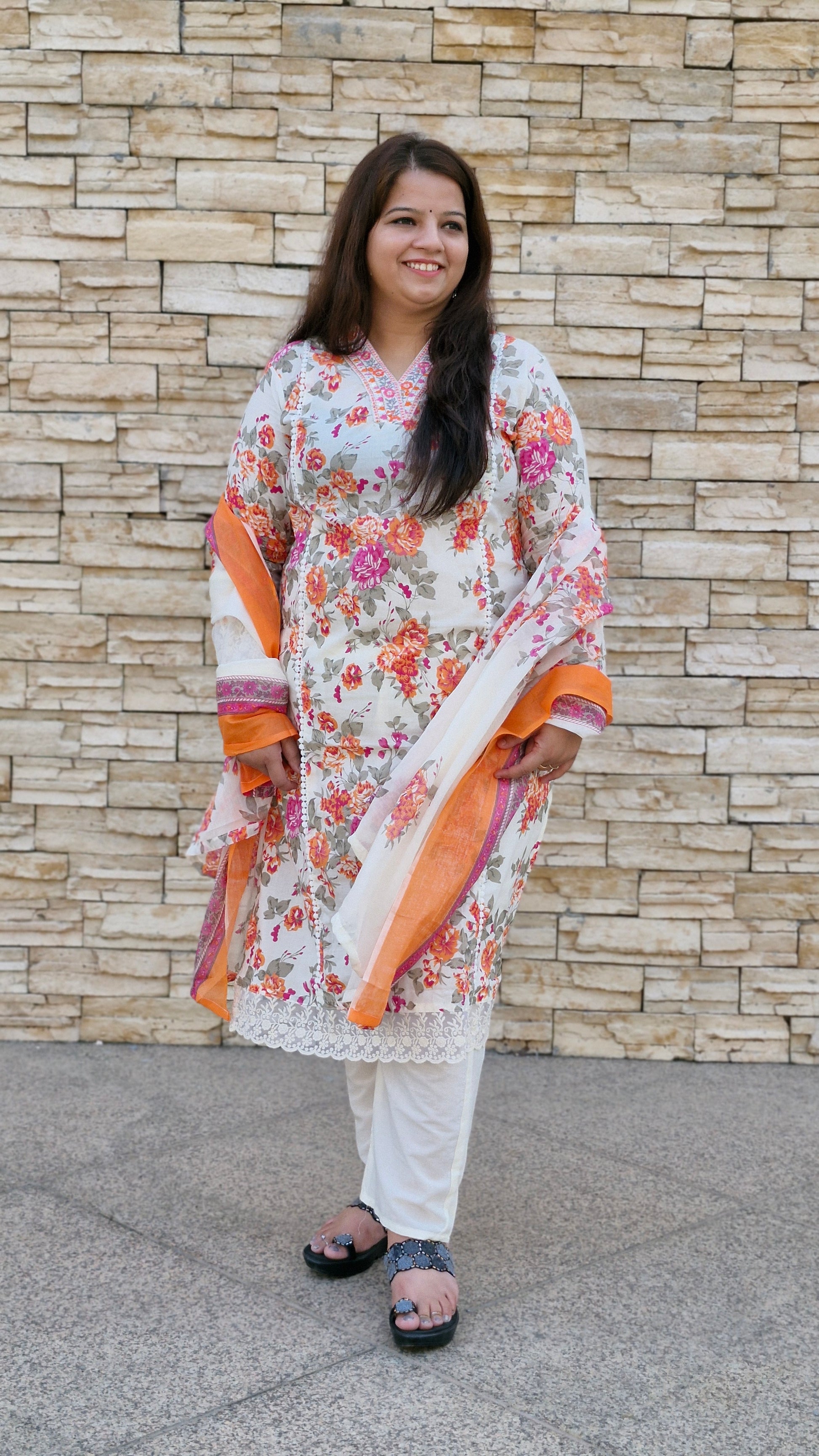 Catch everyone's eye in this lovely floral number! Our three-piece suit set in a creamy white base is bursting with cheerful Peach, Orange, and Pink blooms.